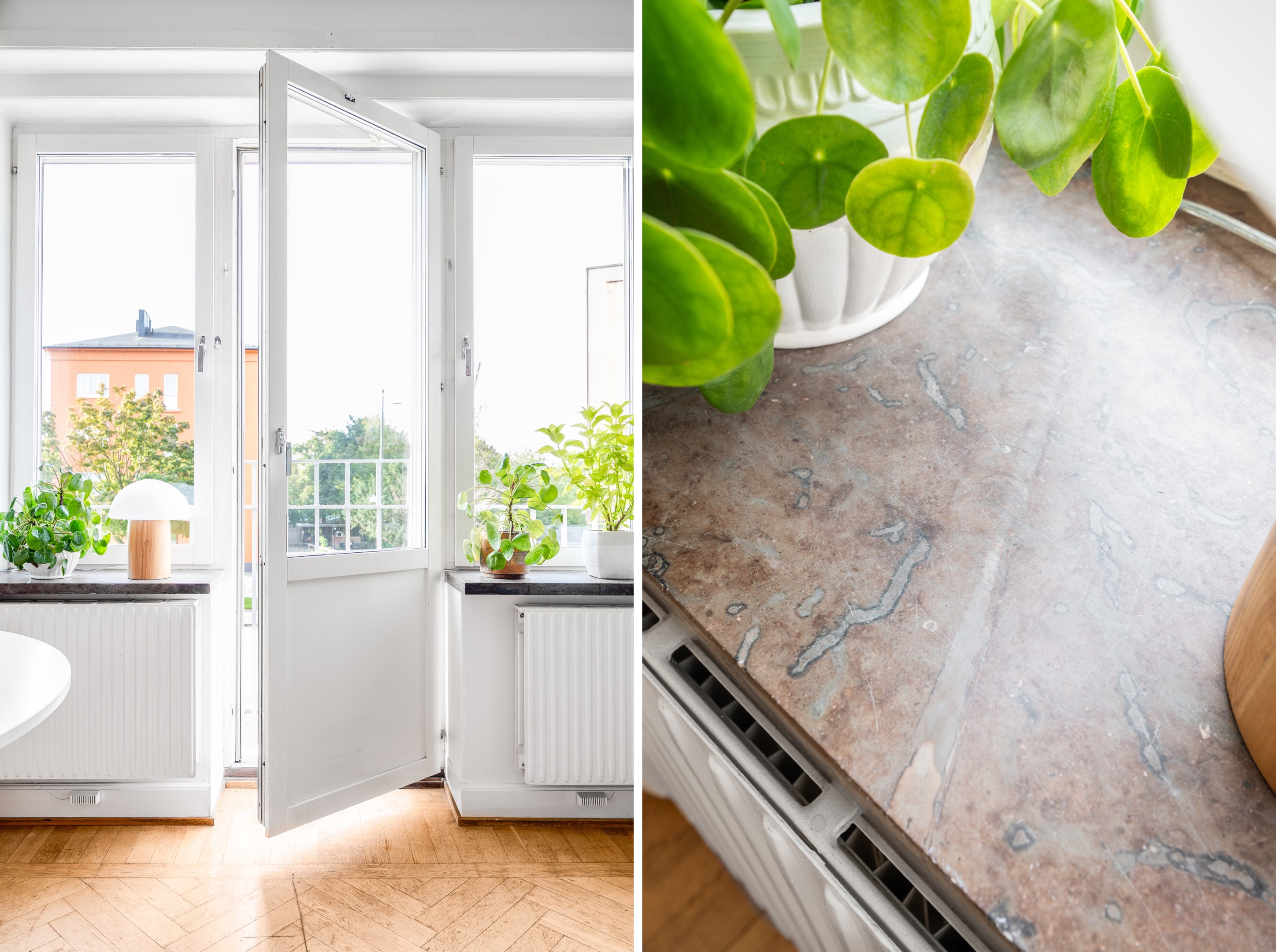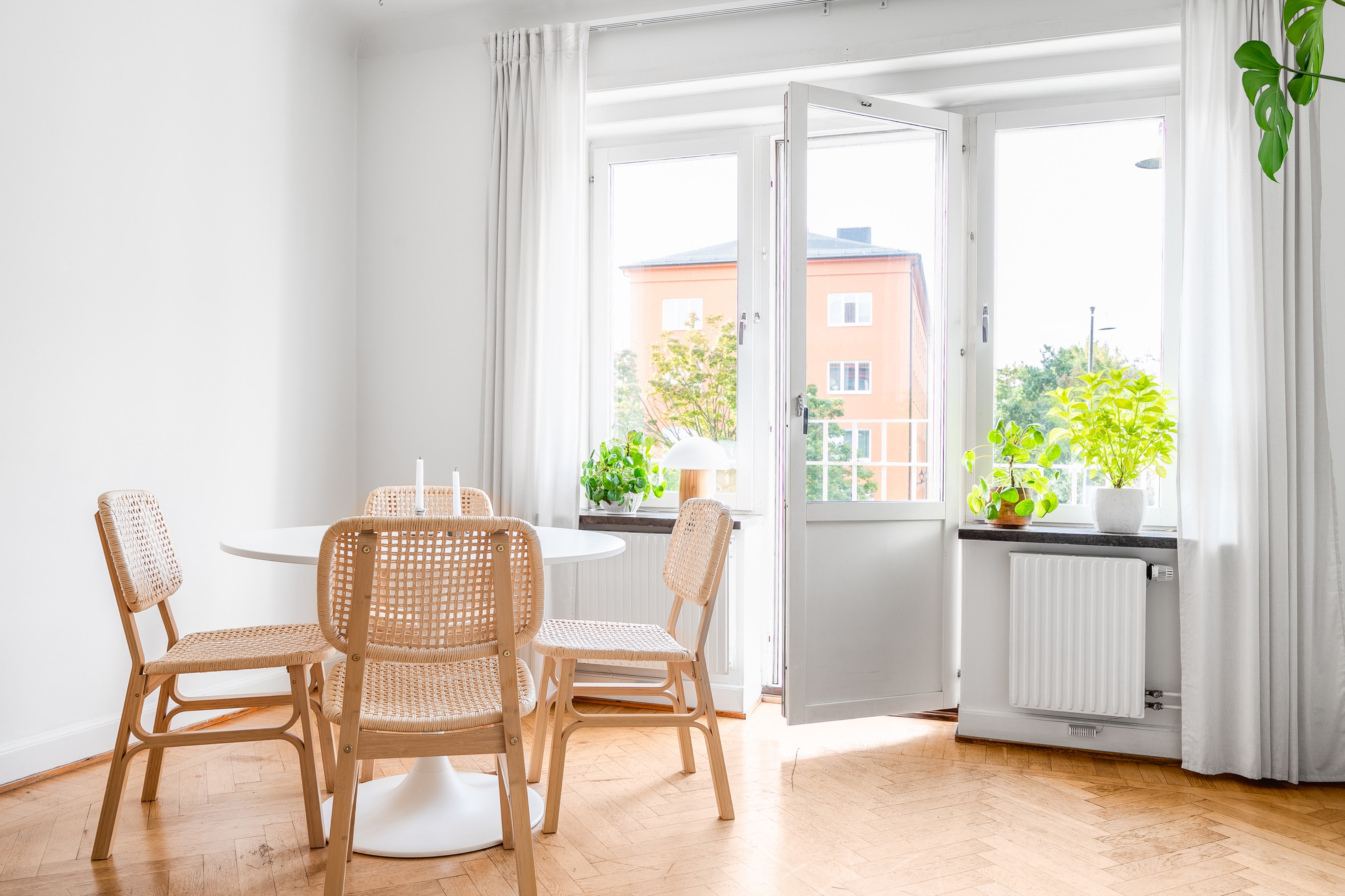 Vardagsrummet är ljust och charmigt med vackra originaldetaljer. Här ligger en klassisk fiskbensparkett och rummet får ett generöst ljusinsläpp från stora fönster och en fransk balkongdörr. Den öppna planlösningen mot köket skapar en social och trivsam känsla. Det finns gott om plats för både soffa, tv-möbel och matbord.