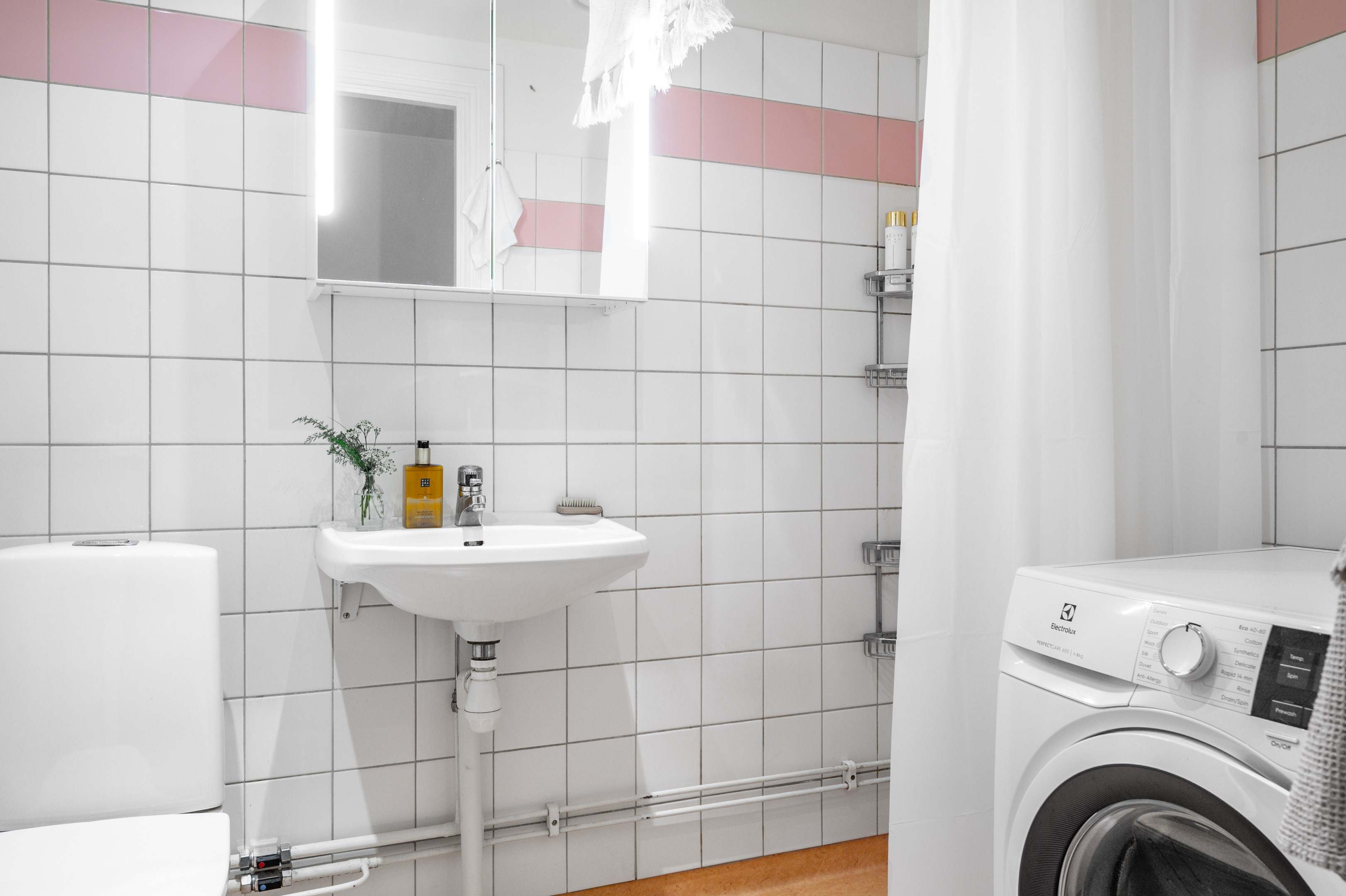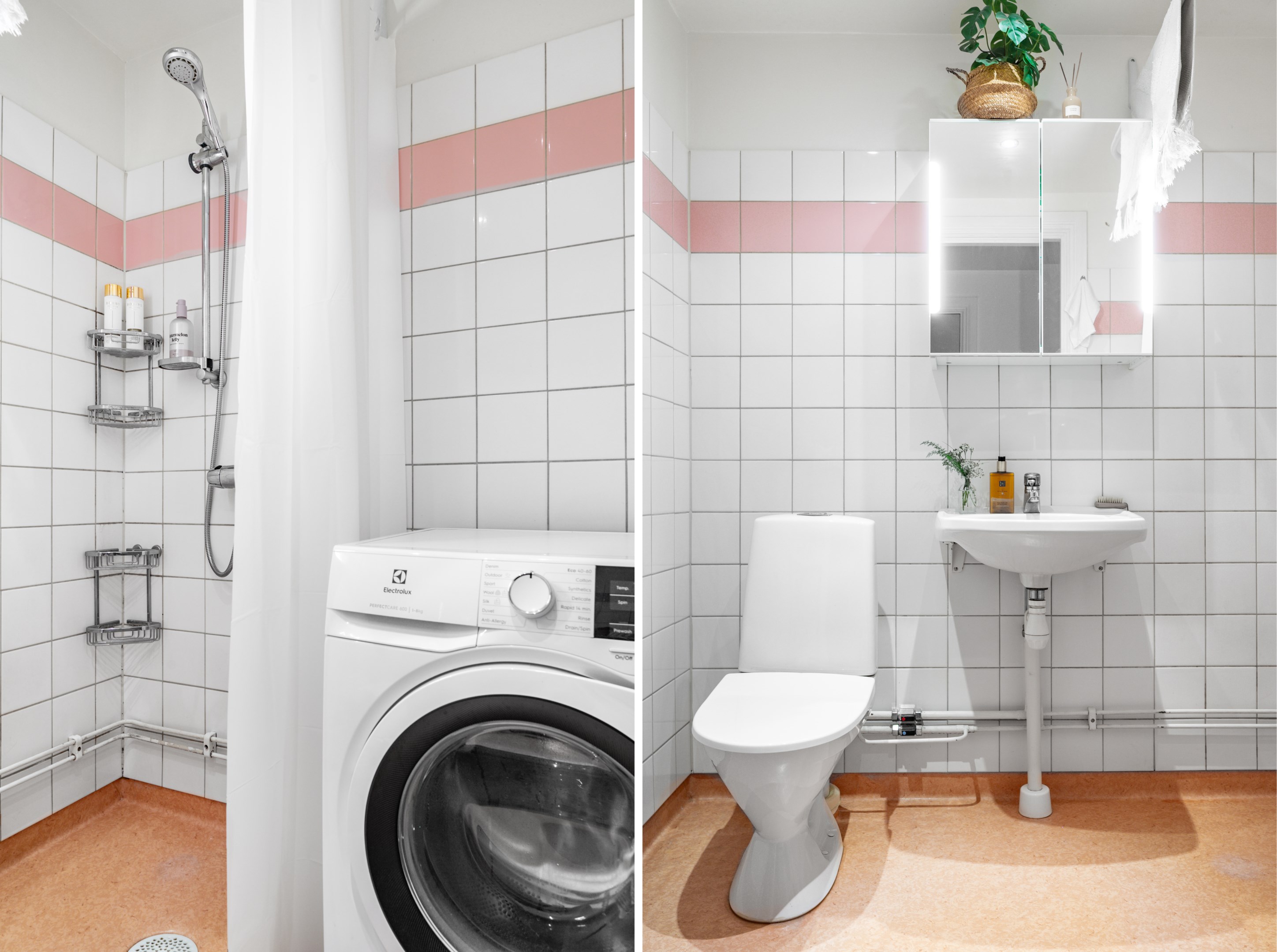Från hallen når vi badrummet, som är helkaklat i vitt och utrustat med vask, wc, spegelskåp med belysning samt dusch. Här finns även en tvättmaskin för ökad bekvämlighet.