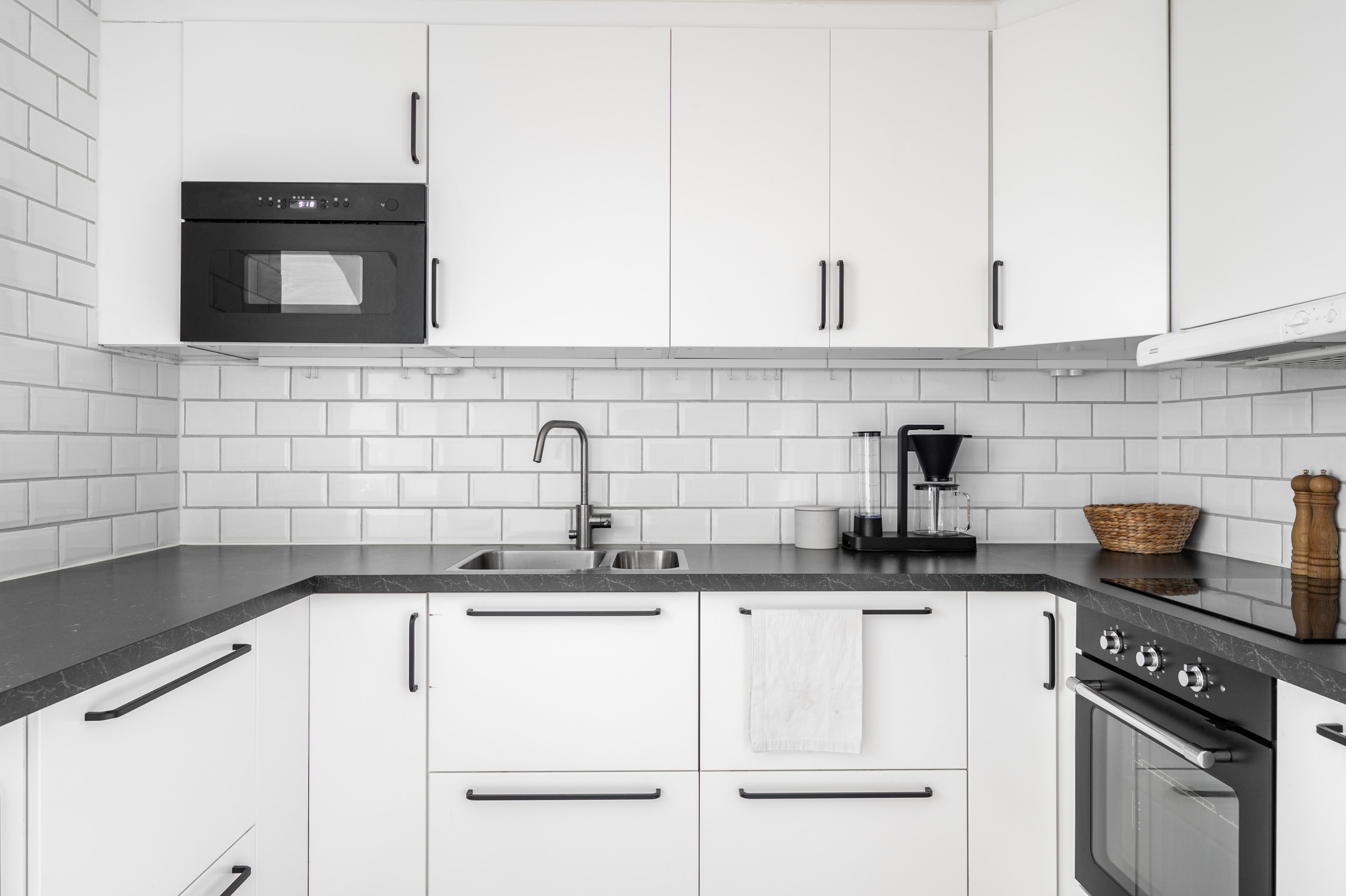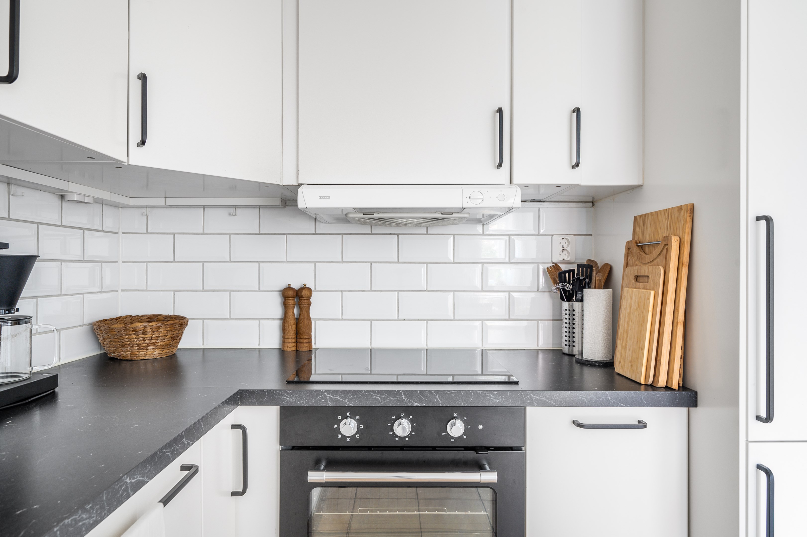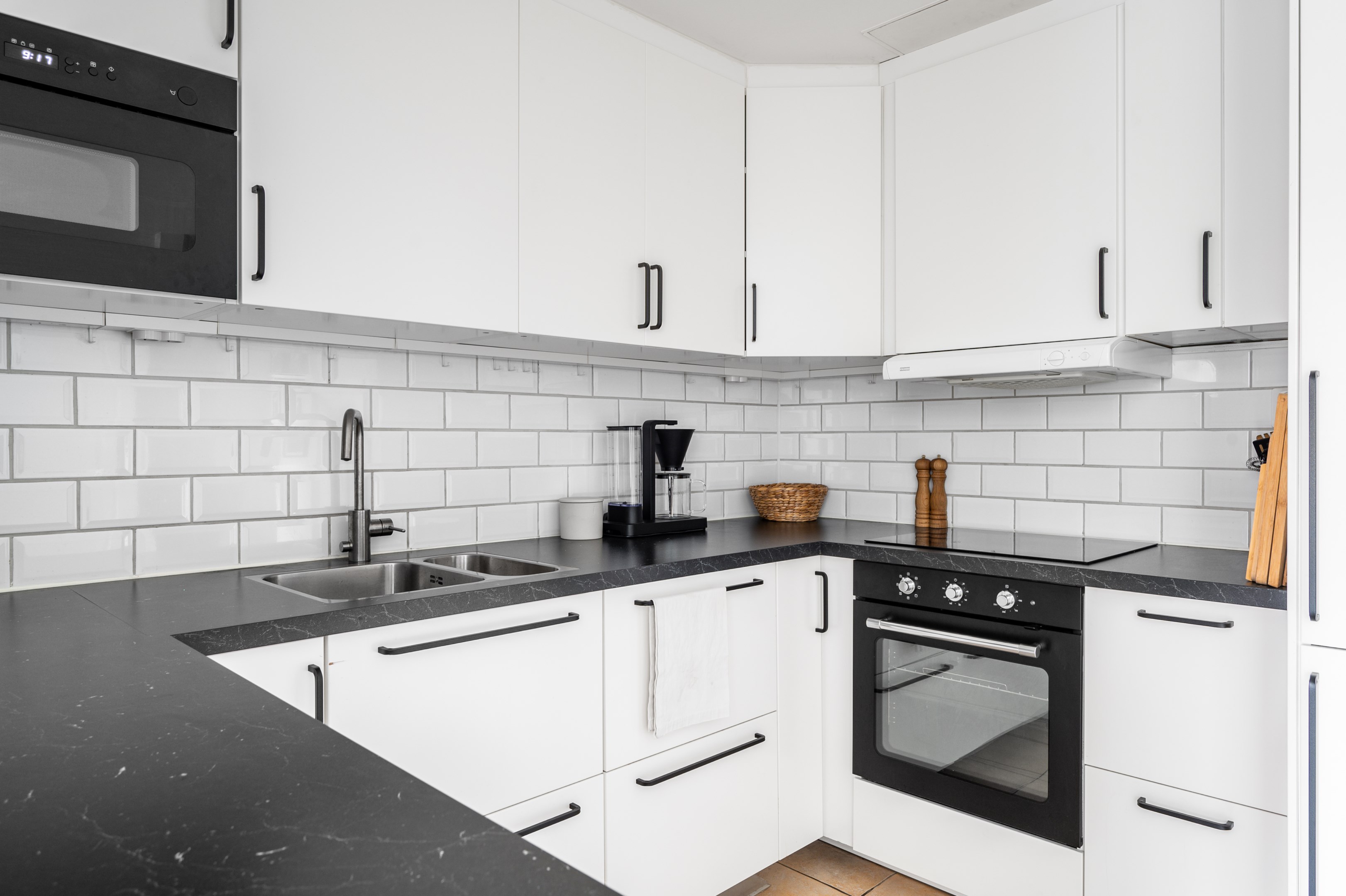 Köket har en modern och stilren karaktär med vita skåp och en mörk laminatbänkskiva. Här finns gott om arbetsyta och förvaring. Utrustat med spis, fläkt, ugn, kyl/frys och mikrovågsugn. Det praktiska klinkergolvet bidrar med både funktion och en enhetlig stil.