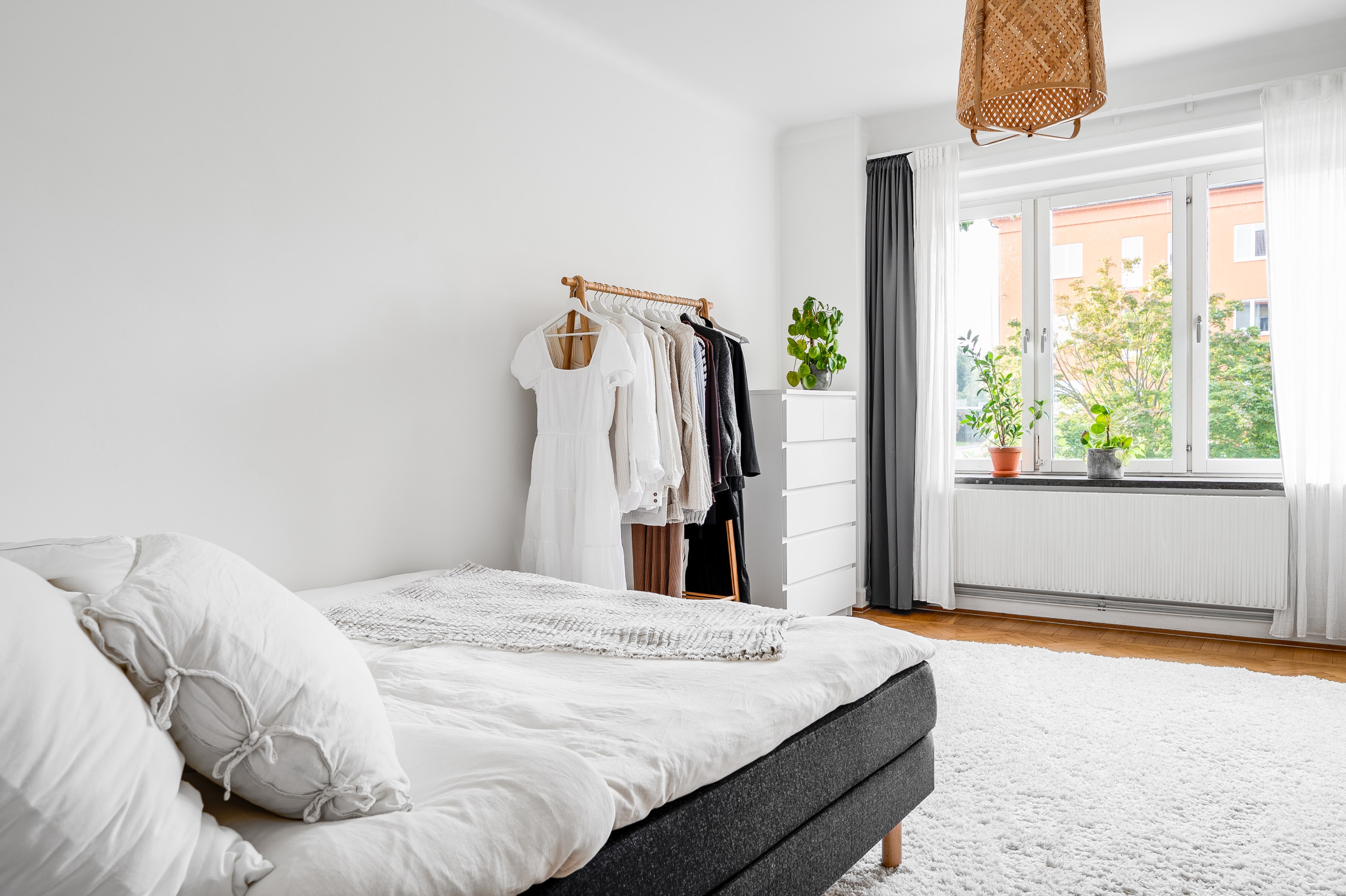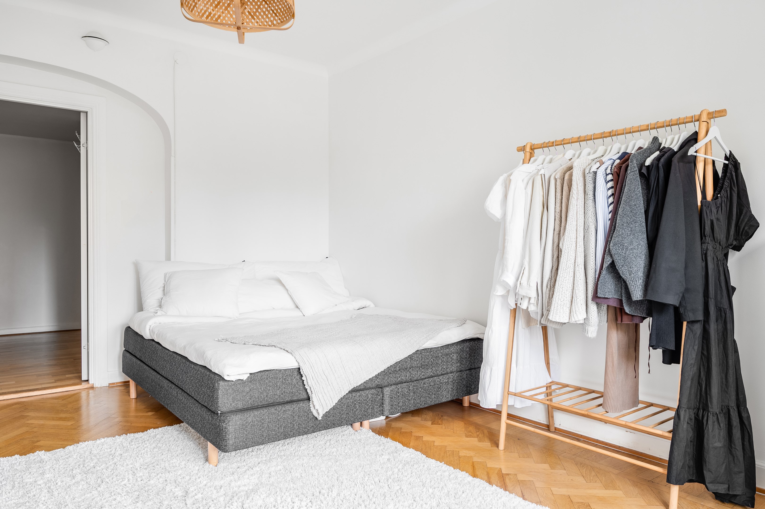 Sovrummet är stort och luftigt med generöst ljusinsläpp. Här finns ljusa väggar, ett fint golv och gott om plats för dubbelsäng med sängbord, skrivbord samt extra förvaring om så önskas.