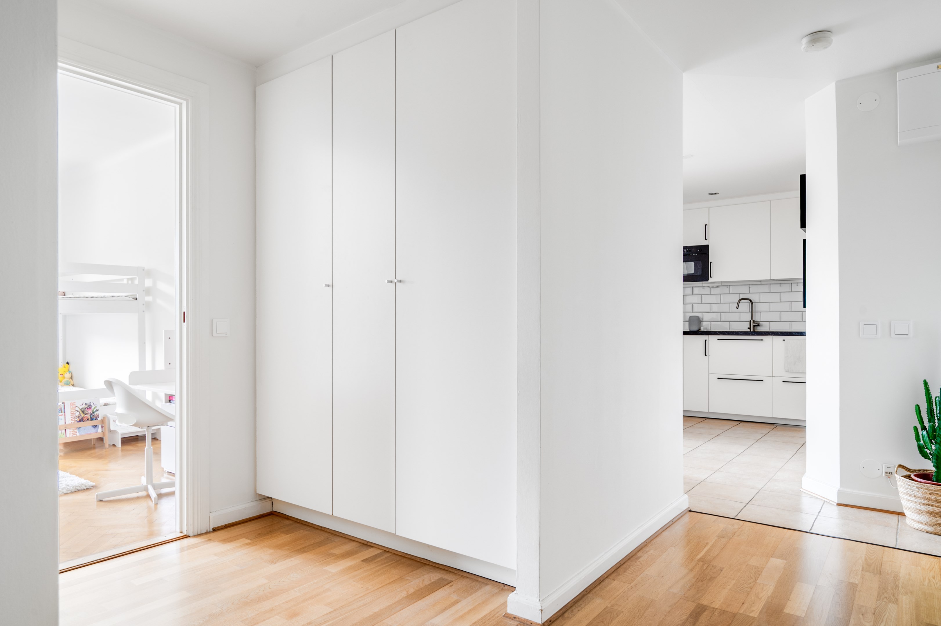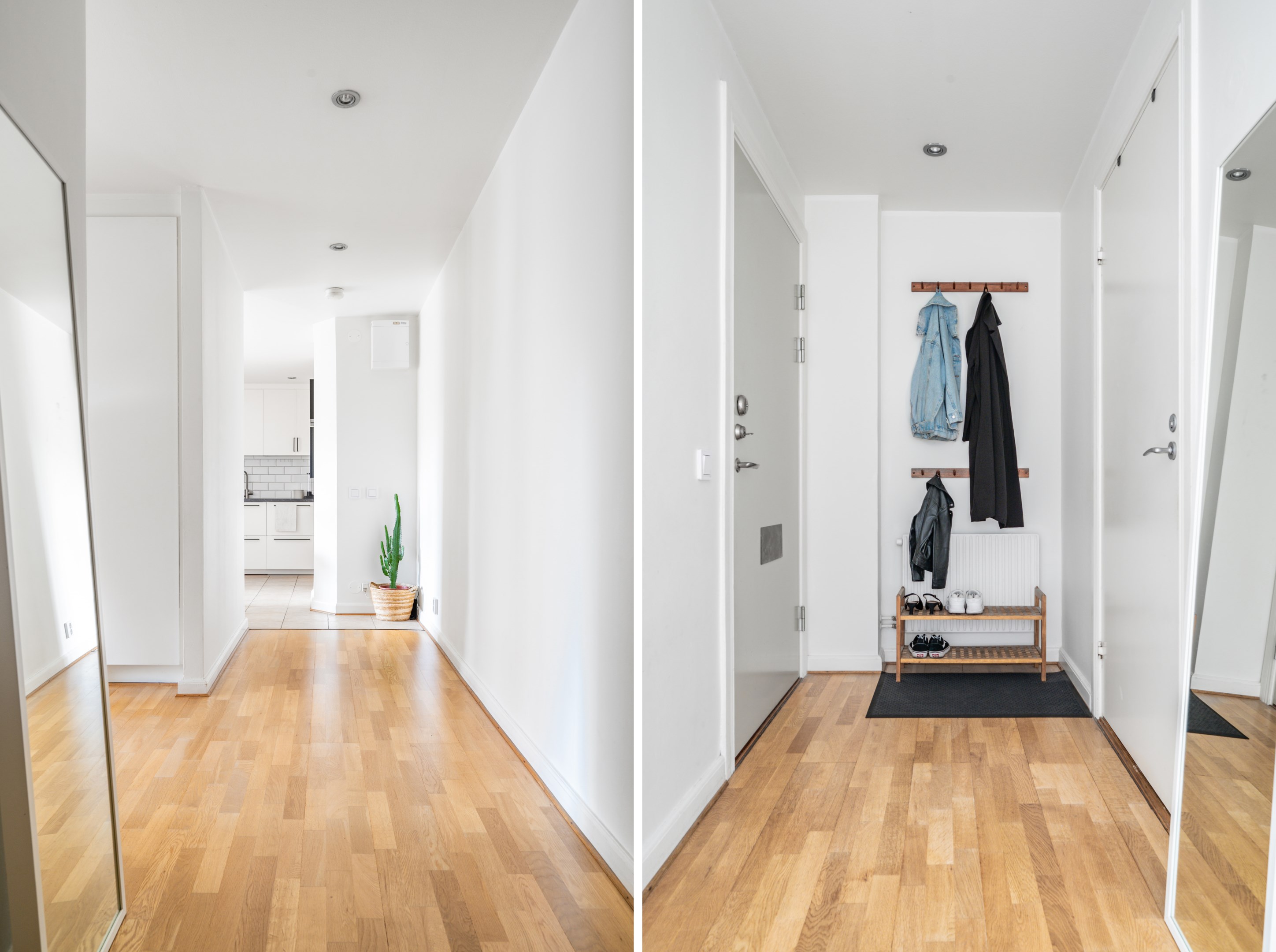 Vi tar hissen upp till andra våningen och välkomnas av en ljus hall med vita väggar och trestavsparkett. Här finns plats för ytterkläder och spegel.