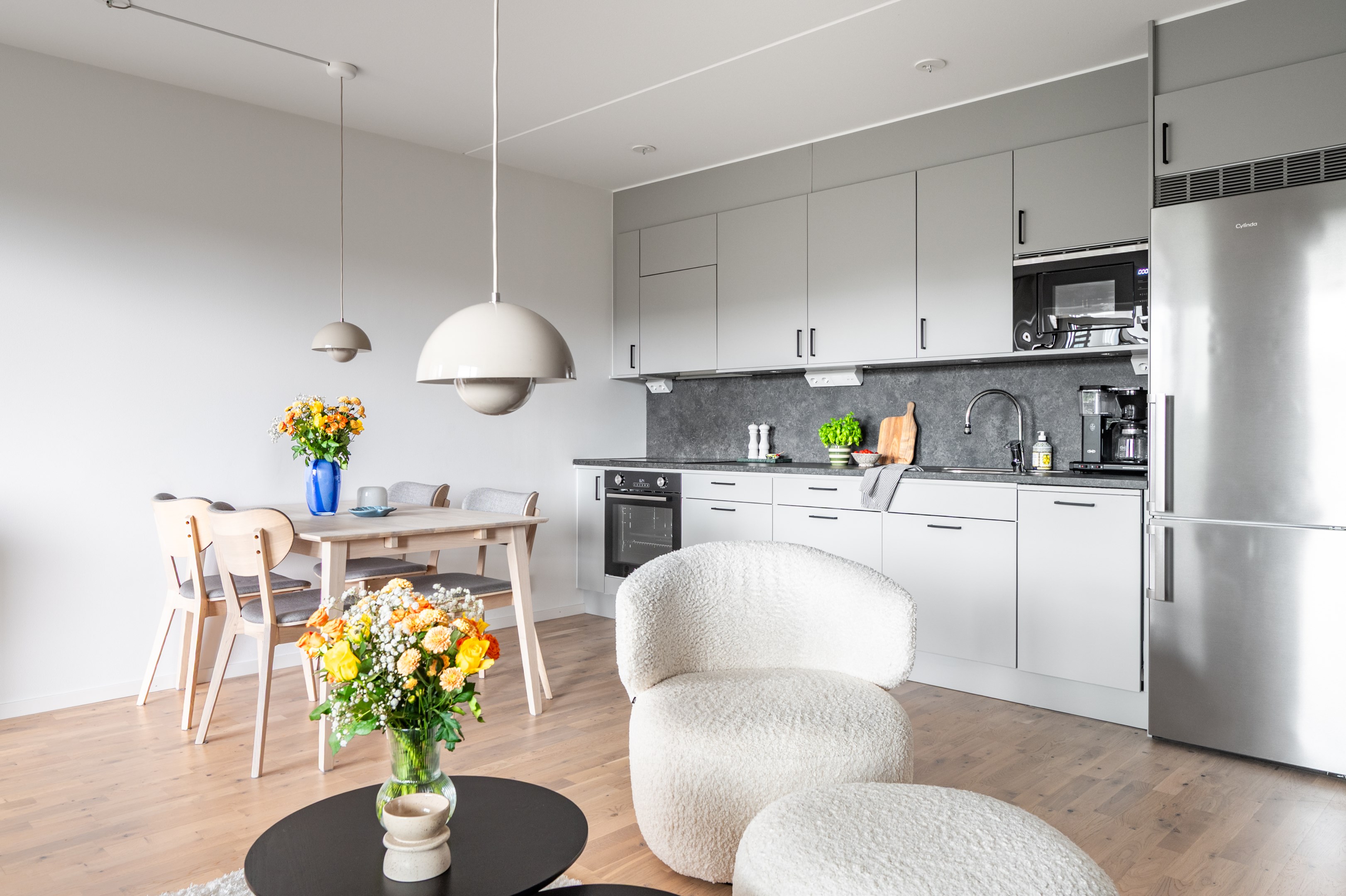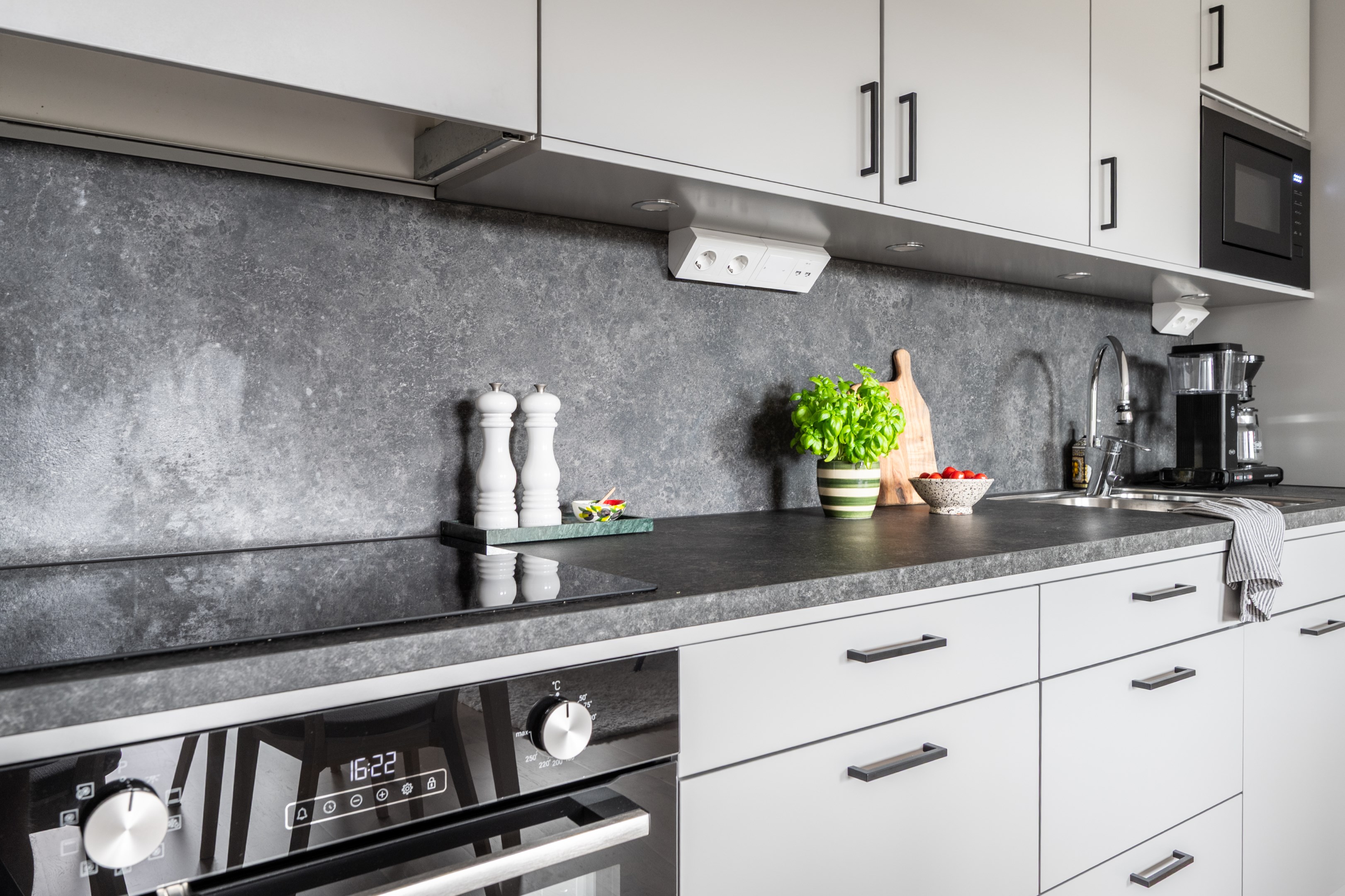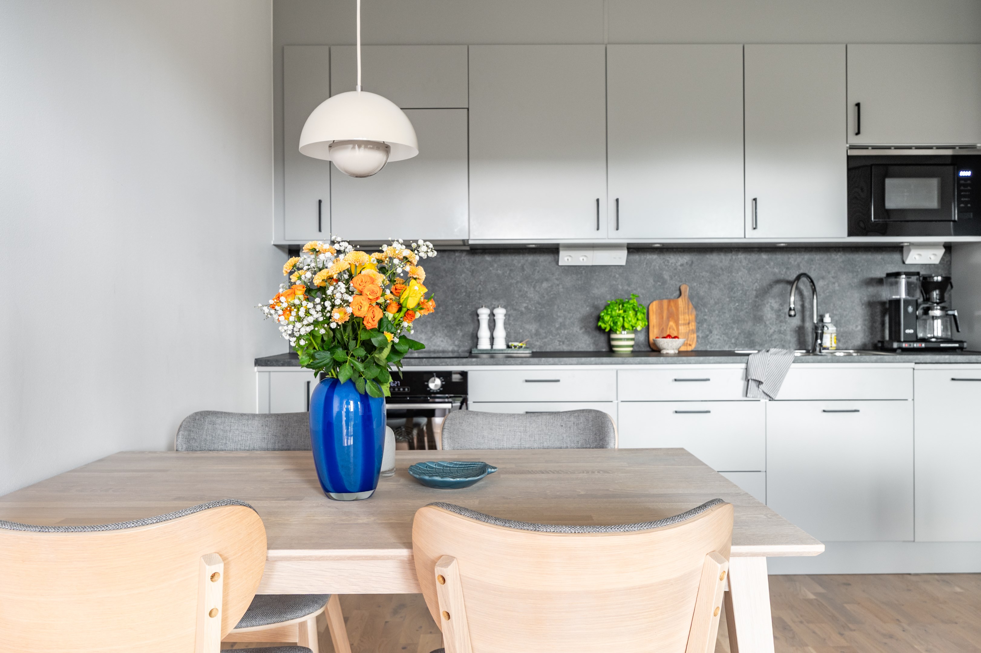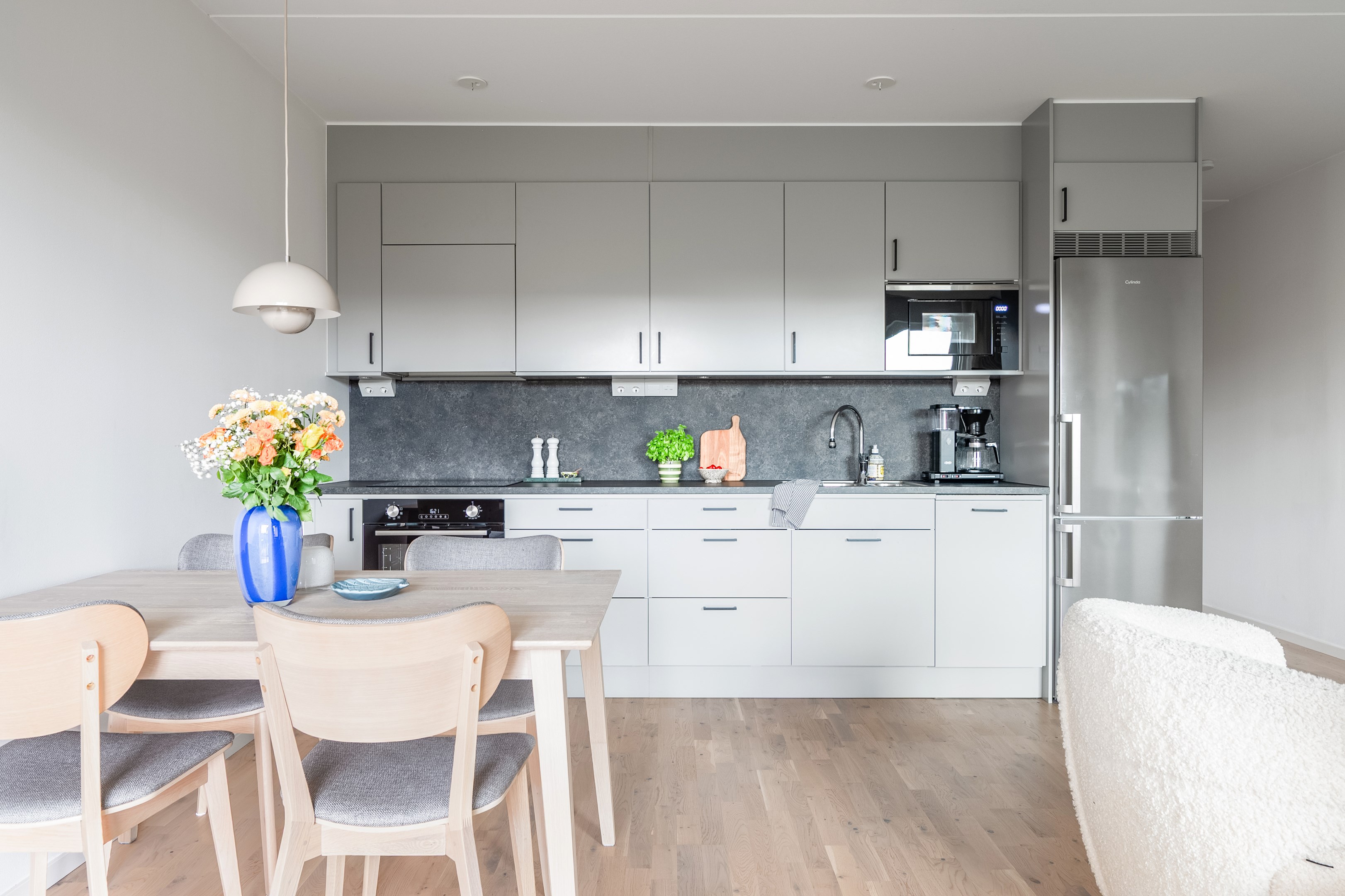I öppen planlösning mot vardagsrummet ligger det stilrena och moderna köket från Vedum. Köket är smakfullt inrett med grå skåpsluckor och svarta beslag som tillsammans med den matchande grå laminatbänkskivan ger ett elegant och tidlöst intryck. Här finns all maskinell utrustning du kan tänkas behöva - kyl/frys, integrerad diskmaskin, spis, ugn och mikro - samt belysning ovan arbetsytorna för både funktion och stämning.