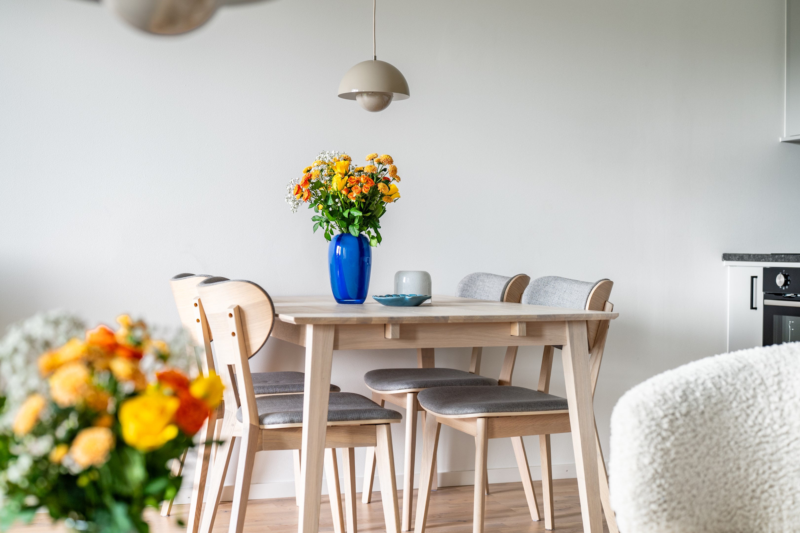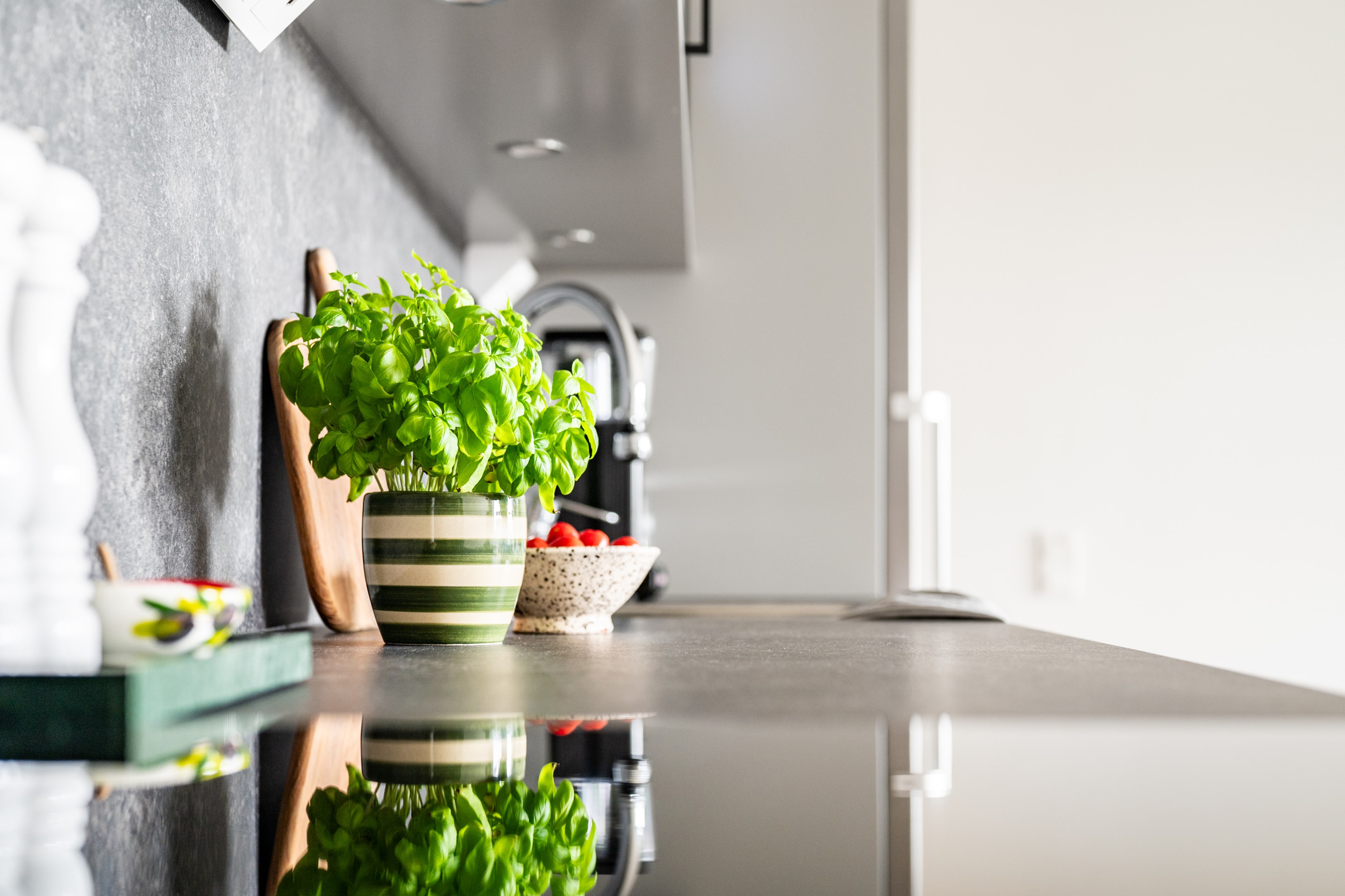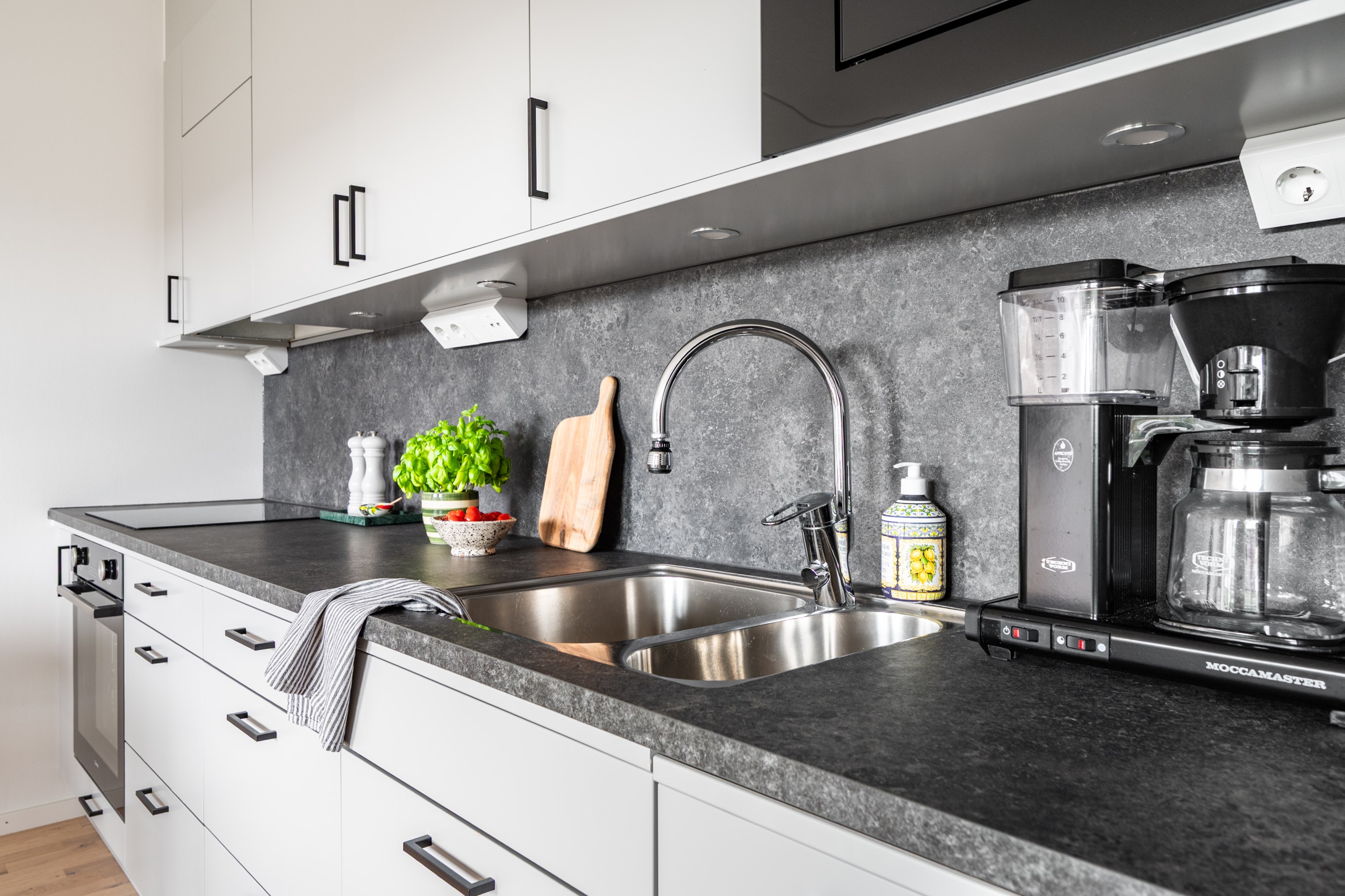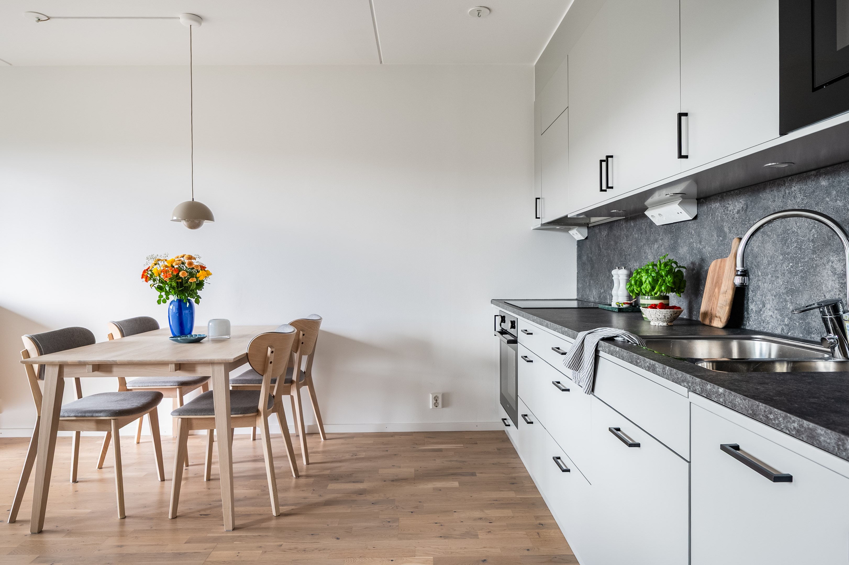 I öppen planlösning mot vardagsrummet ligger det stilrena och moderna köket från Vedum. Köket är smakfullt inrett med grå skåpsluckor och svarta beslag som tillsammans med den matchande grå laminatbänkskivan ger ett elegant och tidlöst intryck. Här finns all maskinell utrustning du kan tänkas behöva - kyl/frys, integrerad diskmaskin, spis, ugn och mikro - samt belysning ovan arbetsytorna för både funktion och stämning.