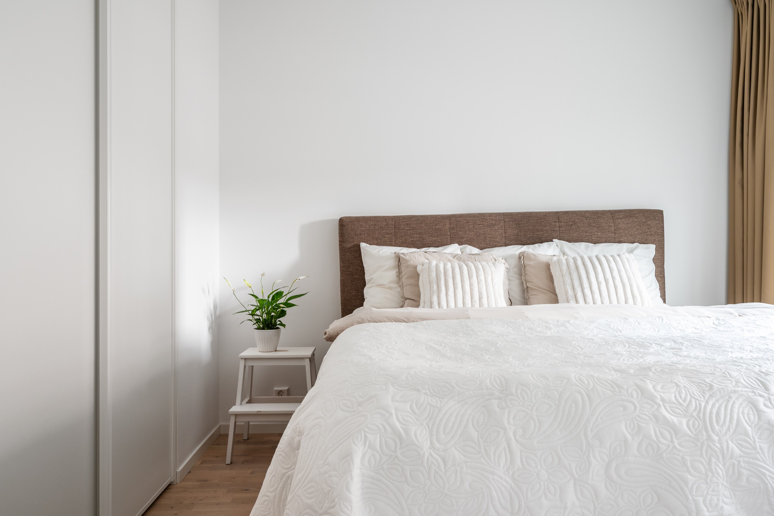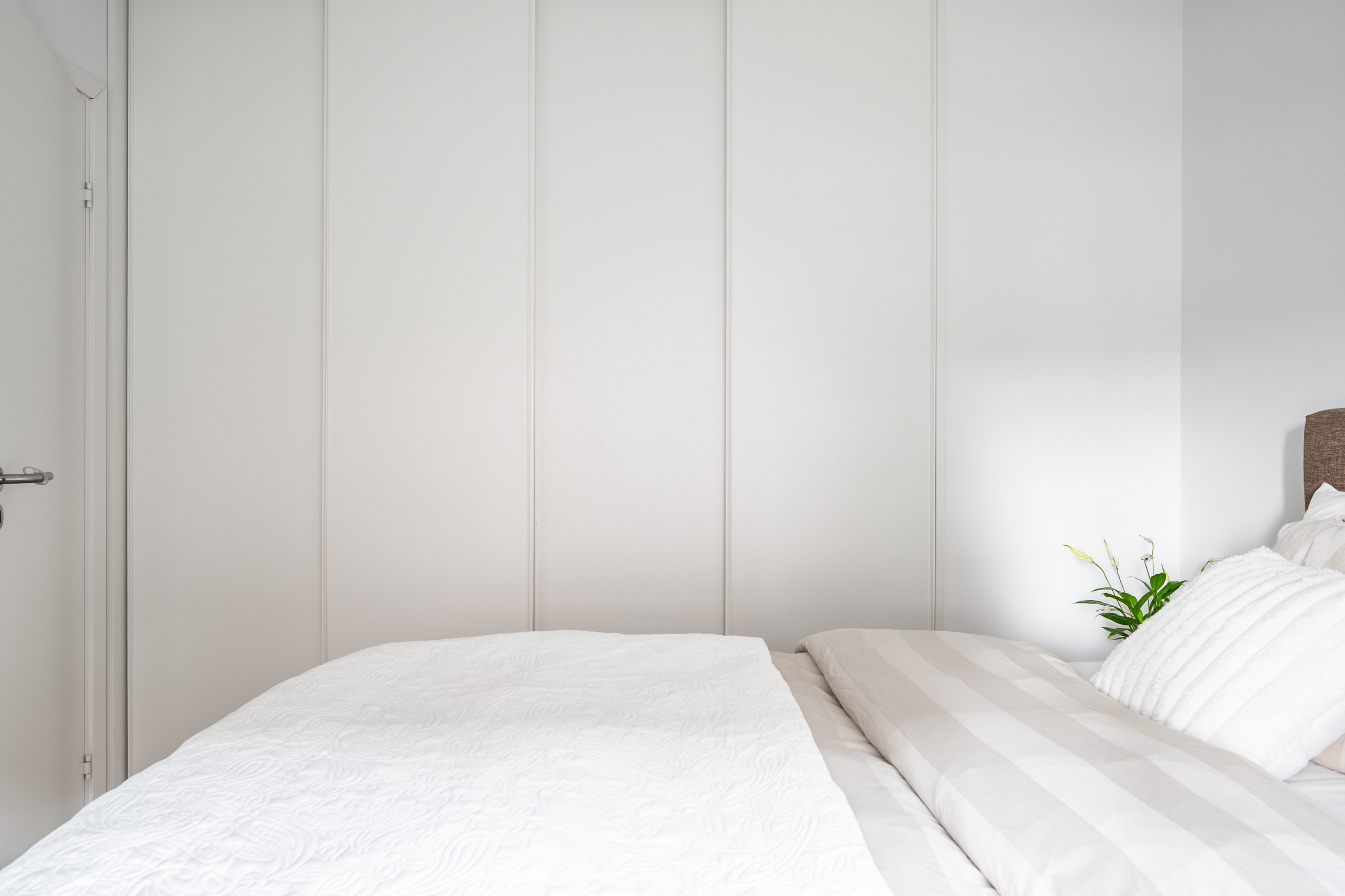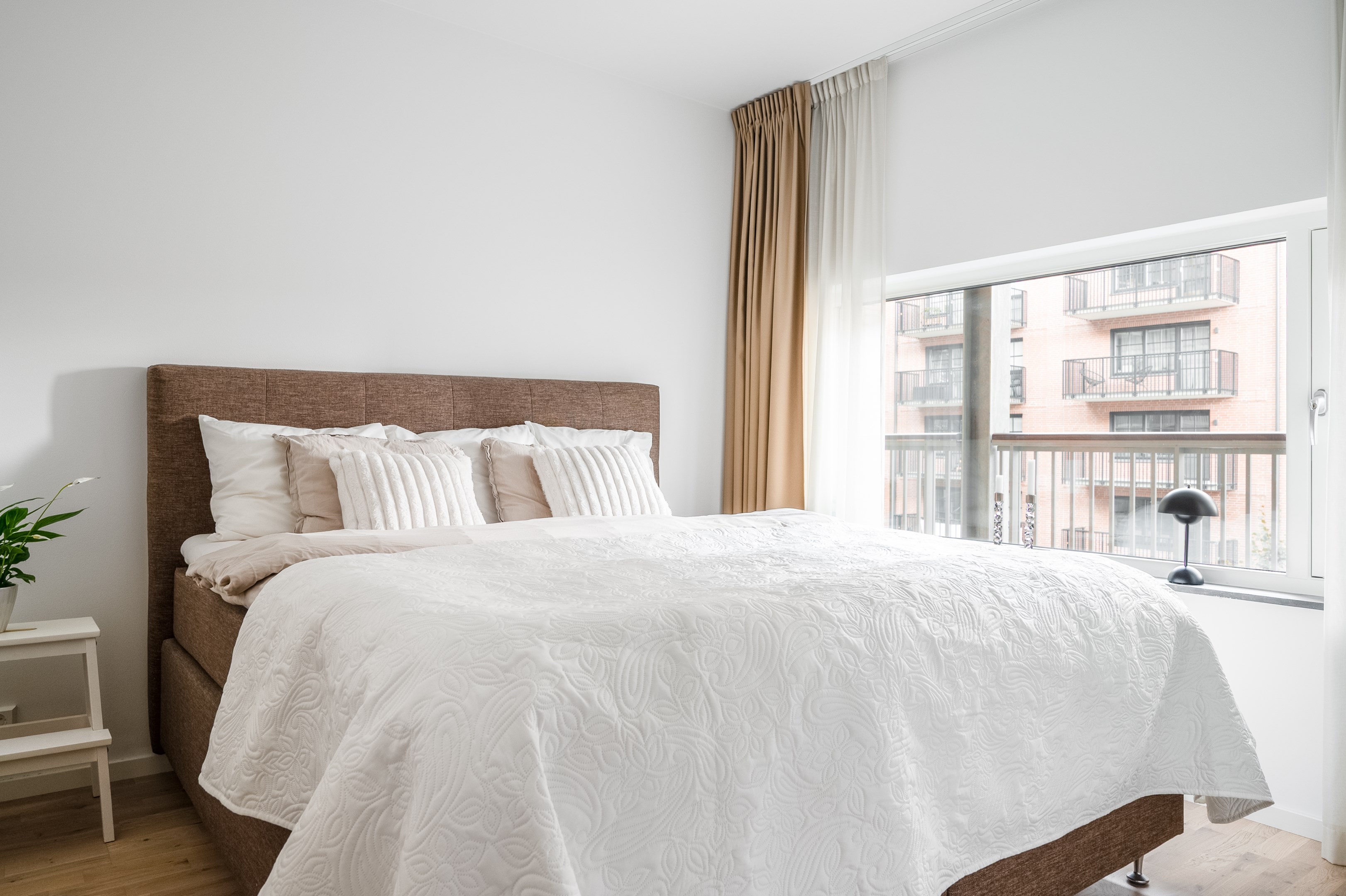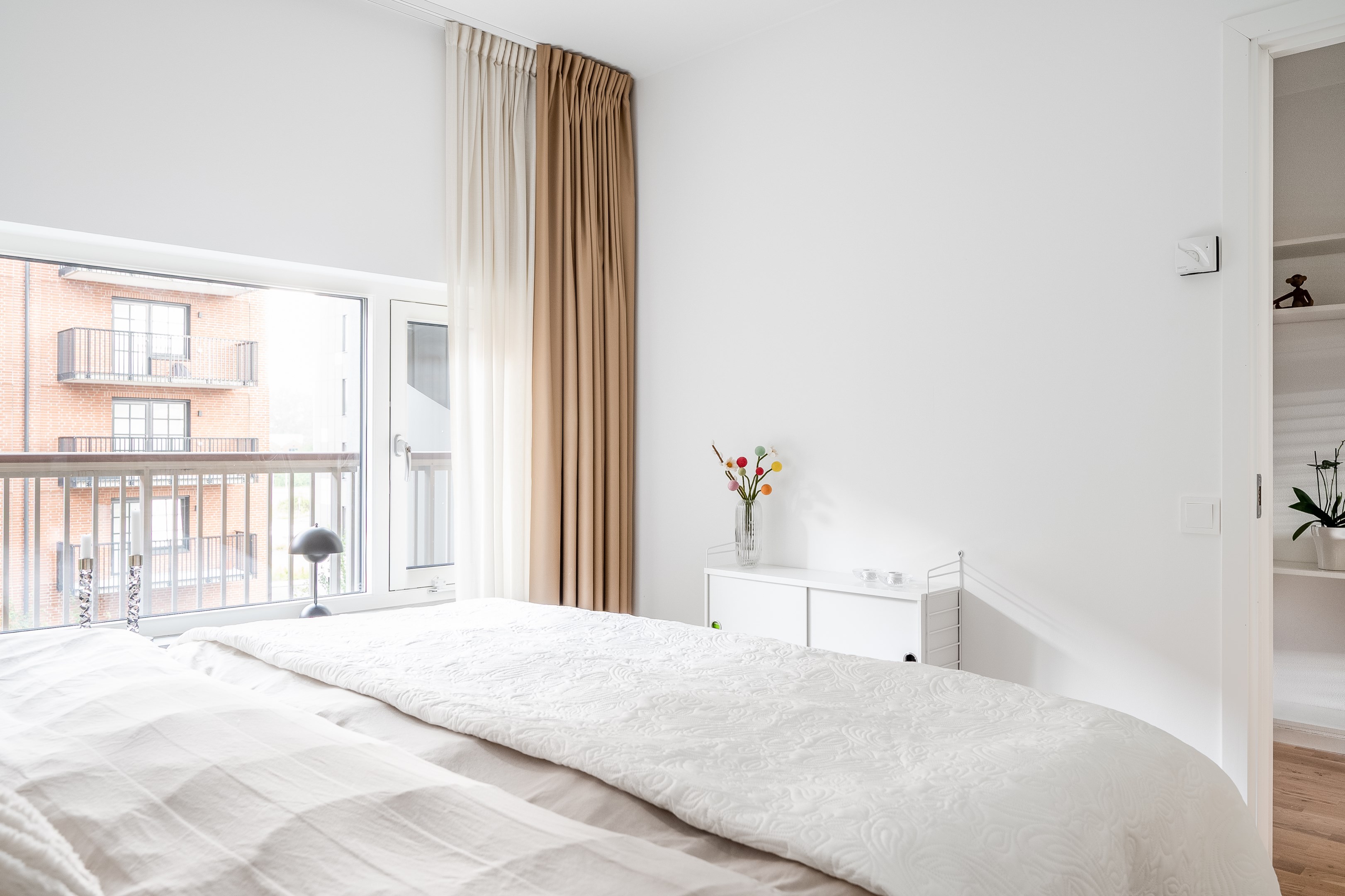 Sovrummet har plats för en dubbelsäng och sängbord och känns både funktionellt och ombonat. Längs ena väggen finns en praktisk skjutdörrsgarderob som erbjuder gott om förvaring och bidrar till en ren och stilren känsla. Ett fönster mot innergården ger ett fint ljusinsläpp och skapar en rofylld atmosfär.