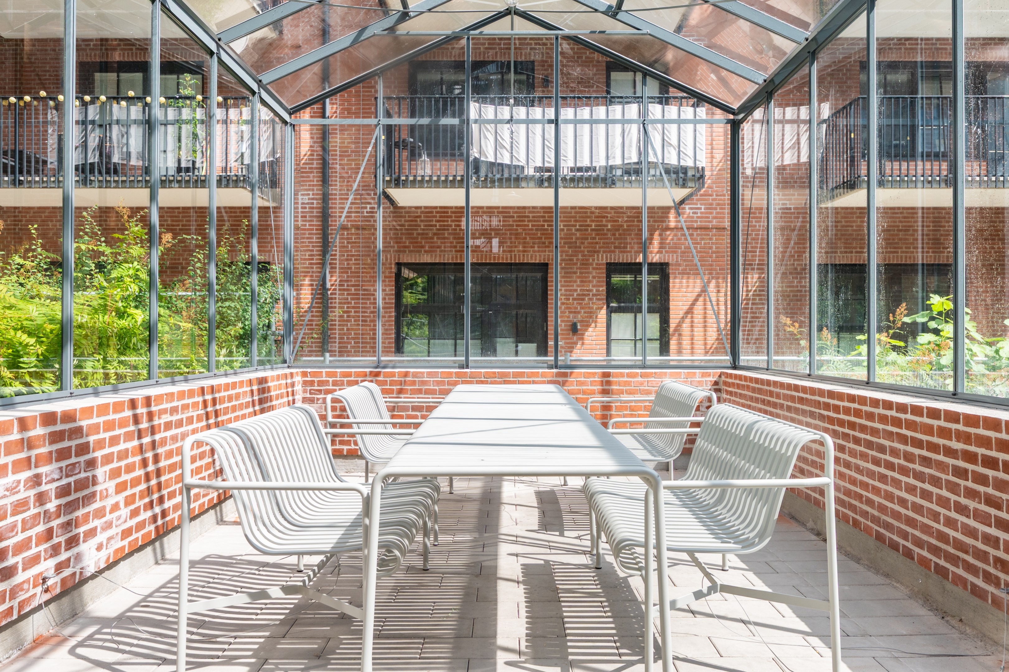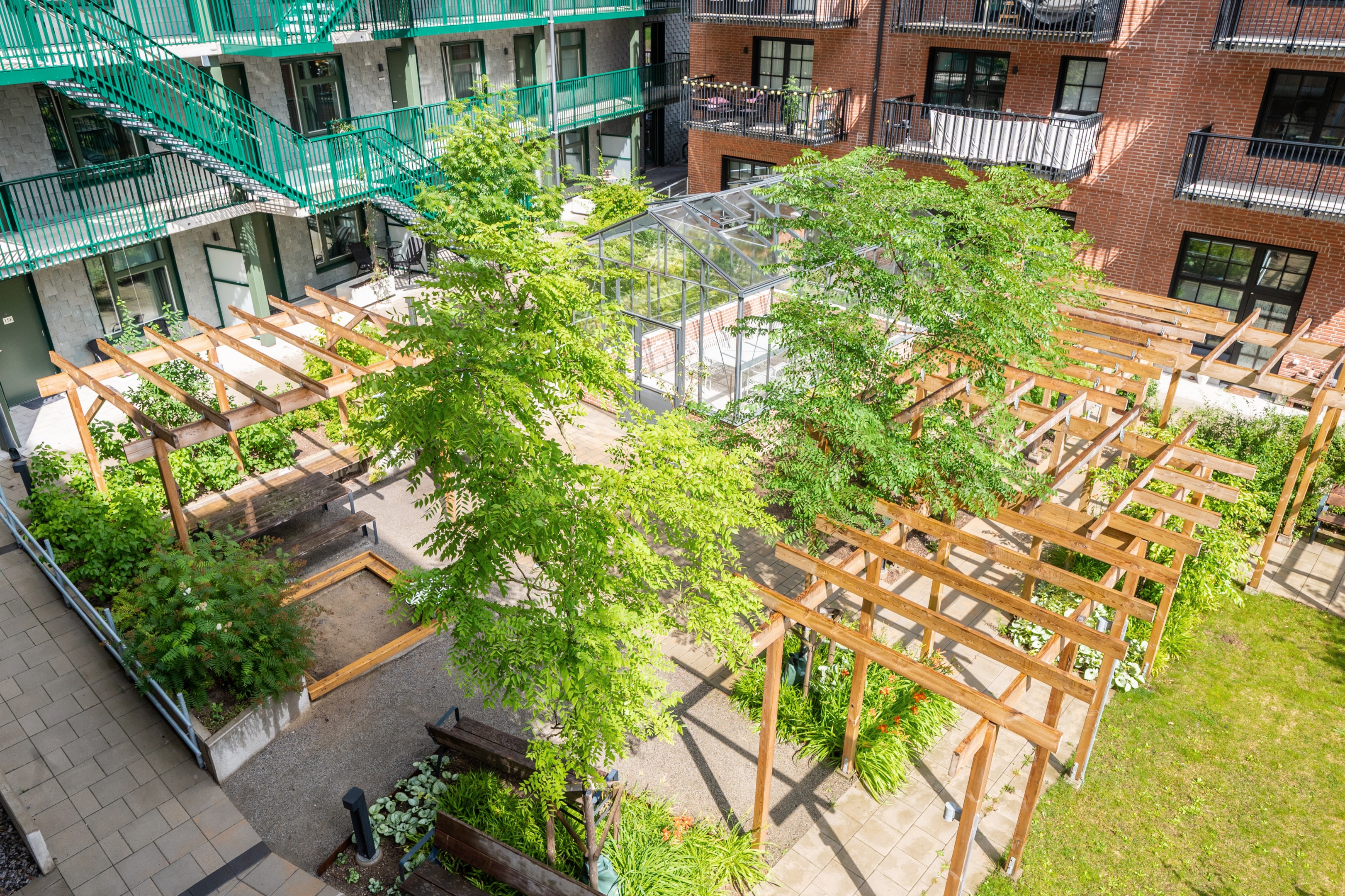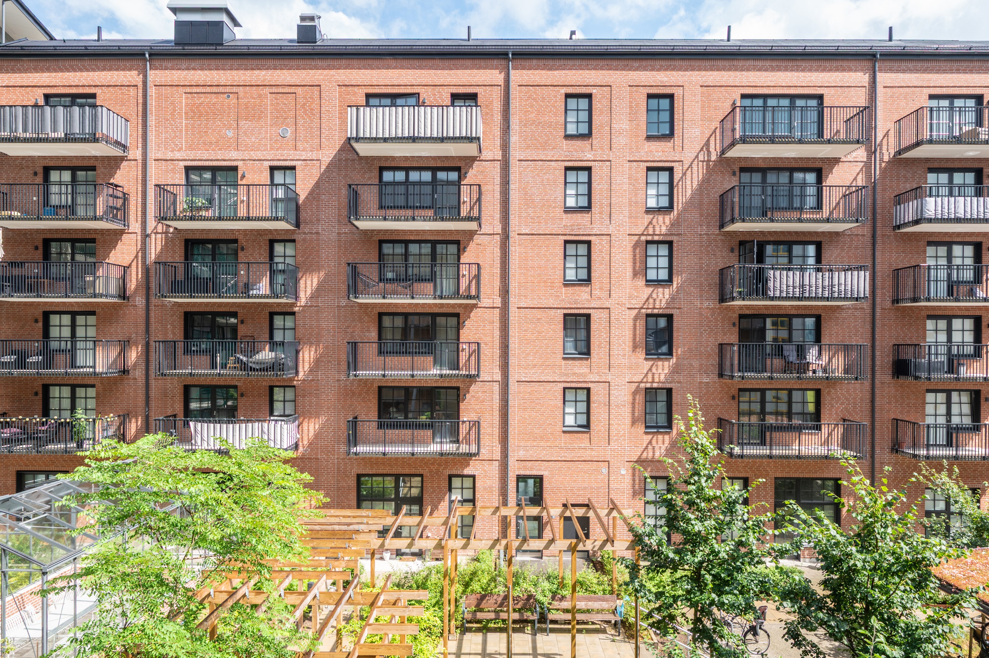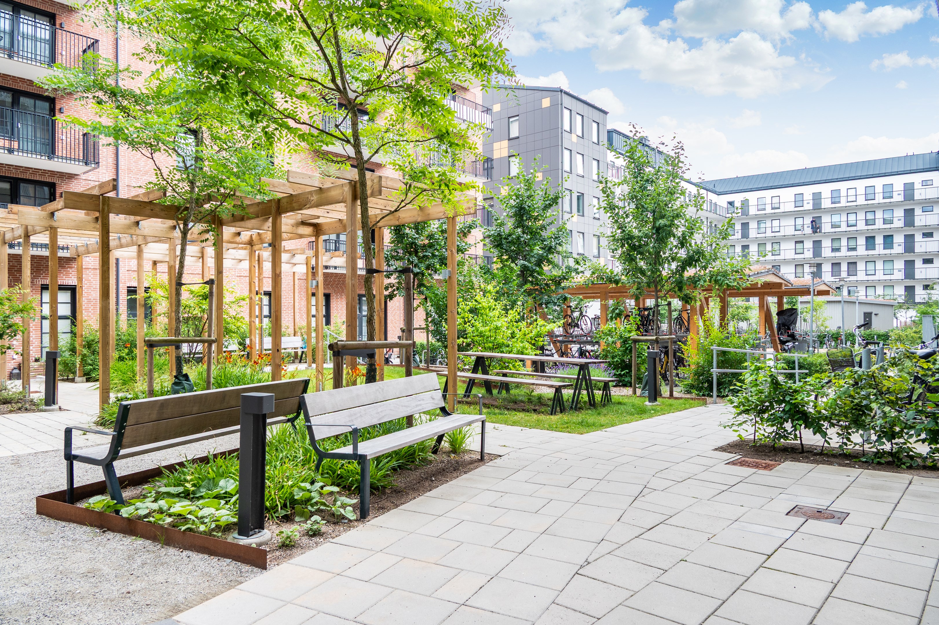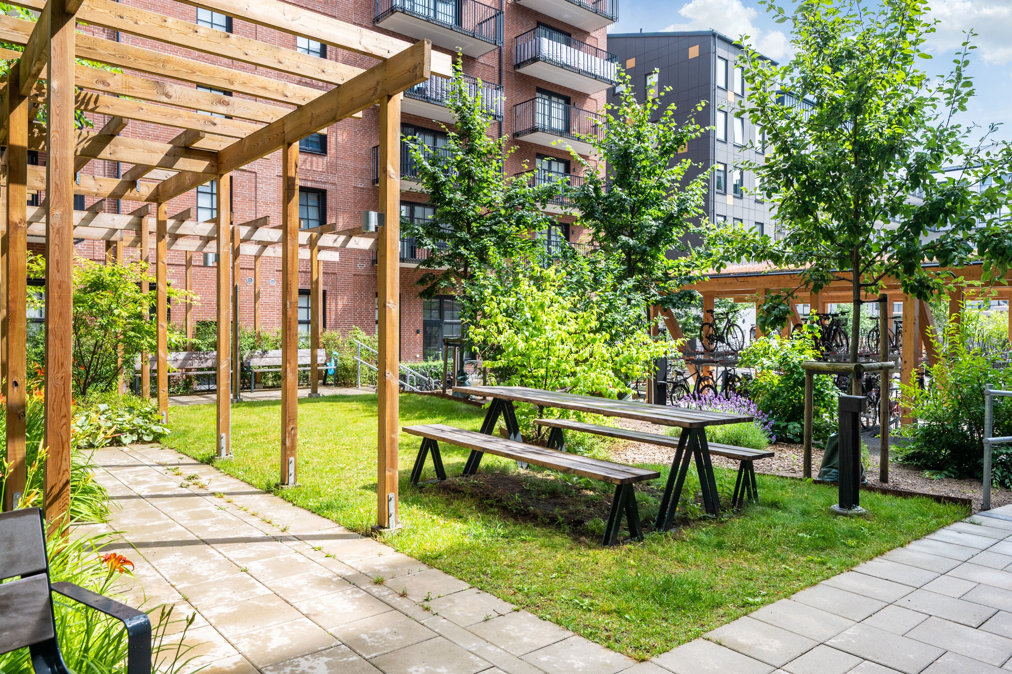 På den gemensamma gården finns ett orangeri men intilliggande grillplats. Cykelställ finns på gården samt i loftgångarna.