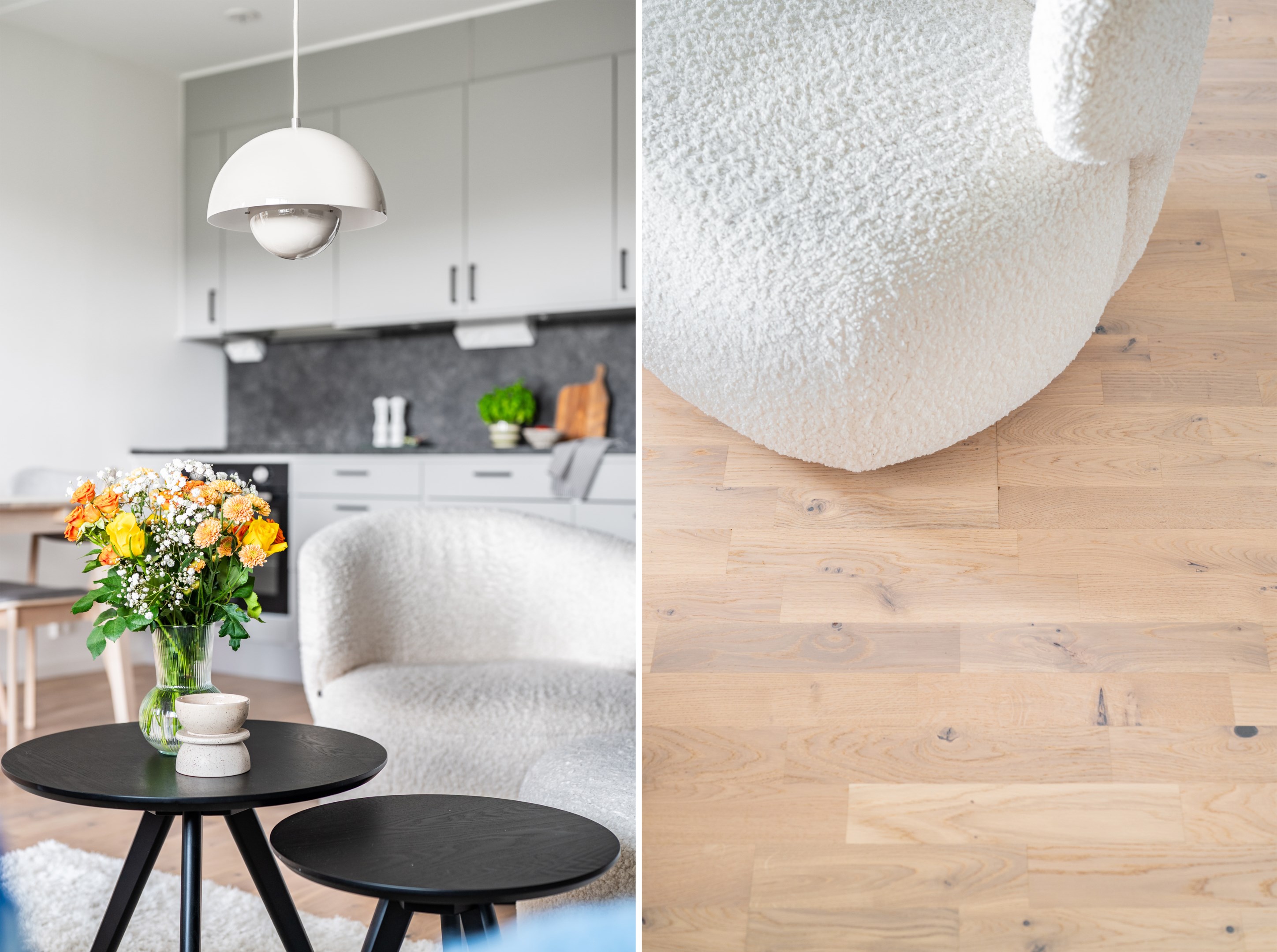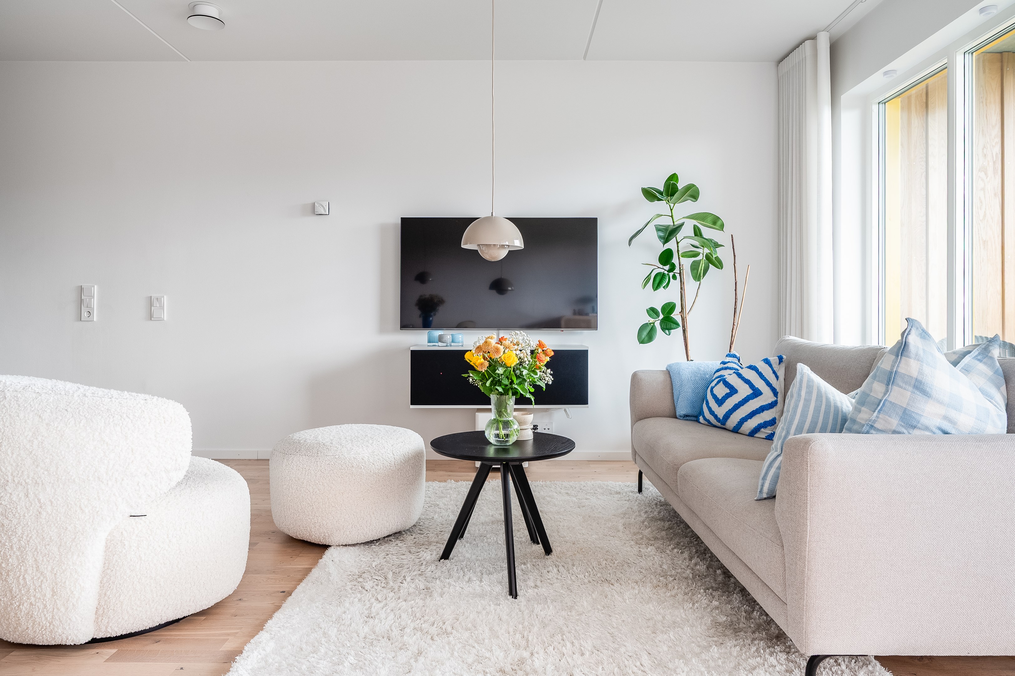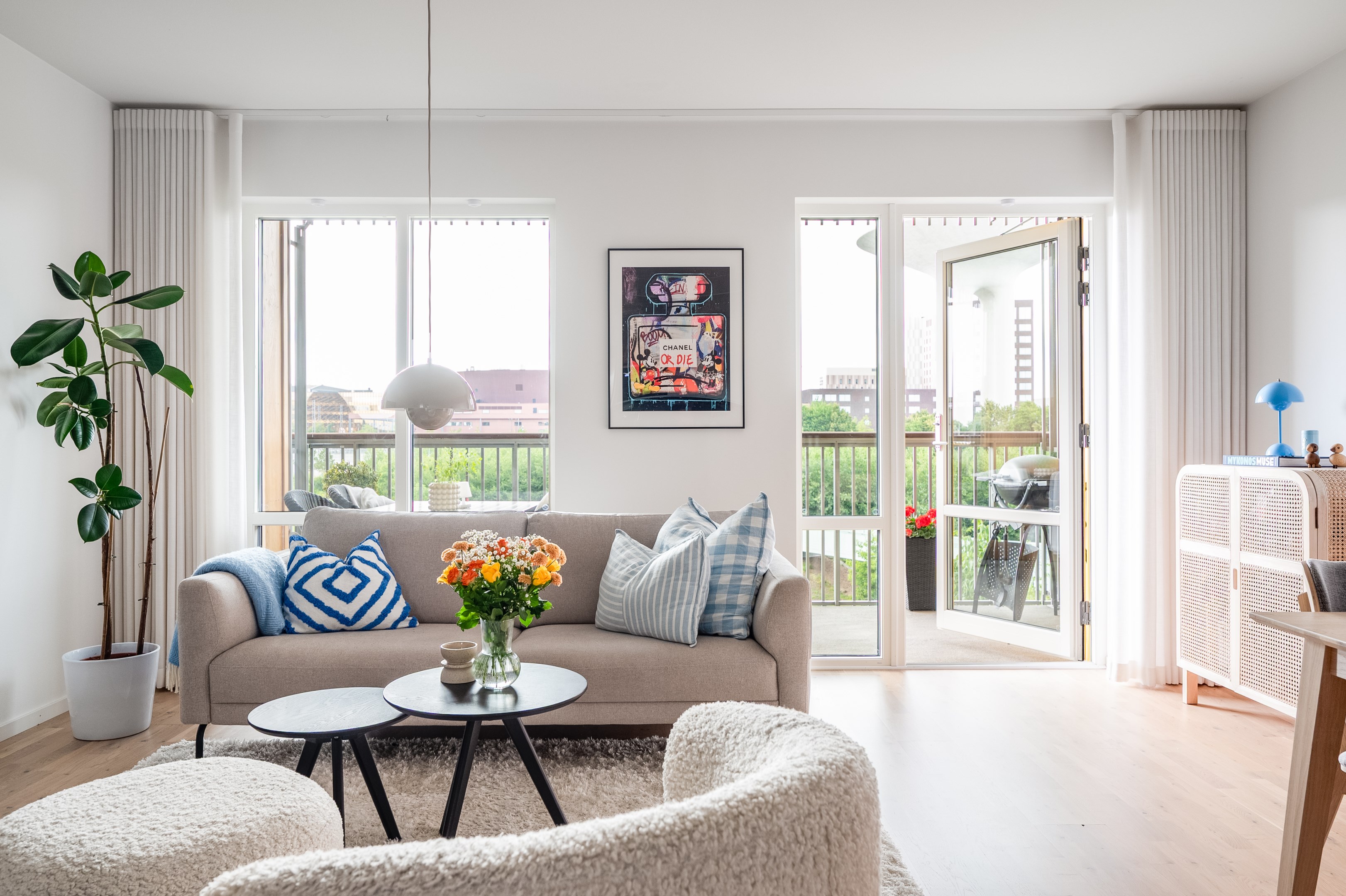 Vidare in i bostaden möts du av ett ljust, rymligt och harmoniskt vardagsrum med plats för både soffgrupp, tv-möbel och matbord i anslutning till köket. Från vardagsrummet nås den fantastiska balkongen i västerläge - en av få i området som är helt insynsskyddad och bjuder på en vidsträckt utsikt över grönska och omgivning. Golvet fortsätter med samma enhetliga parkett och ljusa väggar som i övriga delar av bostaden, vilket förstärker känslan av rymd och sammanhang.