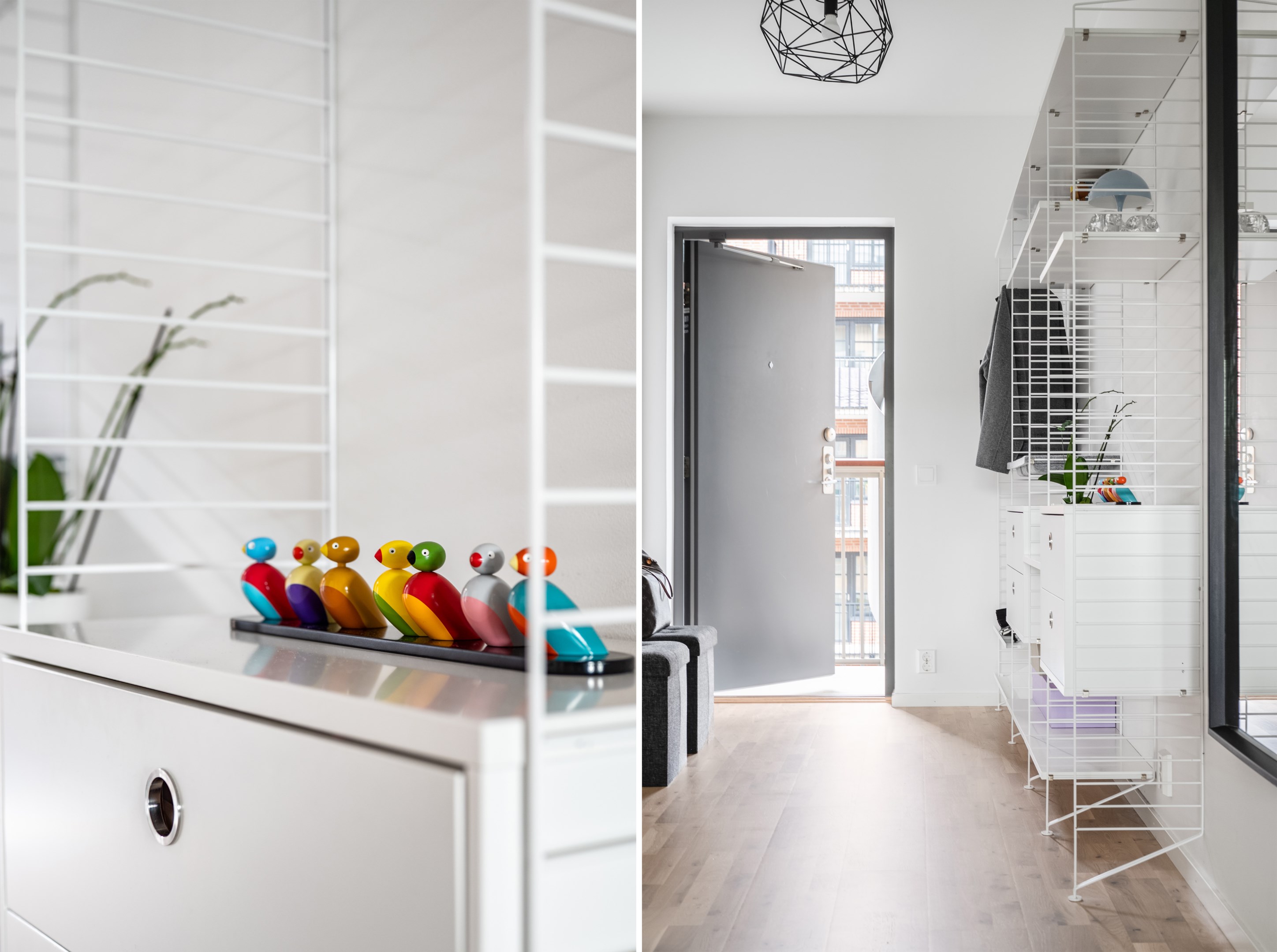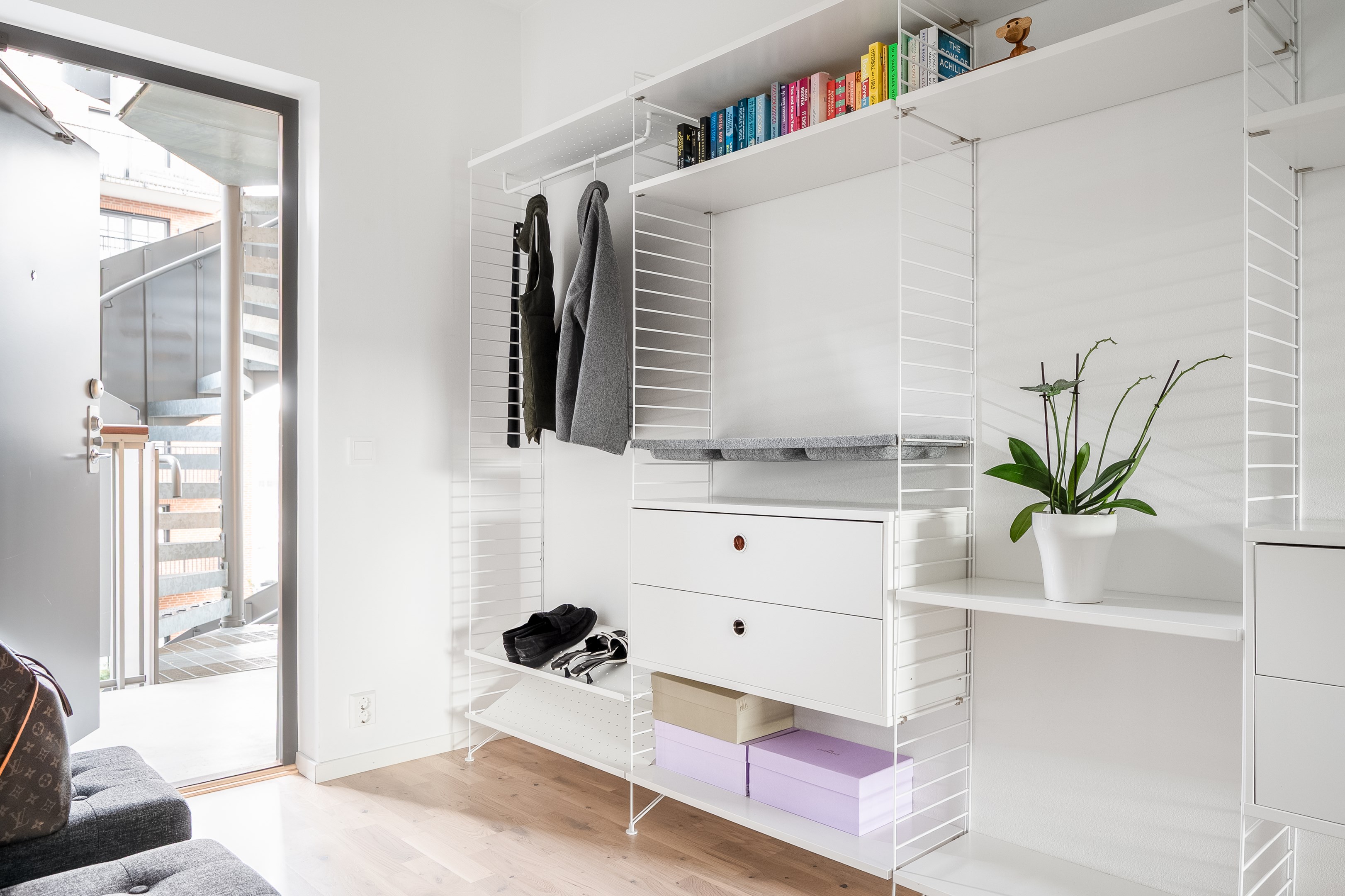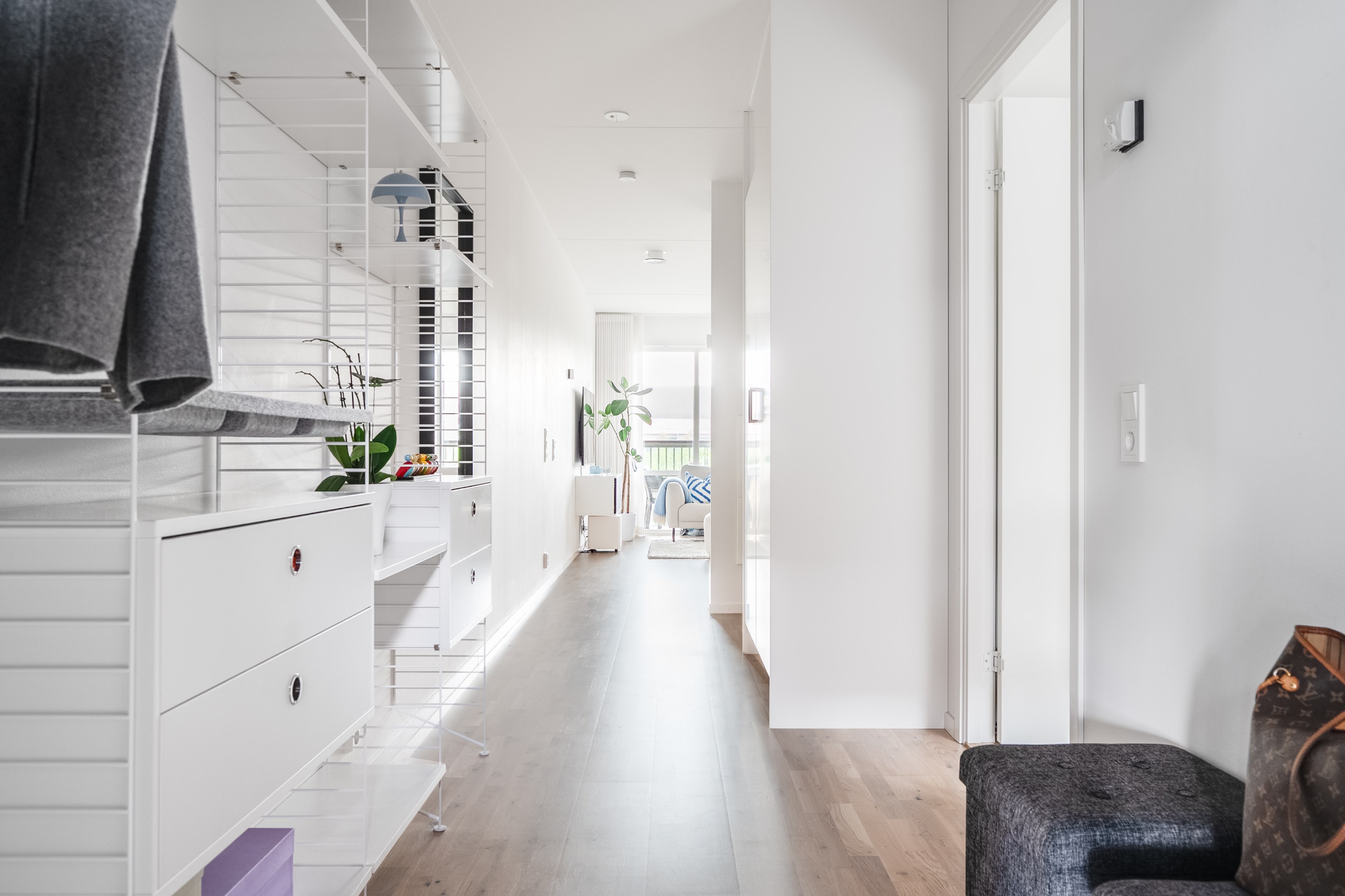 Välkomnande hall med trestavs parkettgolv och ljusa väggar som skapar en luftig och trivsam känsla redan vid första steget in. Här erbjuds generös förvaring i form av garderober samt gott om plats för avhängning av ytterkläder och skor.