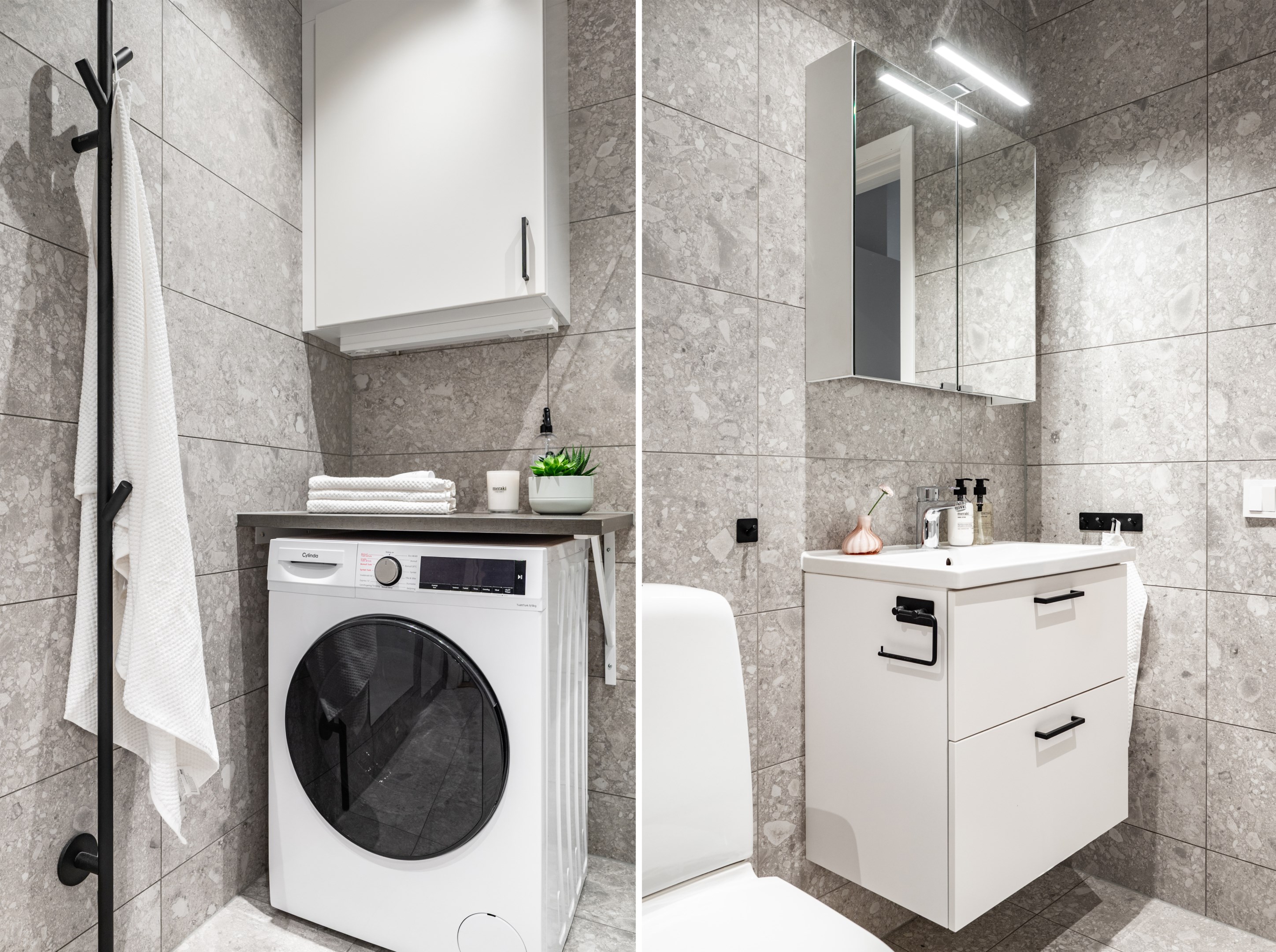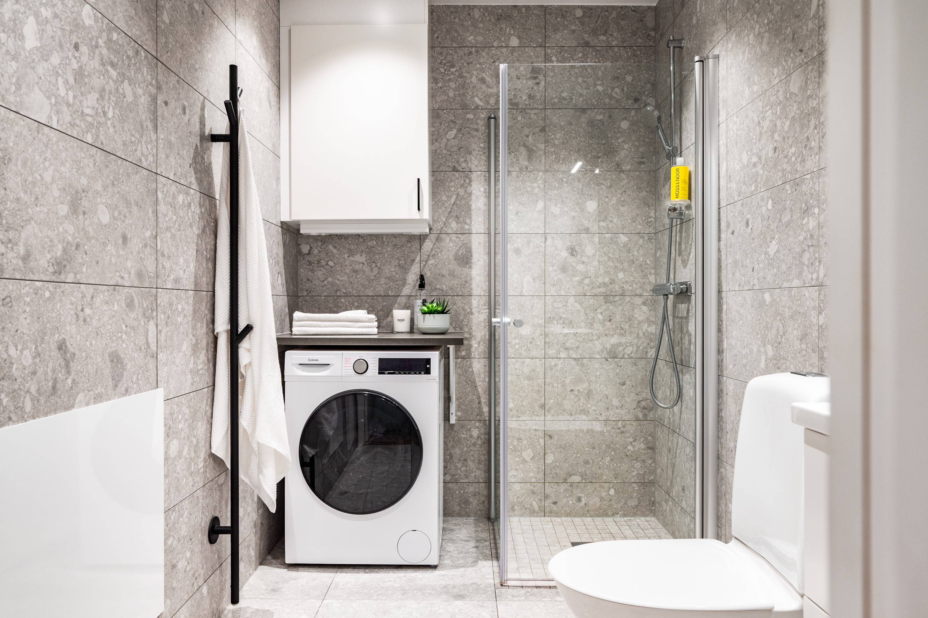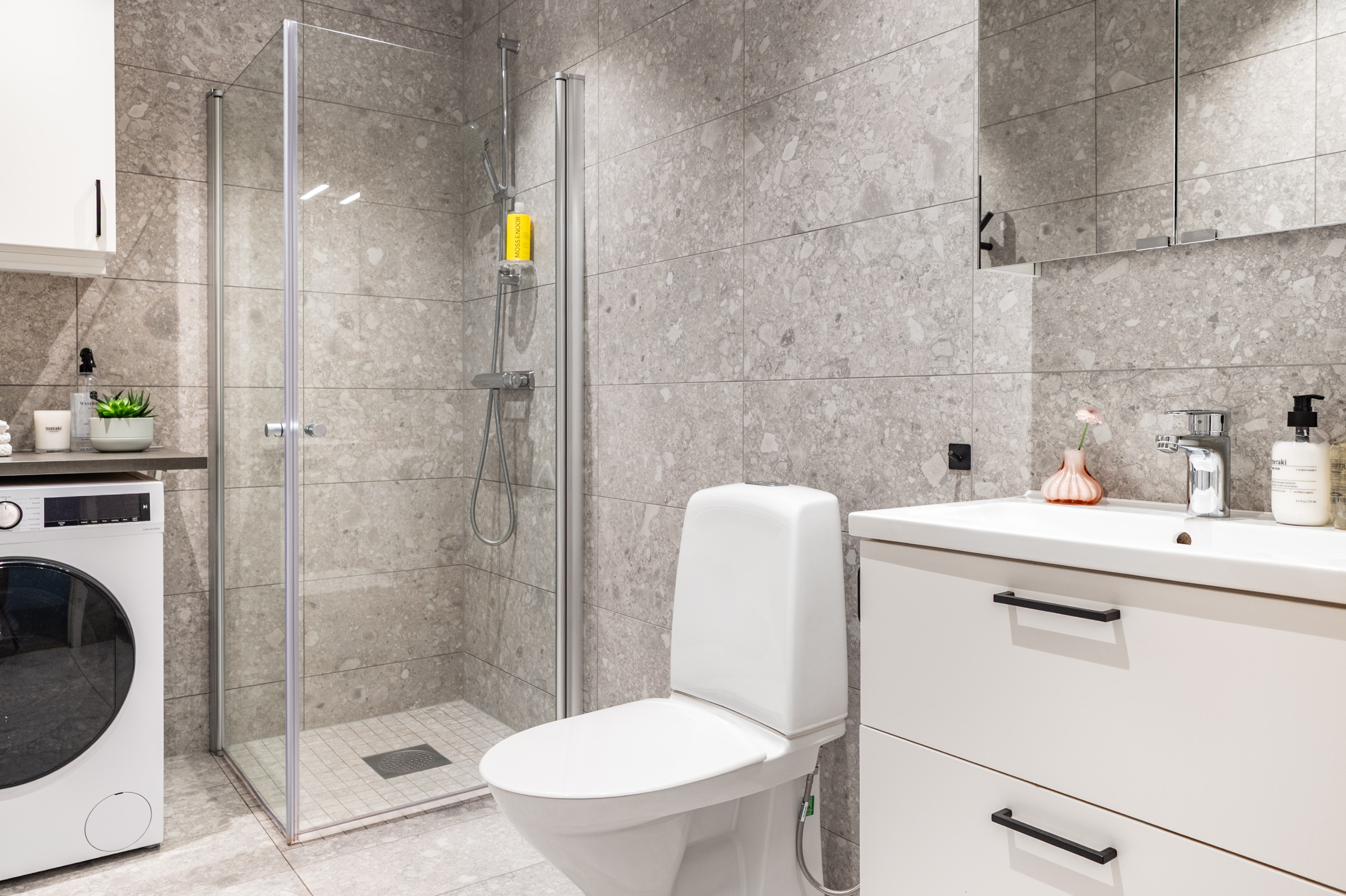 Smakfullt helkaklat badrum med stilrent klinkergolv och väggar i ett matt, levande grått mönster inspirerat av natursten och skapar både värme och elegans. Badrummet är utrustat med dusch bakom glasvägg, handfat med kommod och spegel, wc samt handdukstork för extra komfort. Den praktiska kombitvättmaskinen är smidigt placerad med förvaring ovanför i stilrena Vedum-skåp. Spotlights i taket ger ett behagligt och välavvägt ljus.