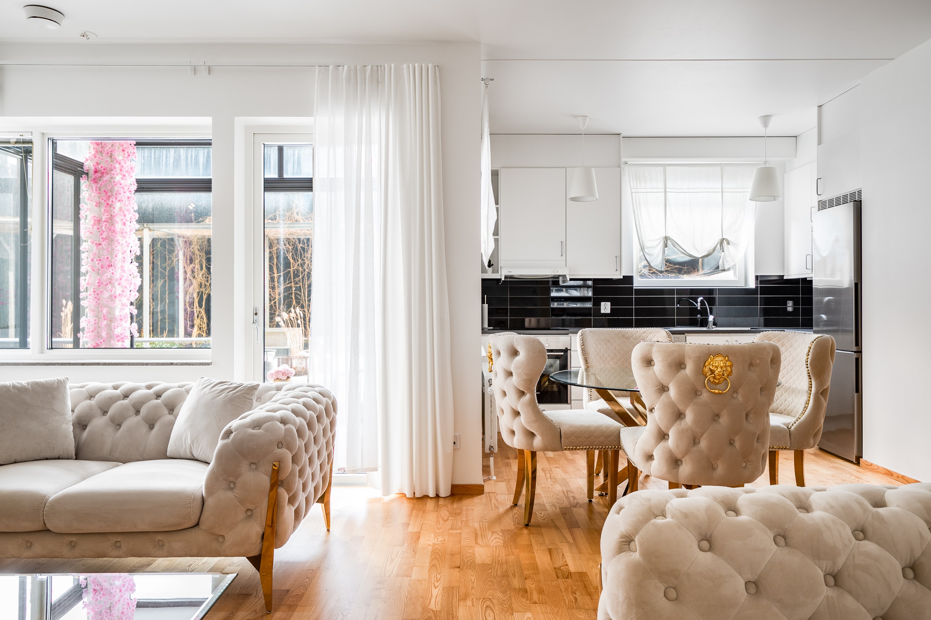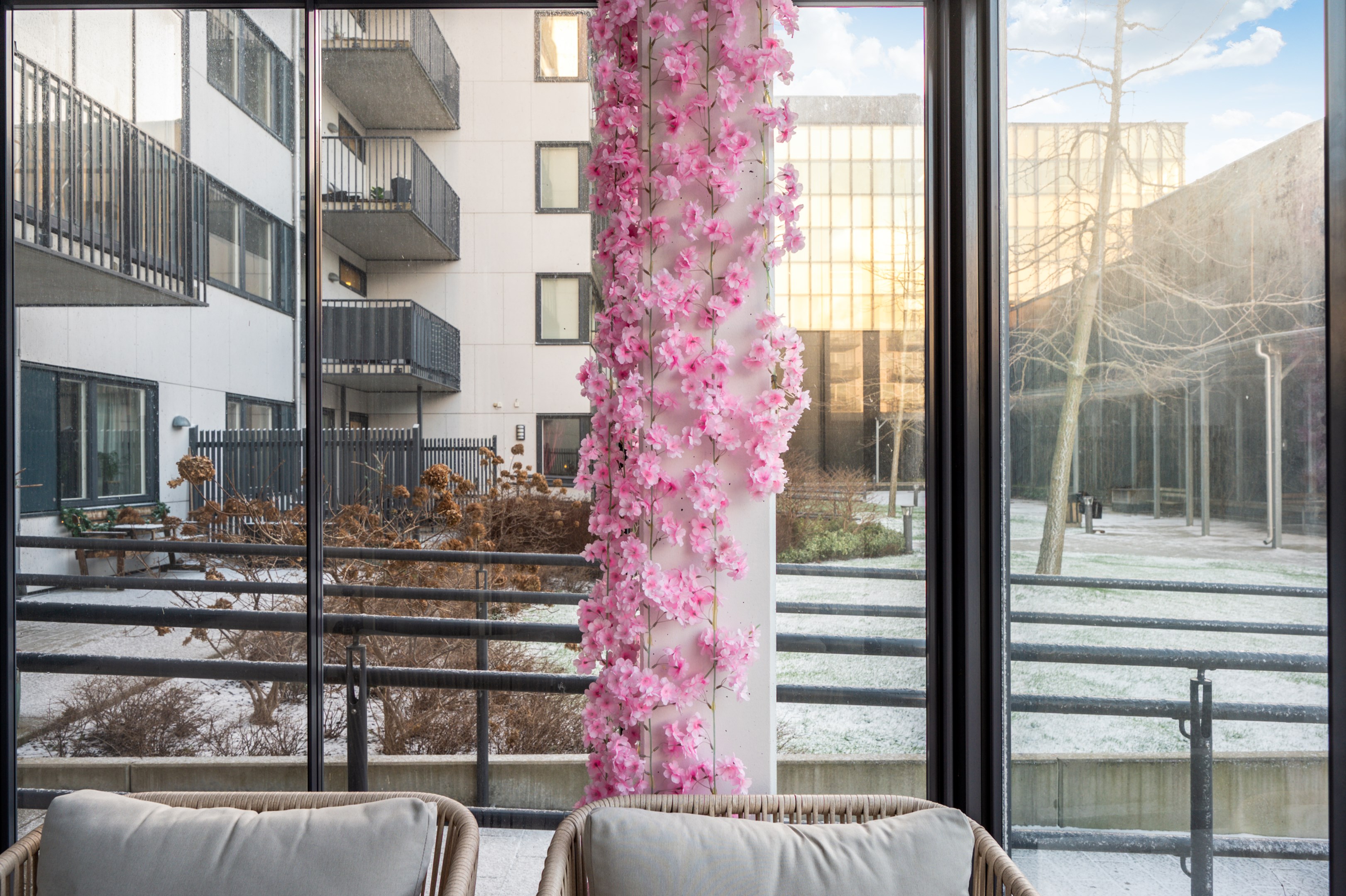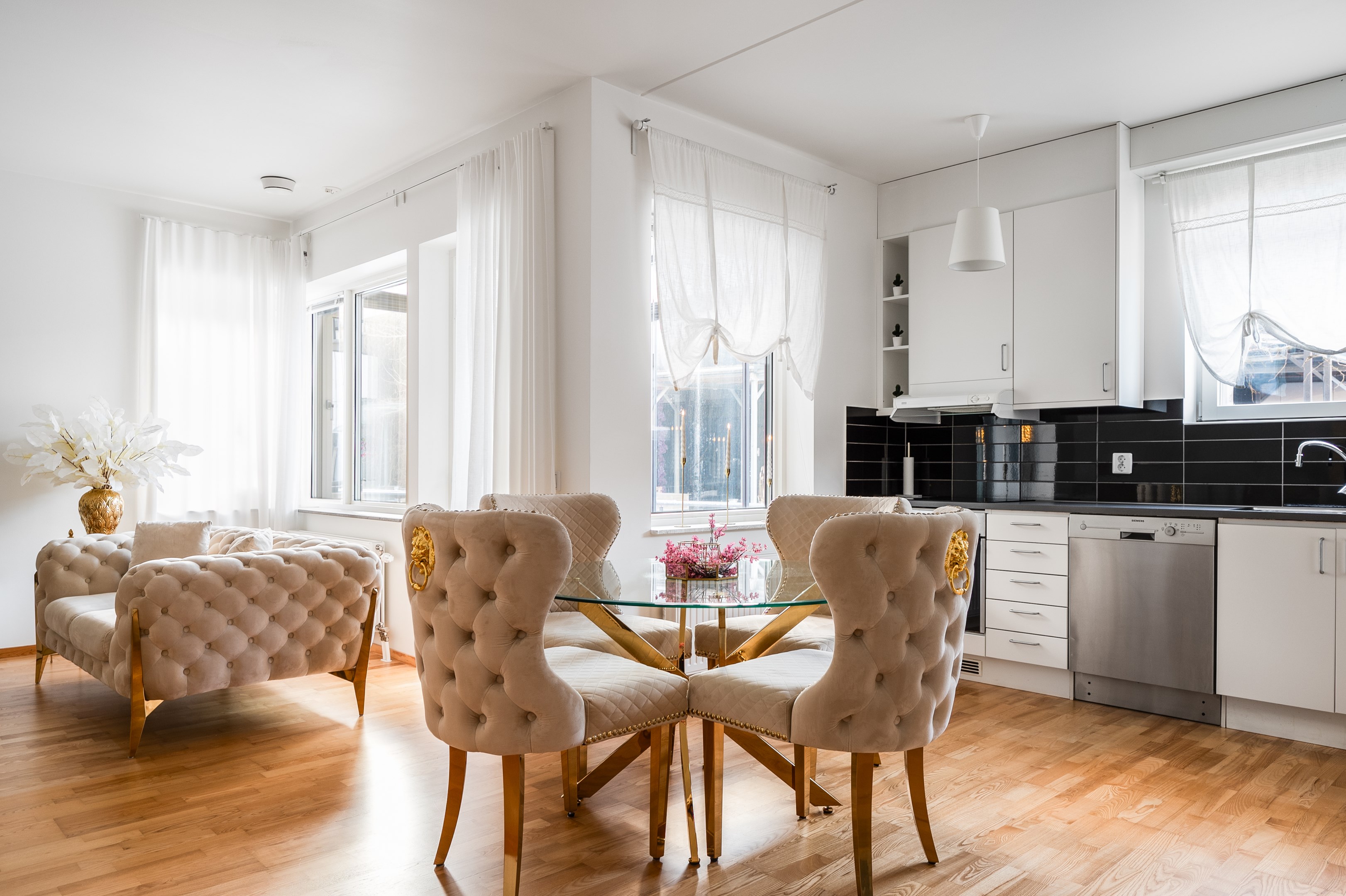 Ett ljust och välkomnande vardagsrum, med stora fönster som ger ett härligt naturligt ljusflöde i hela bostaden. Härifrån når du den fantastiska inglasade uteplatsen, där du med enkelhet kan ha ett större loungeset och härliga sommarkvällar mot innergården. – perfekt för avkoppling året runt. Den öppna planlösningen ger en social och rymlig känsla, med gott om plats för en generös soffgrupp och en stilfull matplats.