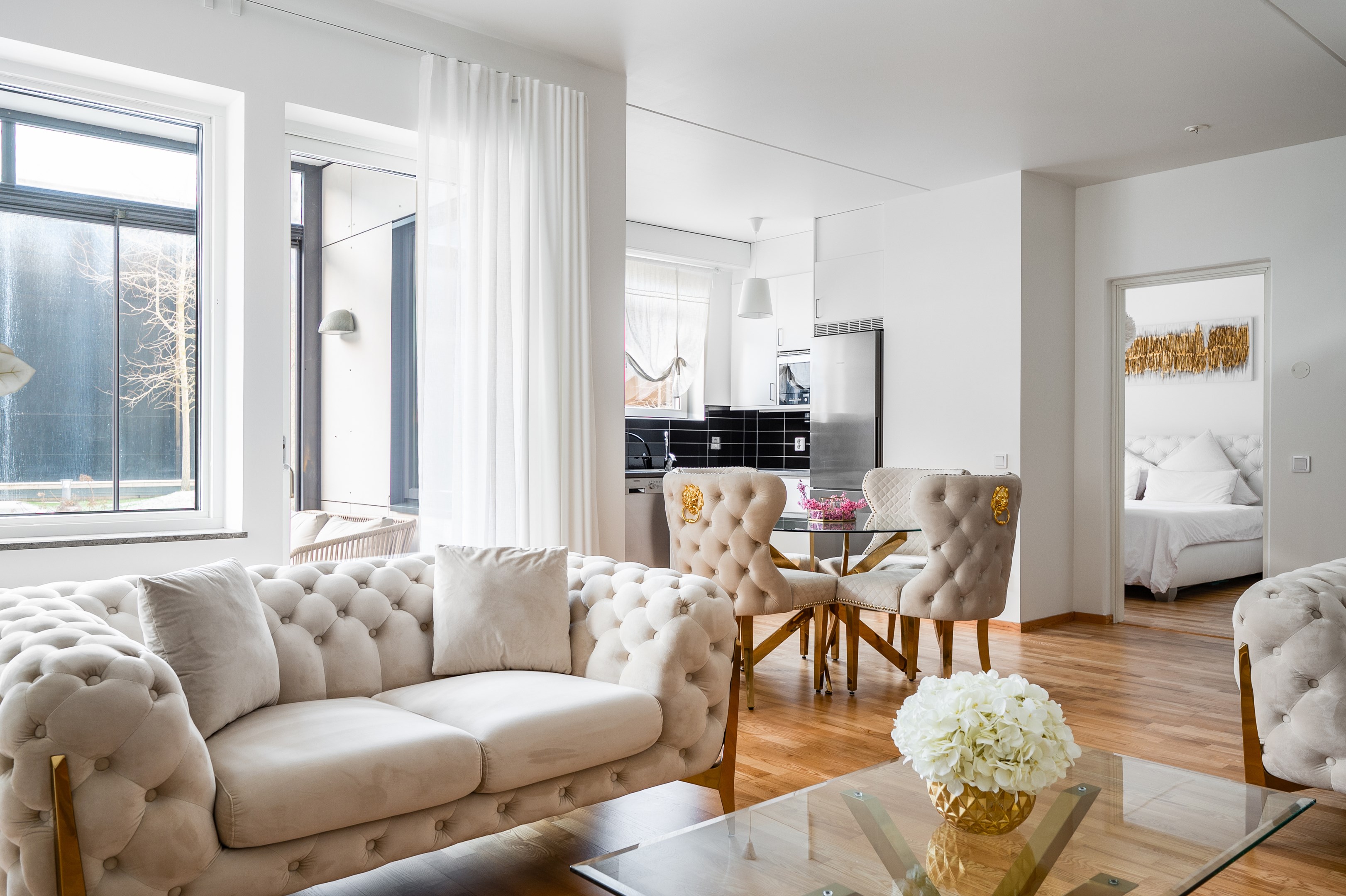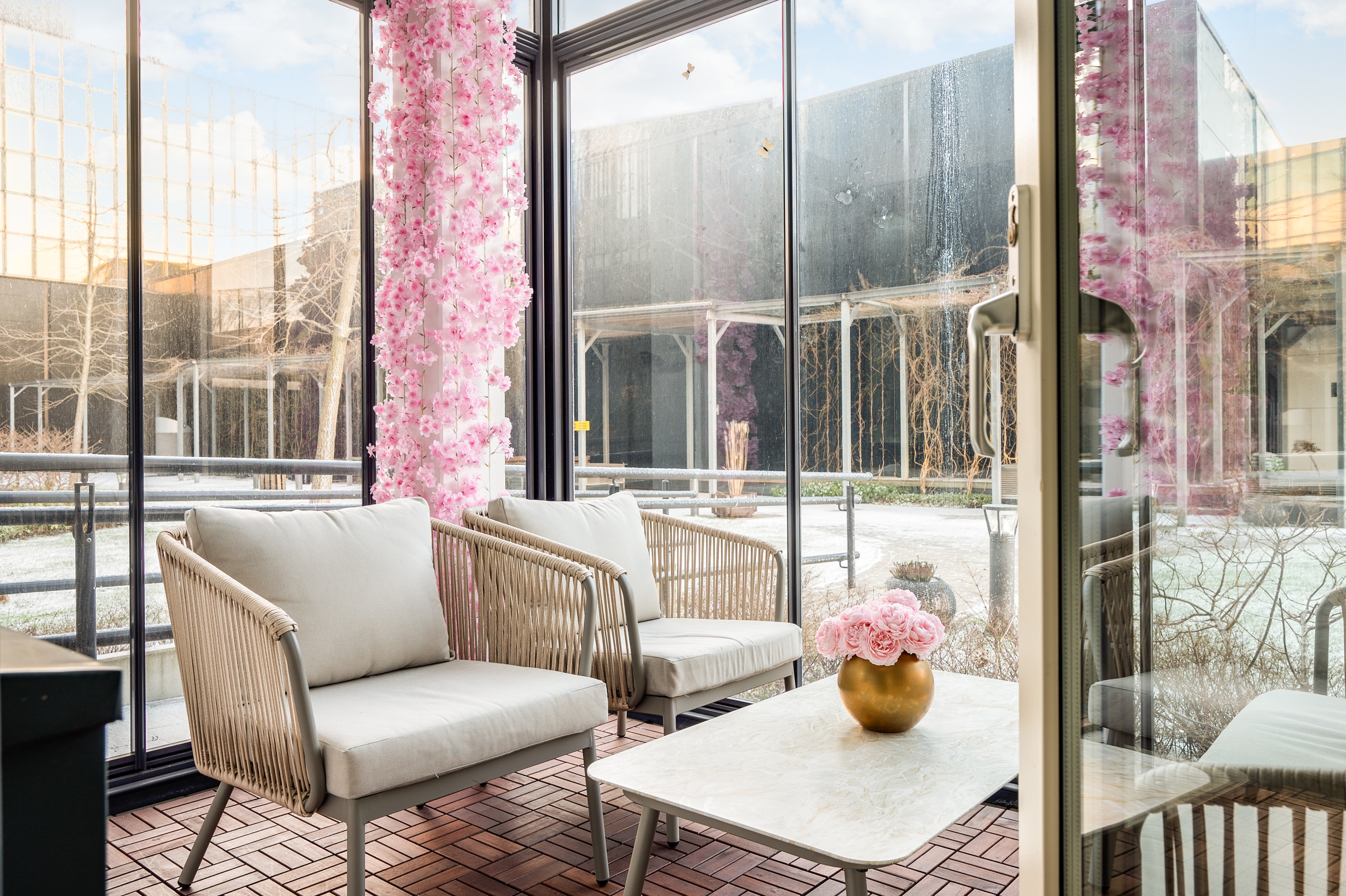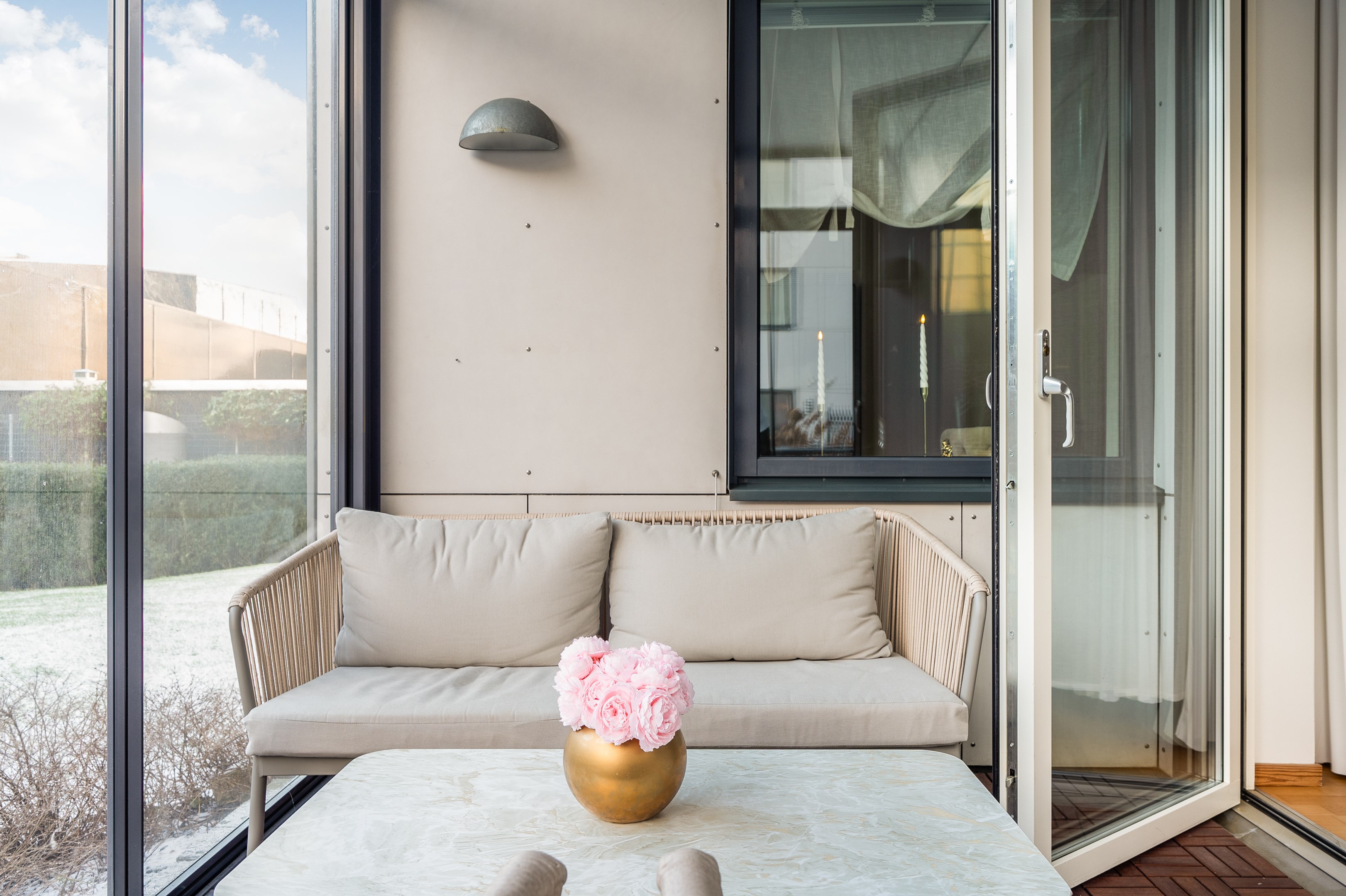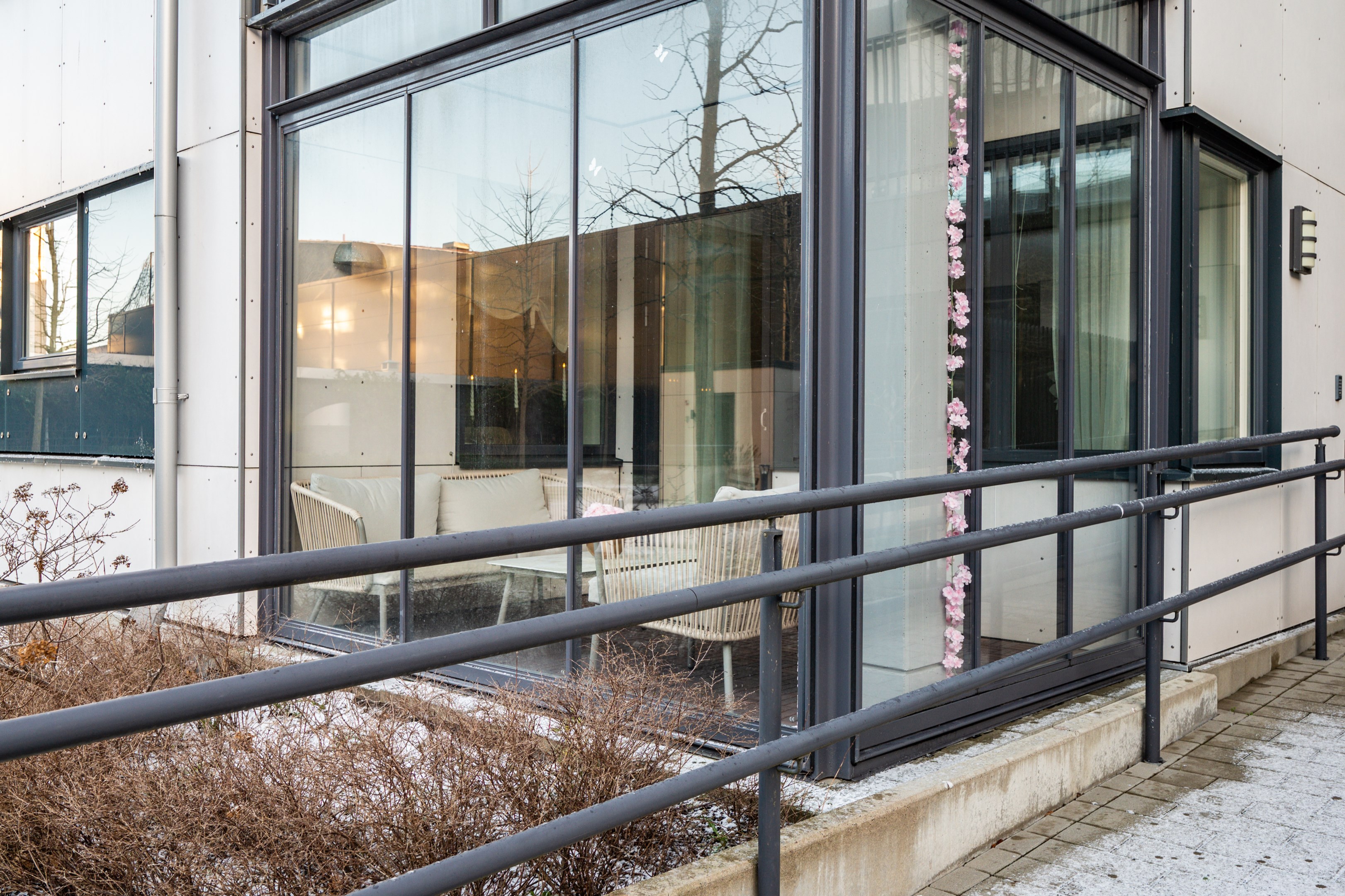 Ett ljust och välkomnande vardagsrum, med stora fönster som ger ett härligt naturligt ljusflöde i hela bostaden. Härifrån når du den fantastiska inglasade uteplatsen, där du med enkelhet kan ha ett större loungeset och härliga sommarkvällar mot innergården. – perfekt för avkoppling året runt. Den öppna planlösningen ger en social och rymlig känsla, med gott om plats för en generös soffgrupp och en stilfull matplats.