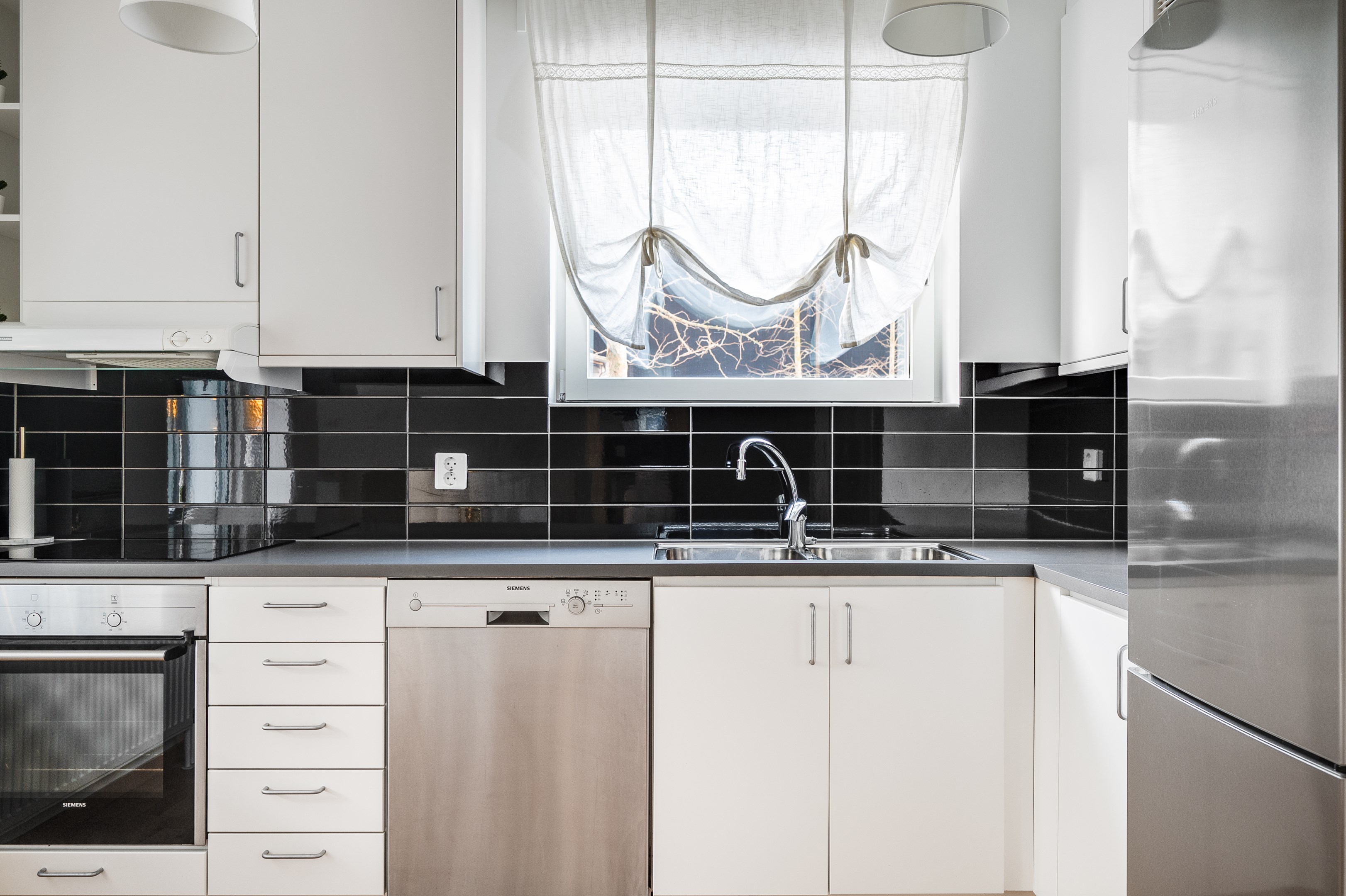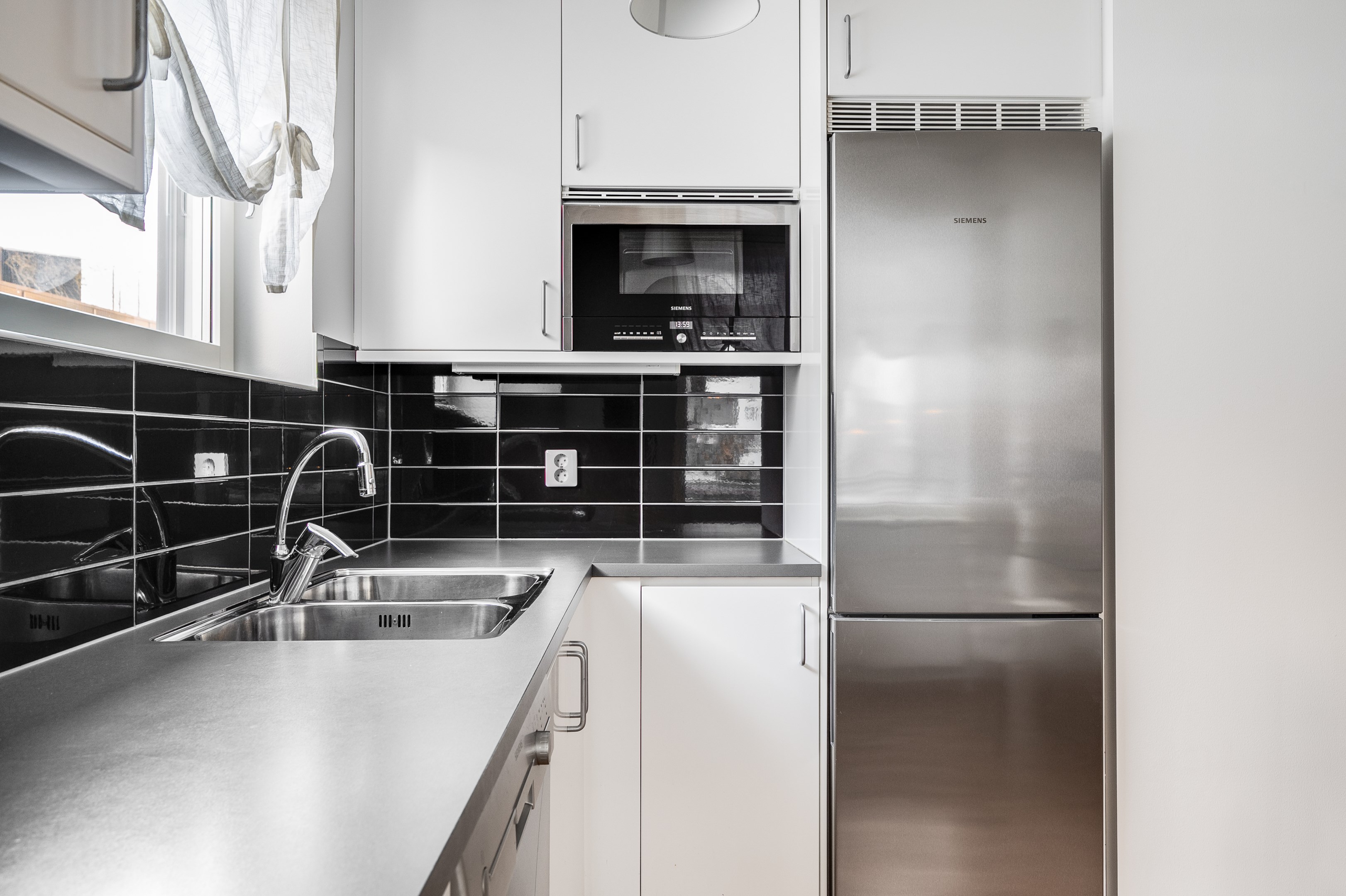 Den öppna planlösningen mot vardagsrummet skapar en trevlig och inbjudande känsla. Köket är modernt och funktionellt med kyl/frys i fullhöjd, integrerad diskmaskin samt spishäll, inbyggd ugn och mikrovågsugn. Ett vitt kök med en stilren bänkskiva kombineras med svart kakel, och det stora fönstret ger rikligt med dagsljus. Gott om förvaring erbjuds i över- och underskåp.
