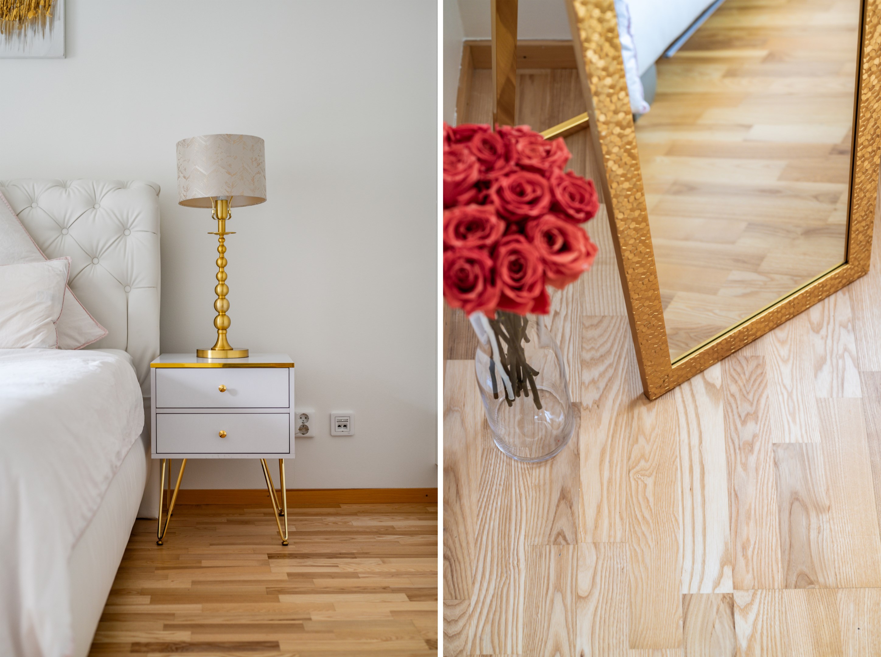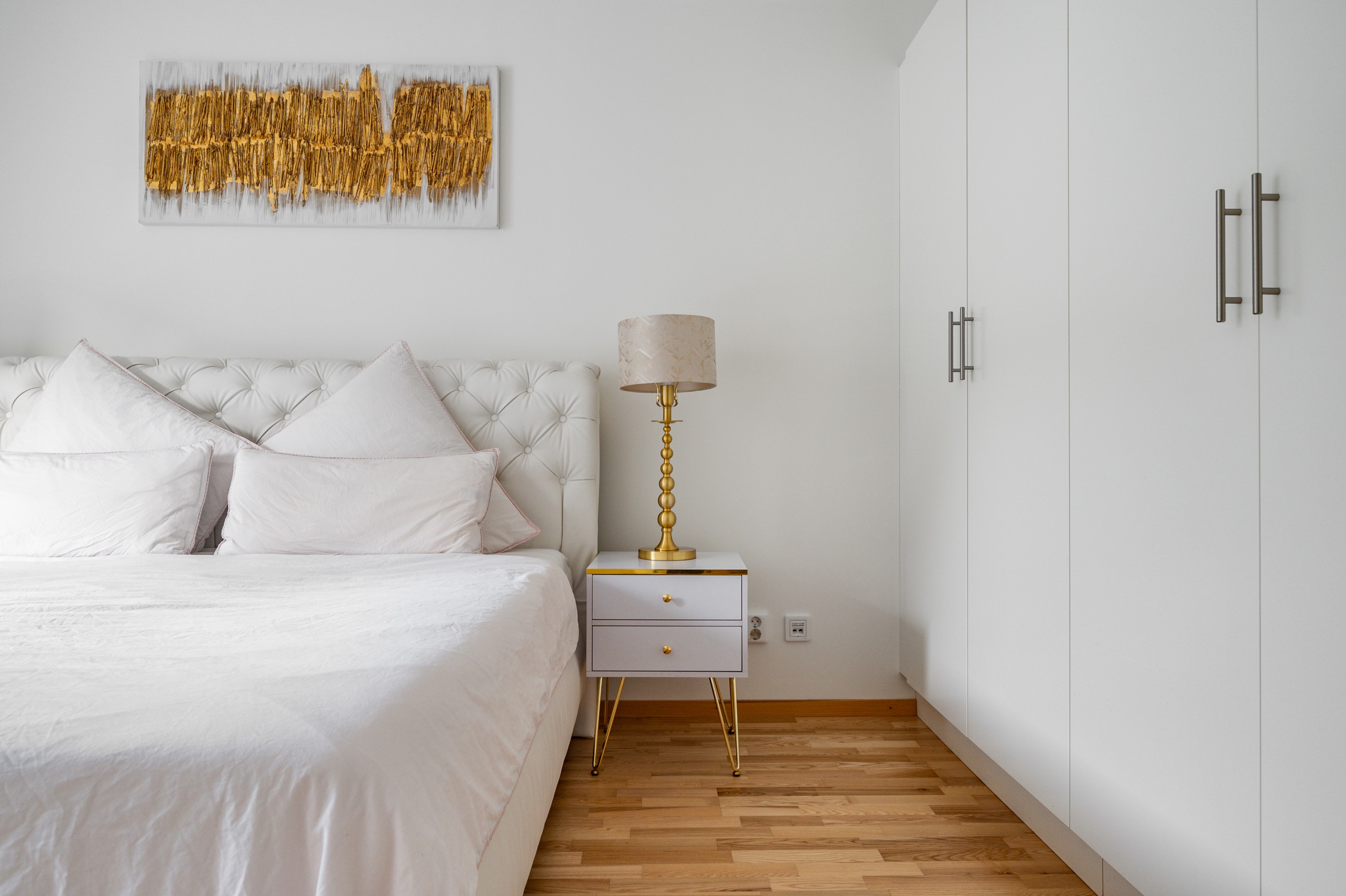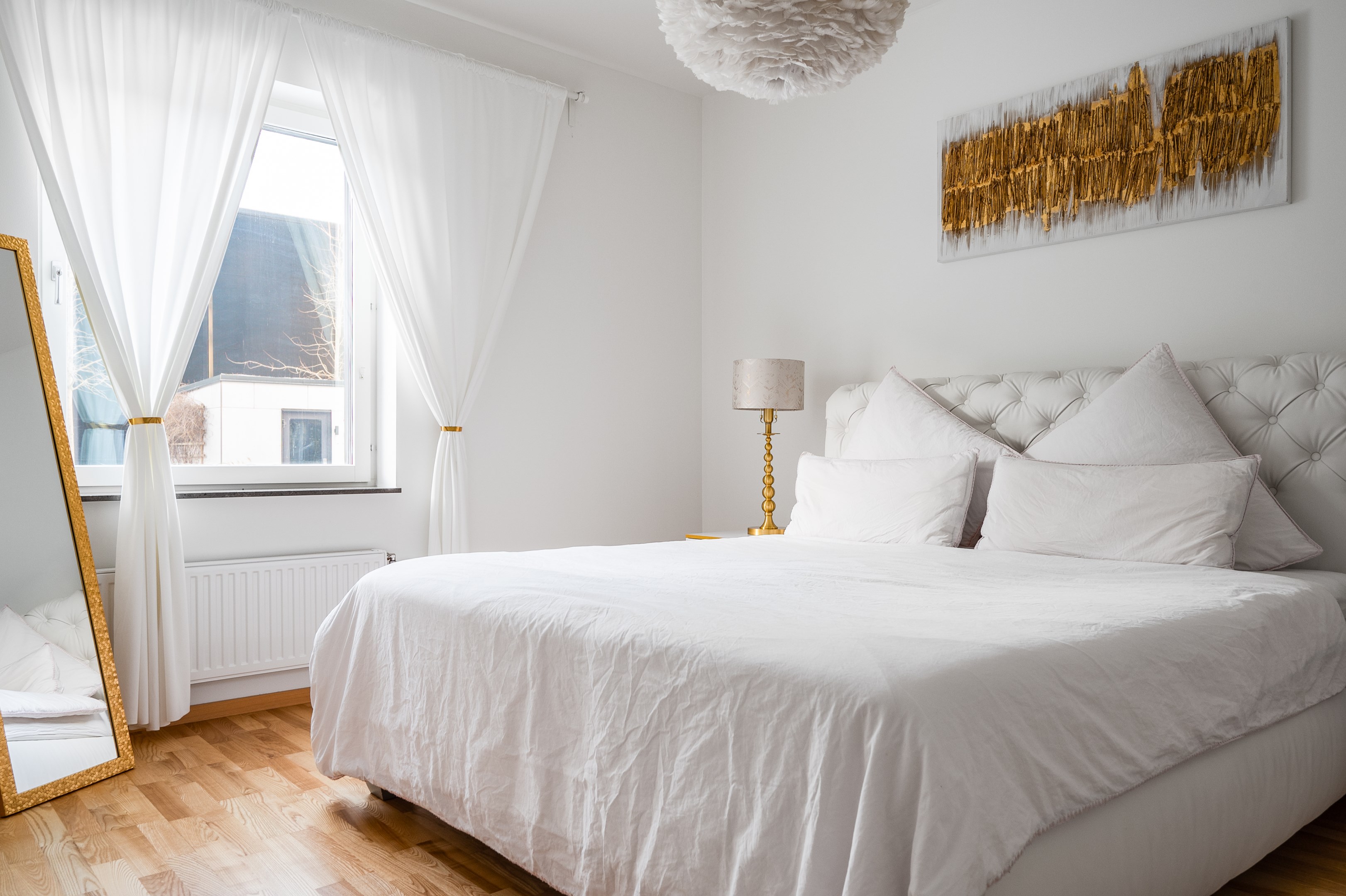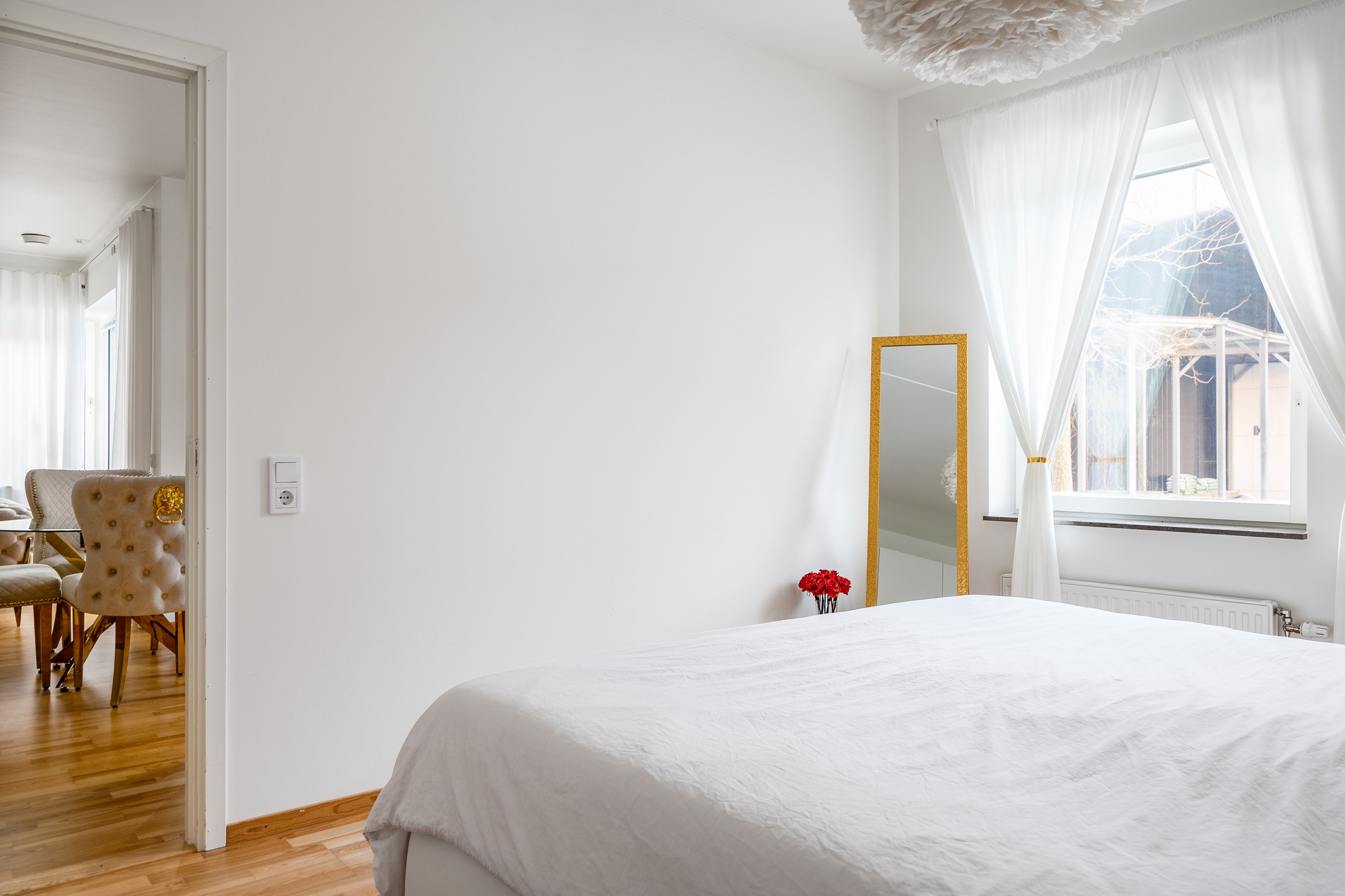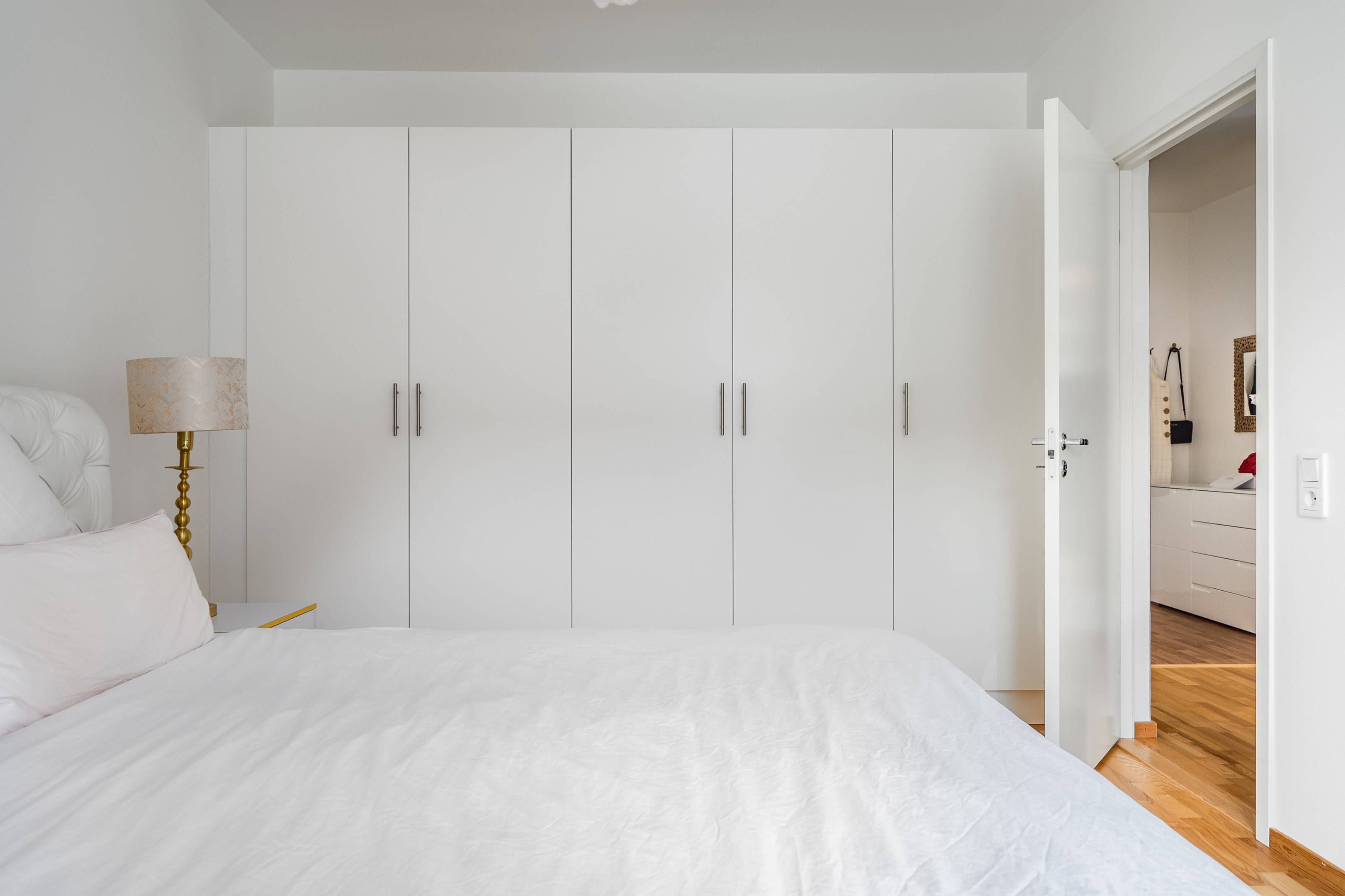 Sovrummet är ljust och inbjudande med gott om plats för en dubbelsäng och matchande sängbord. Längs ena väggen finns generösa garderober som erbjuder utmärkt förvaring och hjälper till att hålla rummet organiserat och prydligt. Det stora fönstret släpper in ett vackert dagsljus som förstärker den trivsamma atmosfären.