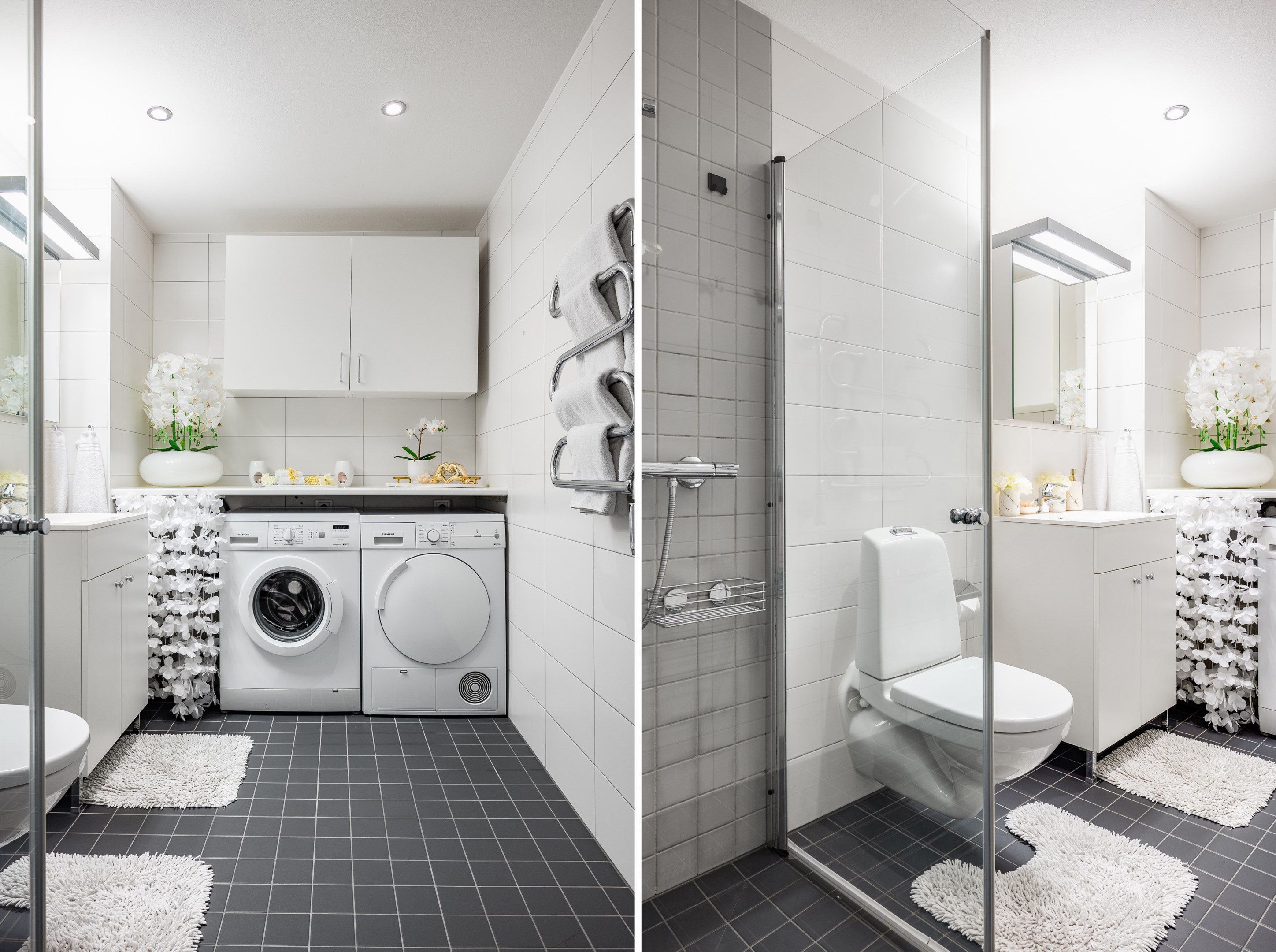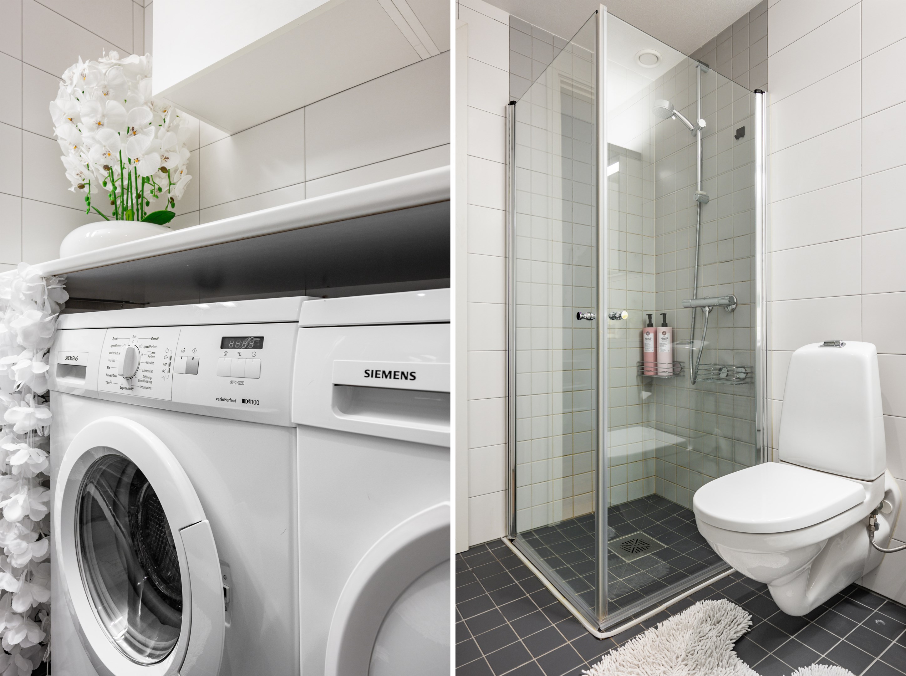 Det rymliga och smakfulla badrummet ligger i anslutning till hallen och erbjuder både stil och funktion. Stora vita kakel plattor på väggen och grått klinkergolvet som ger en modern känsla. Badrummet är utrustat med en vit kommod, WC och en generös duschhörna med klarglasväggar. Den praktiska tvättavdelningen är utrustad med tvättmaskin, torktumlare och en vit arbetsbänk med matchande förvaringsskåp ovanför, vilket skapar en både praktisk och estetisk helhet.