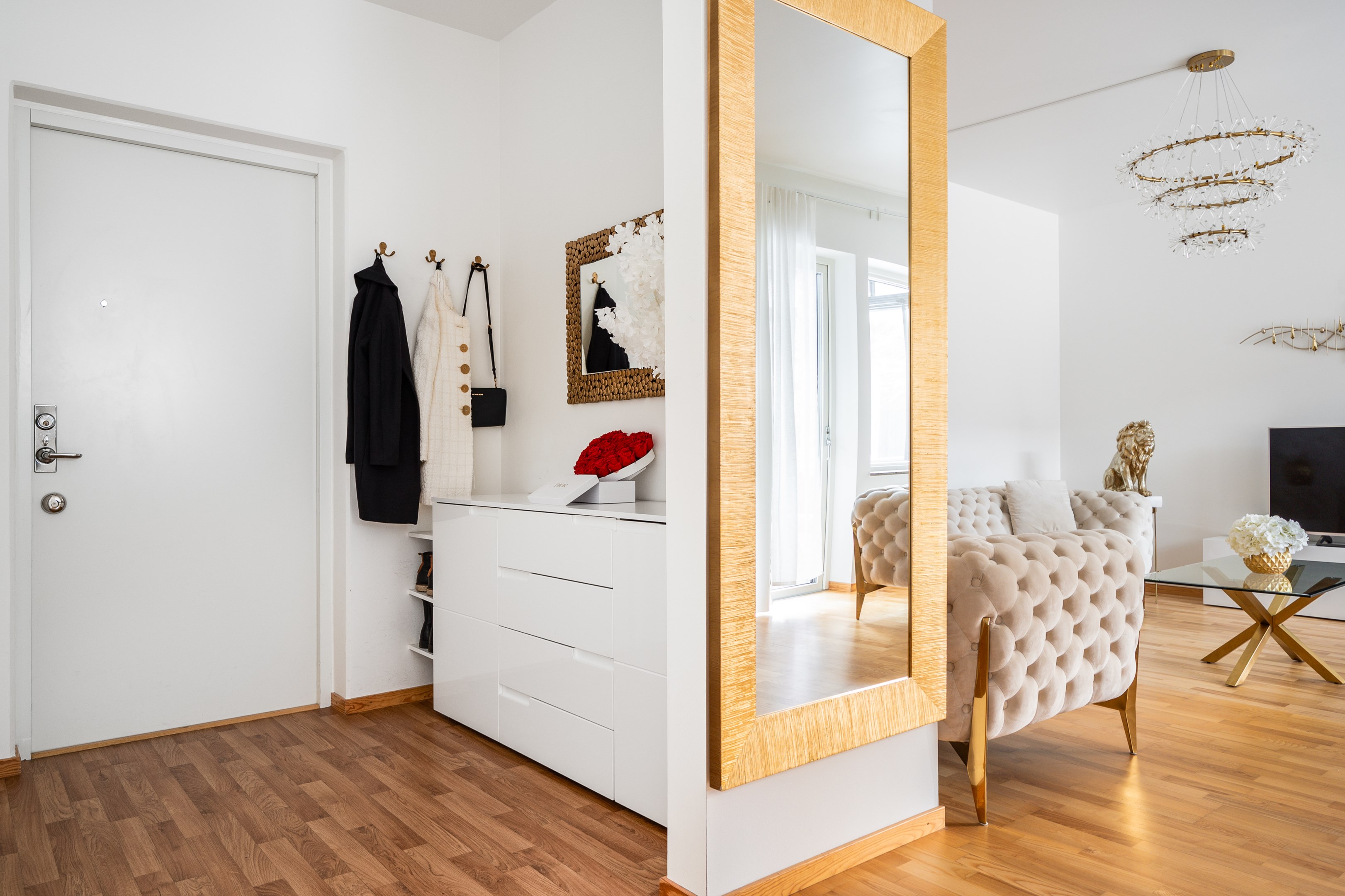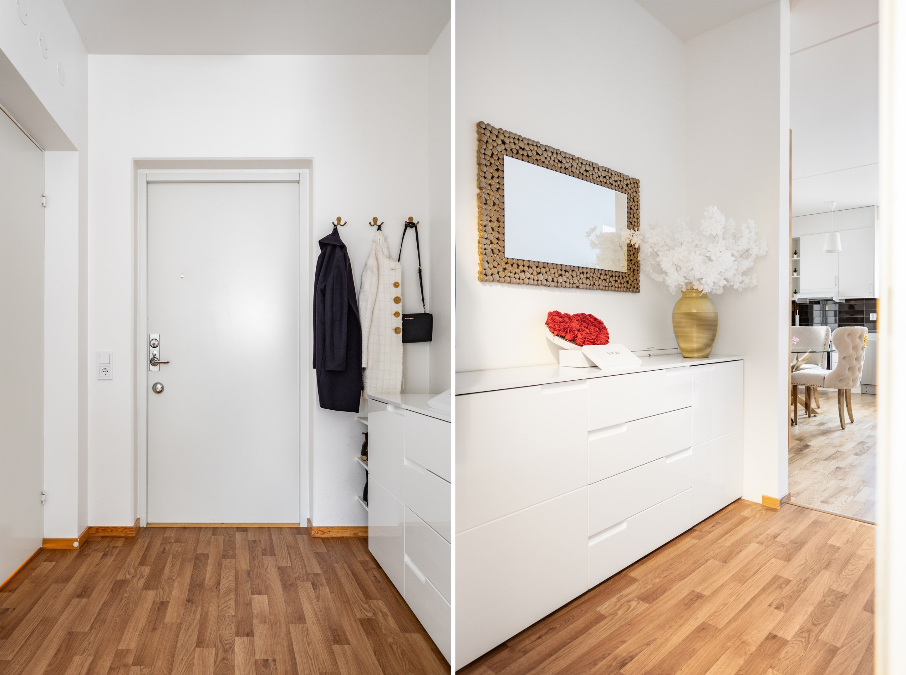 Denna välkomnande hall erbjuder ett praktiskt och stilrent första intryck med ljusa väggar och ett fint ekparkett. Här finns gott om förvaringsmöjligheter för ytterkläder och skor, vilket bidrar till en organiserad och inbjudande känsla.