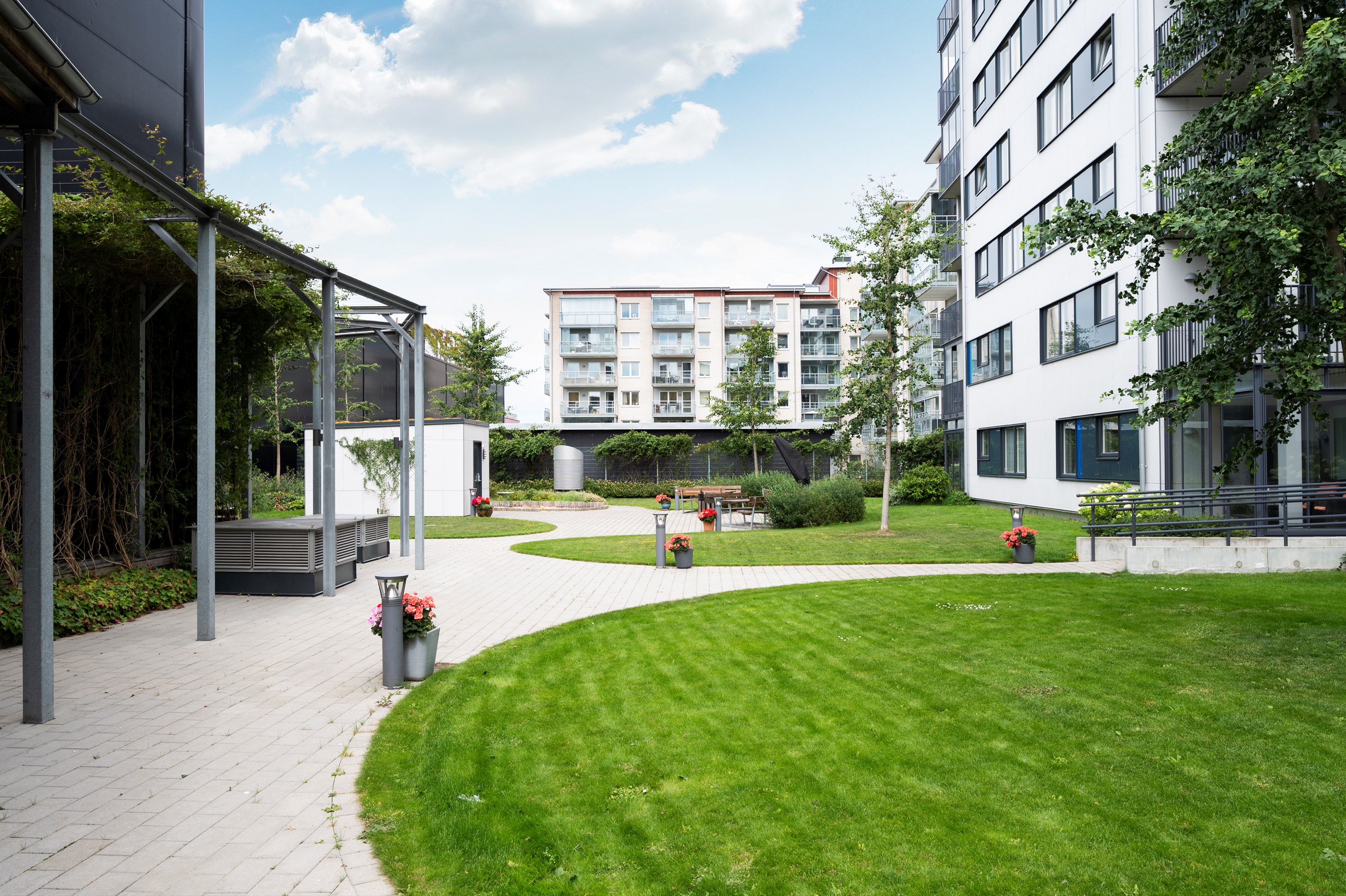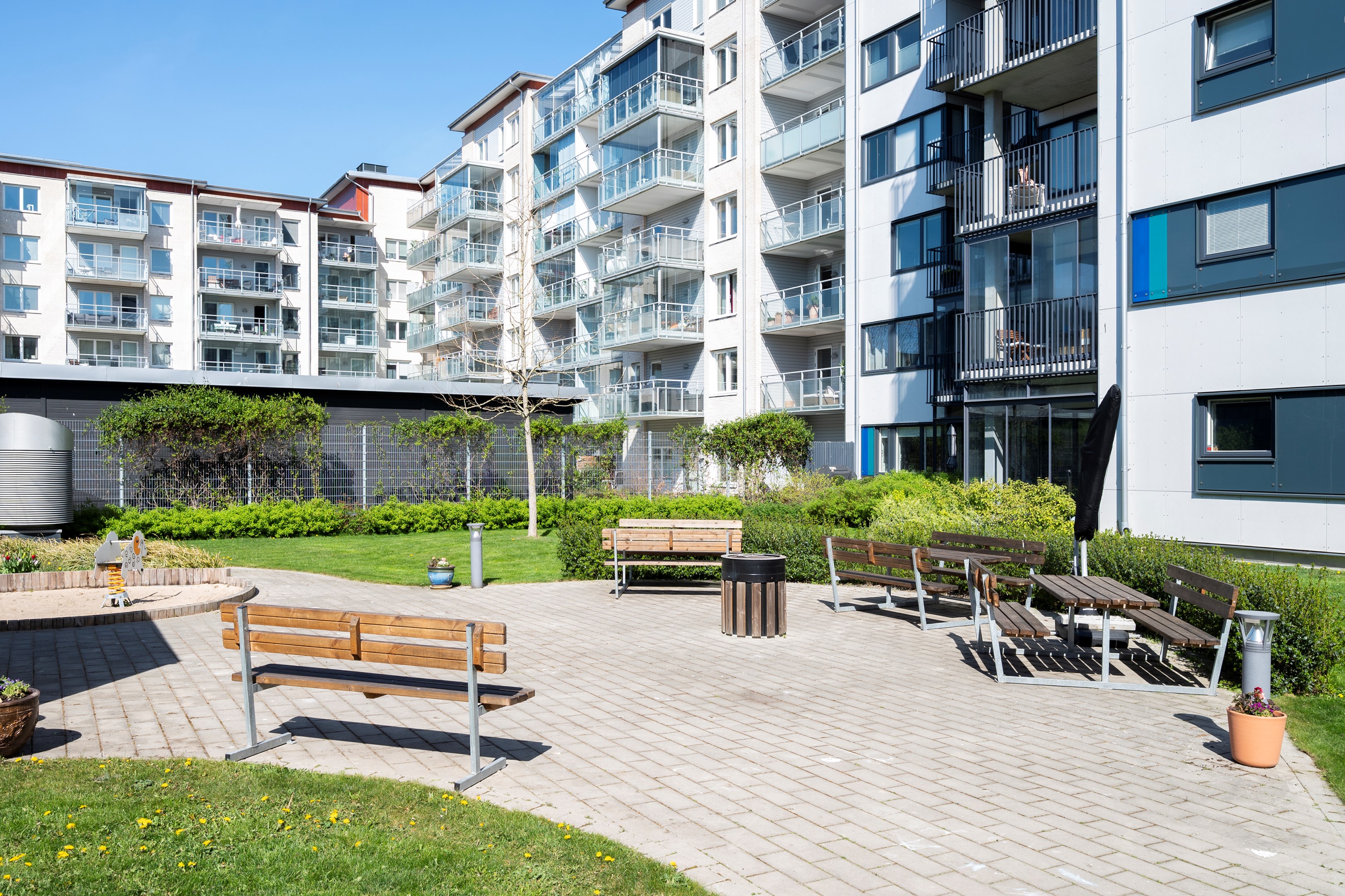 Föreningen har en grönskande innergård med trevliga utemöbler, perfekt för avkoppling och socialt umgänge. Här kan du njuta av solen i en lugn och trivsam miljö, ett härligt komplement till ditt boende.