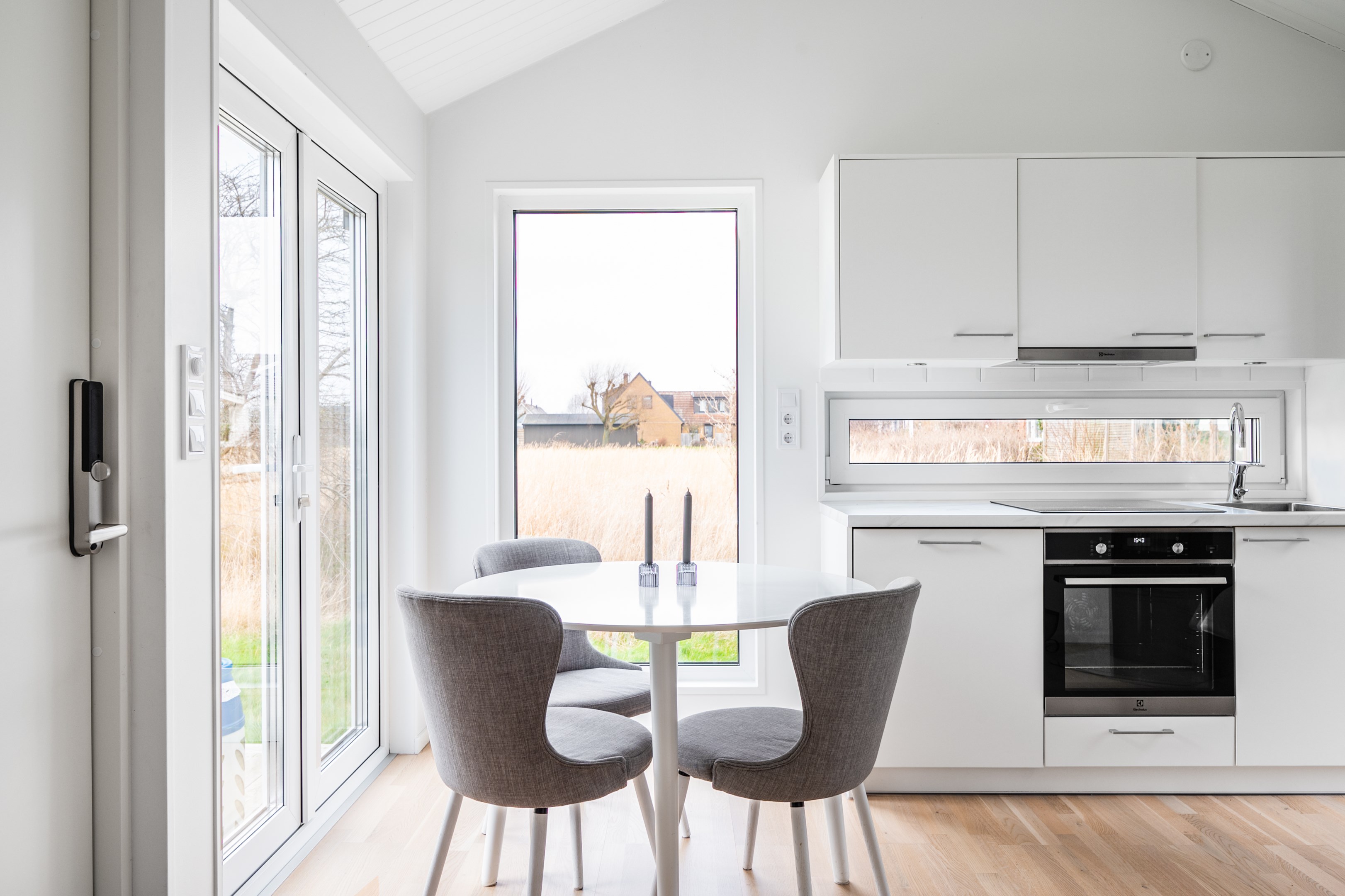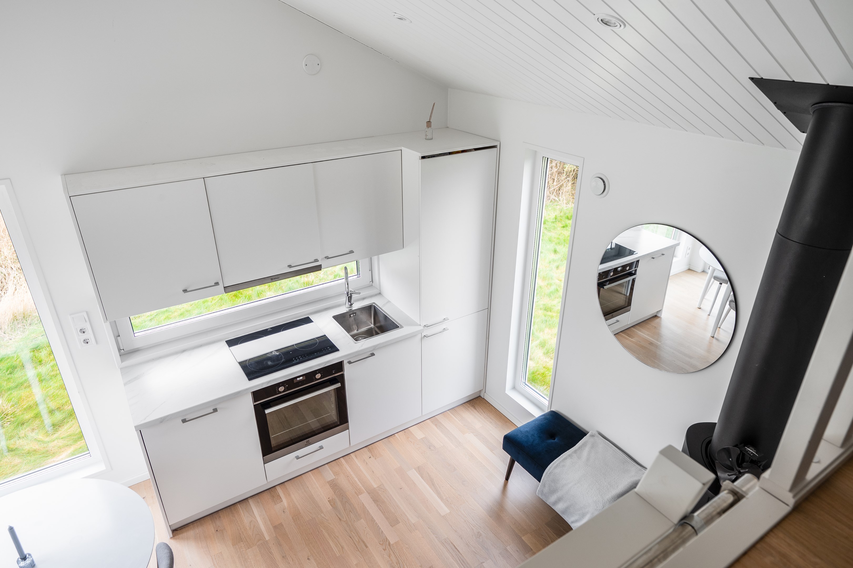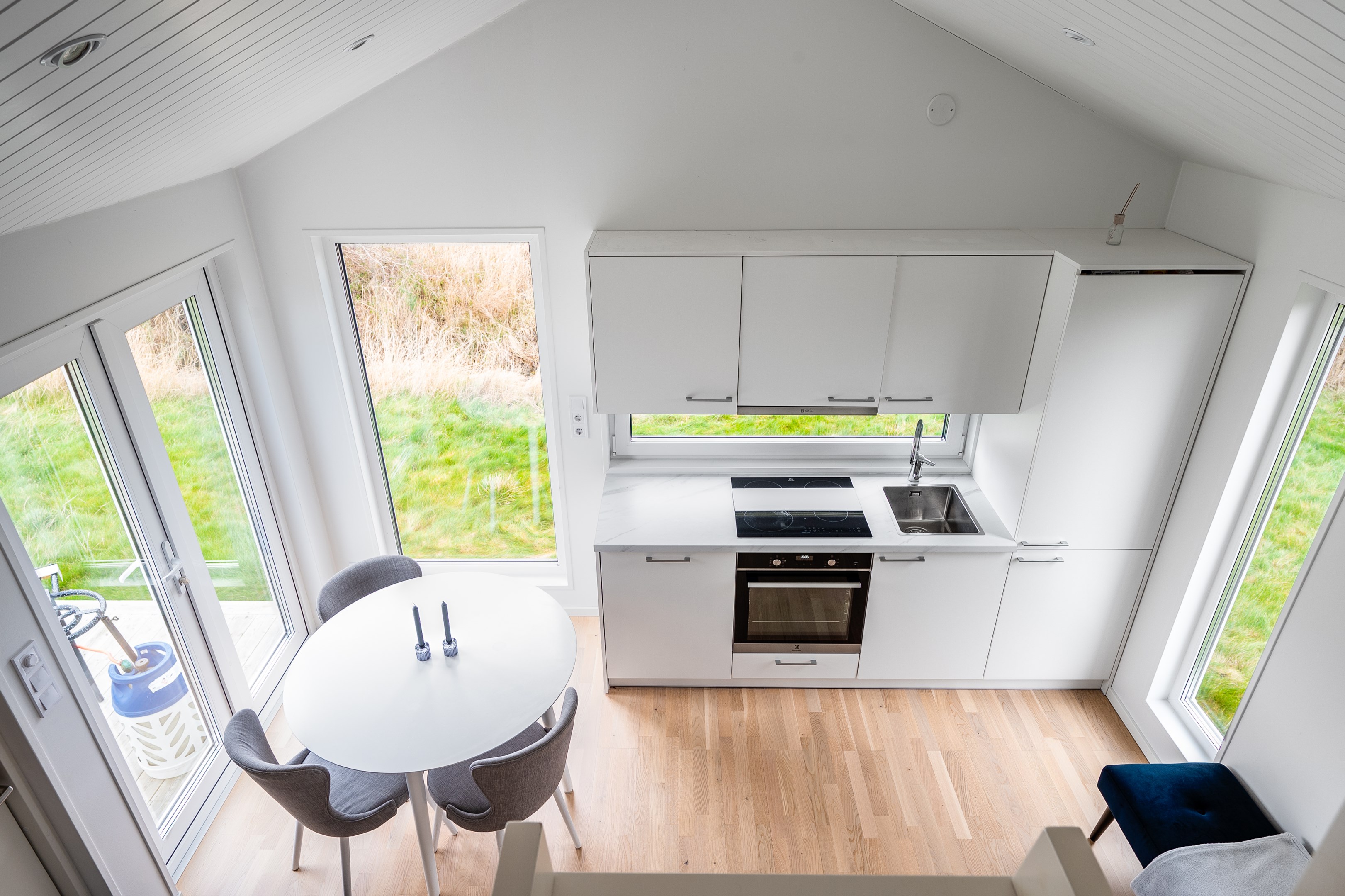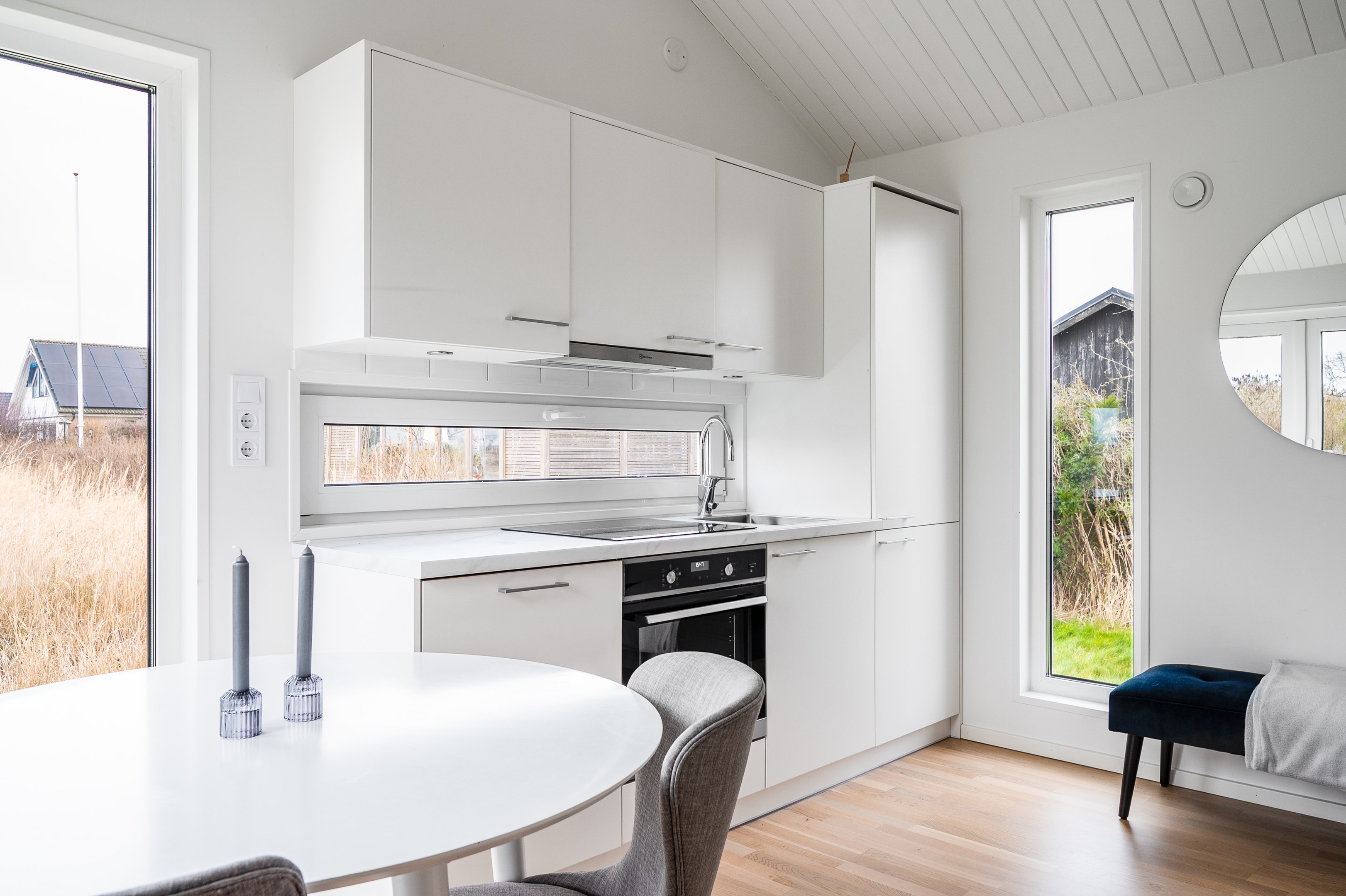 Köket är ett stilrent, vitt kök med en vit laminatbänkskiva och är välutrustat med kyl/frys, spishäll, ugn och diskmaskin. Här får du en praktisk och funktionell arbetsyta som smälter in perfekt i den öppna planlösningen tillsammans med vardagsrummet
