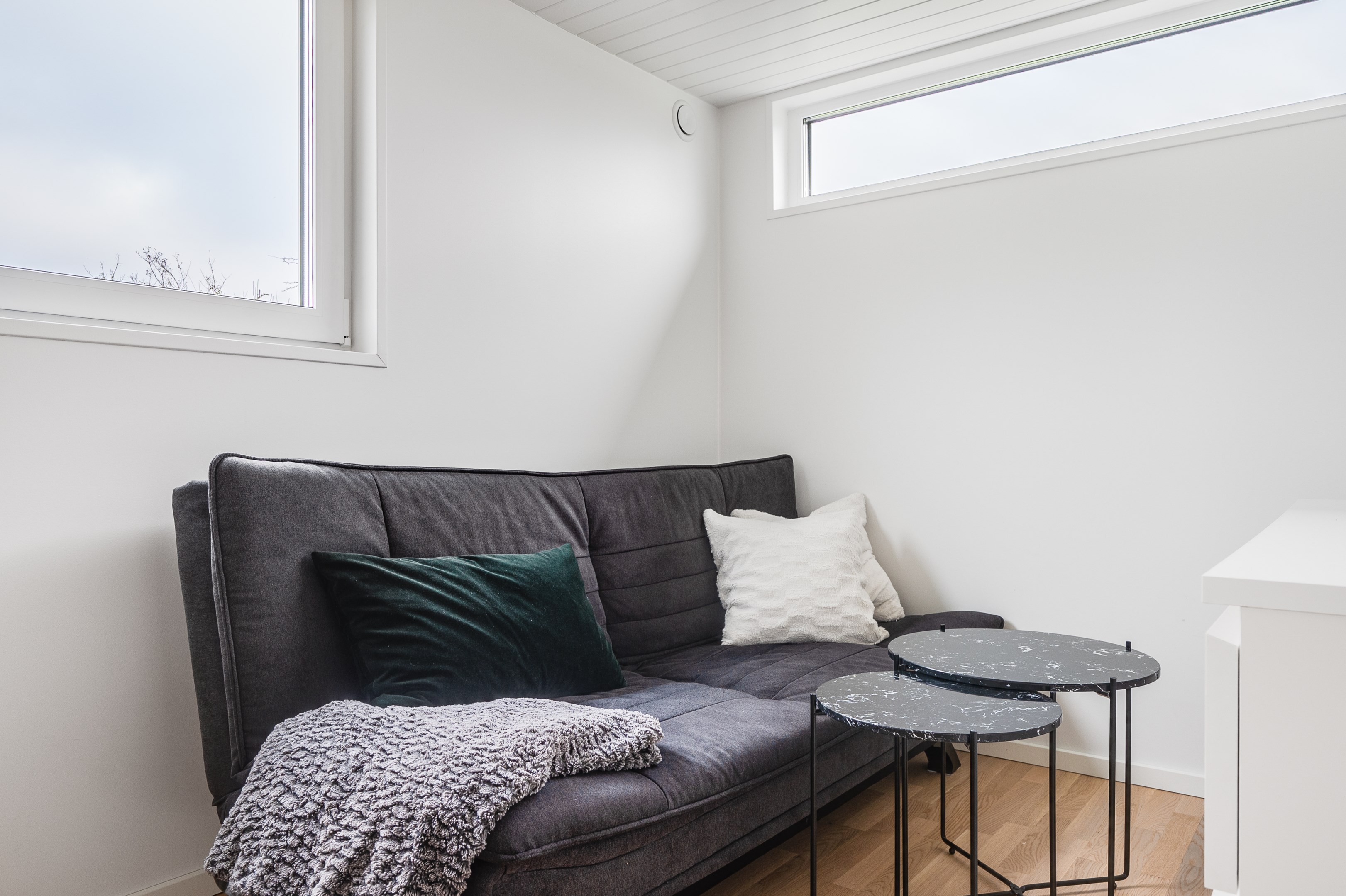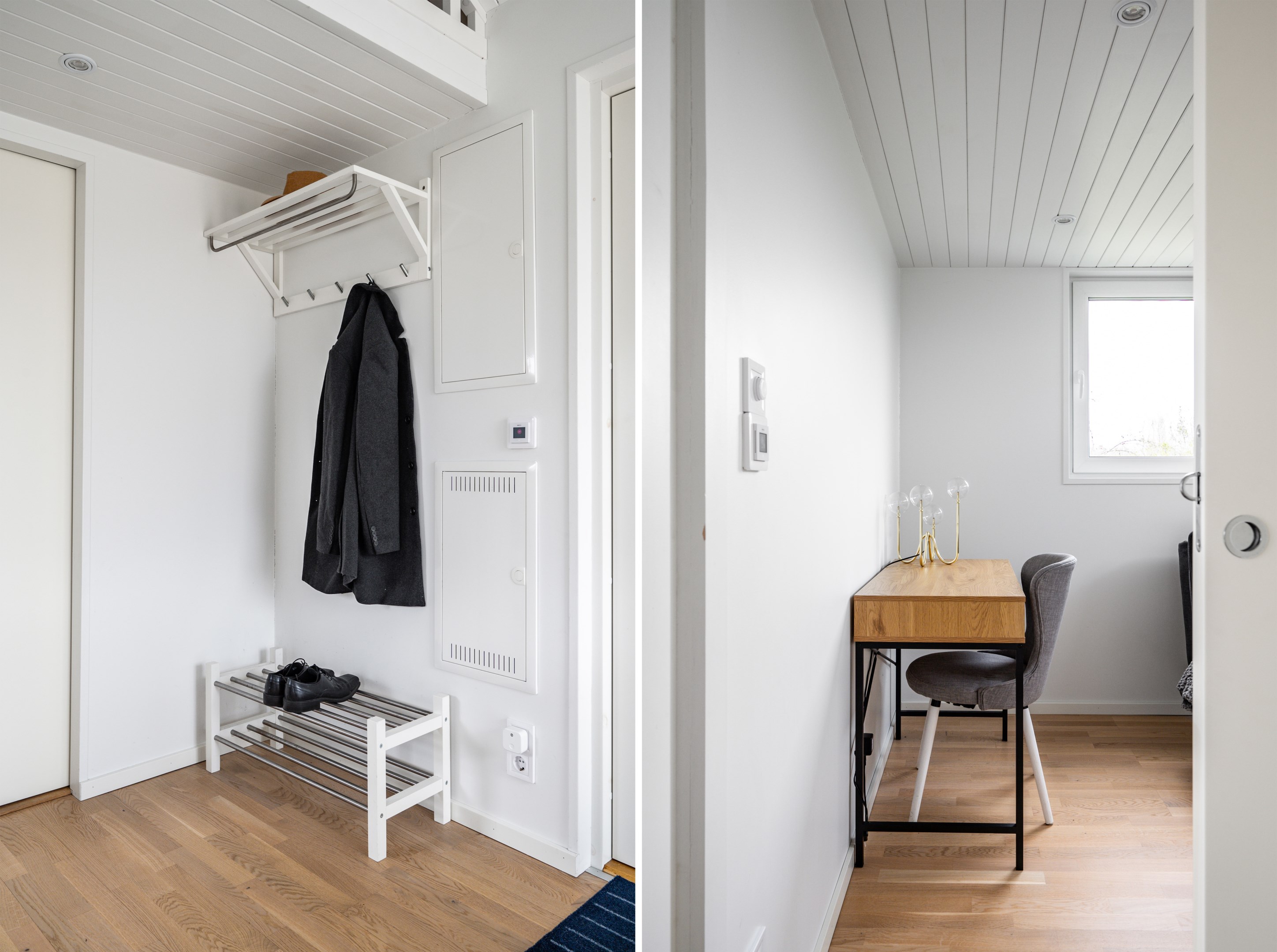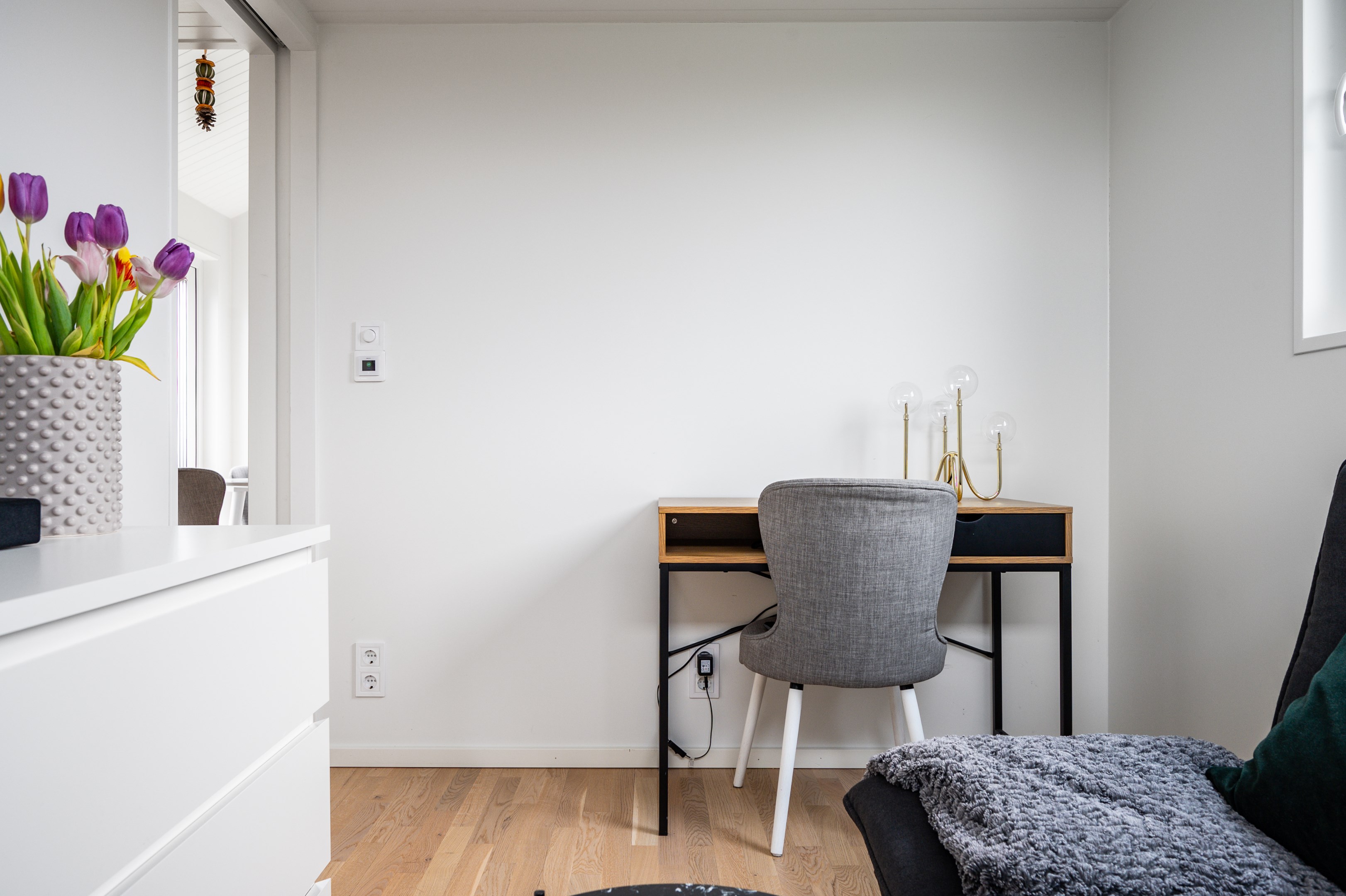Rummet erbjuder en mysig och flexibel yta som kan användas både som TV-rum och sovrum. Här finns gott om plats för en soffa och ett skrivbord, eller alternativt en säng, beroende på dina behov. De vita väggarna och det stilrena laminatgolvet med golvvärme bidrar till en ljus och inbjudande atmosfär.