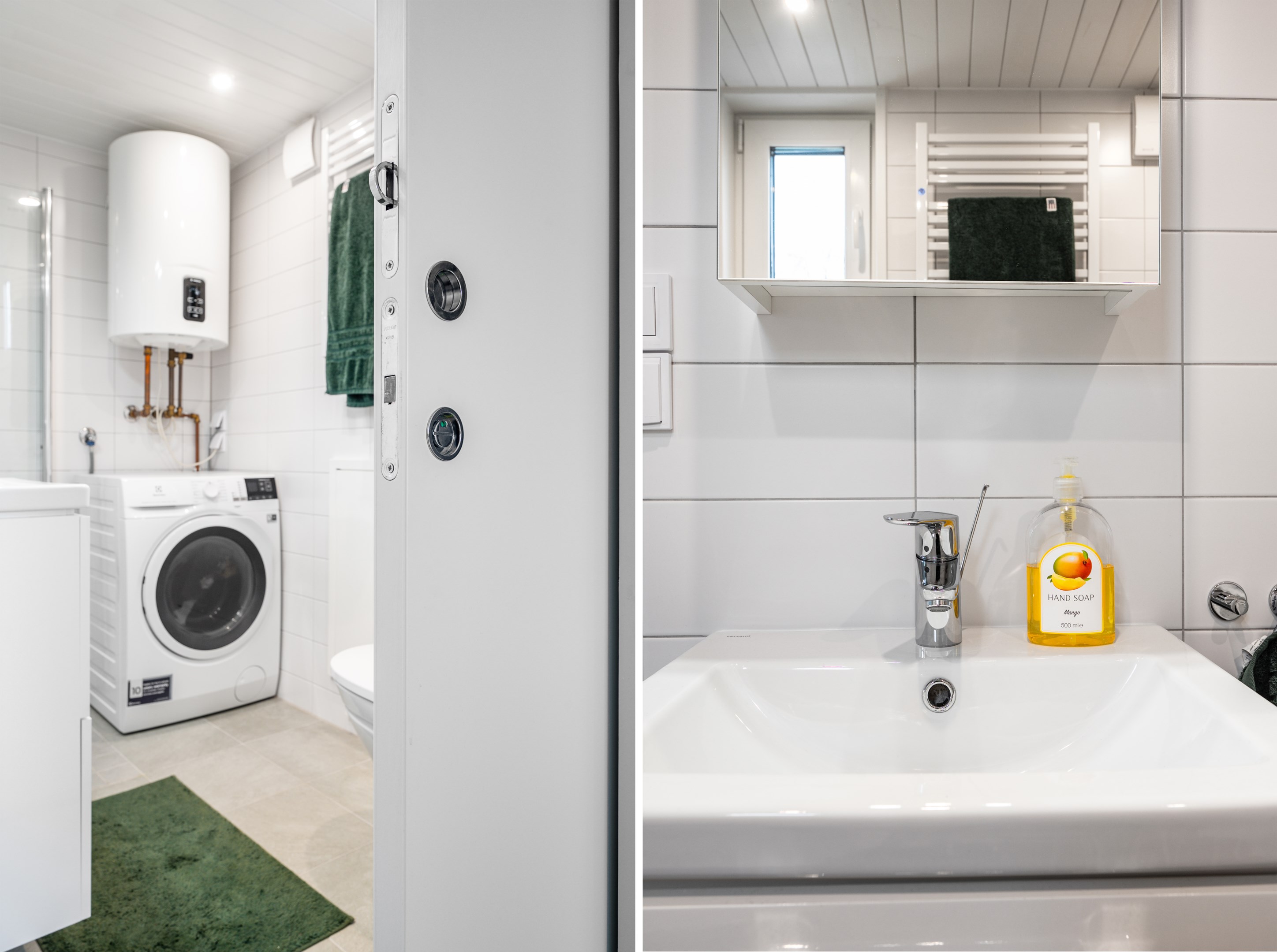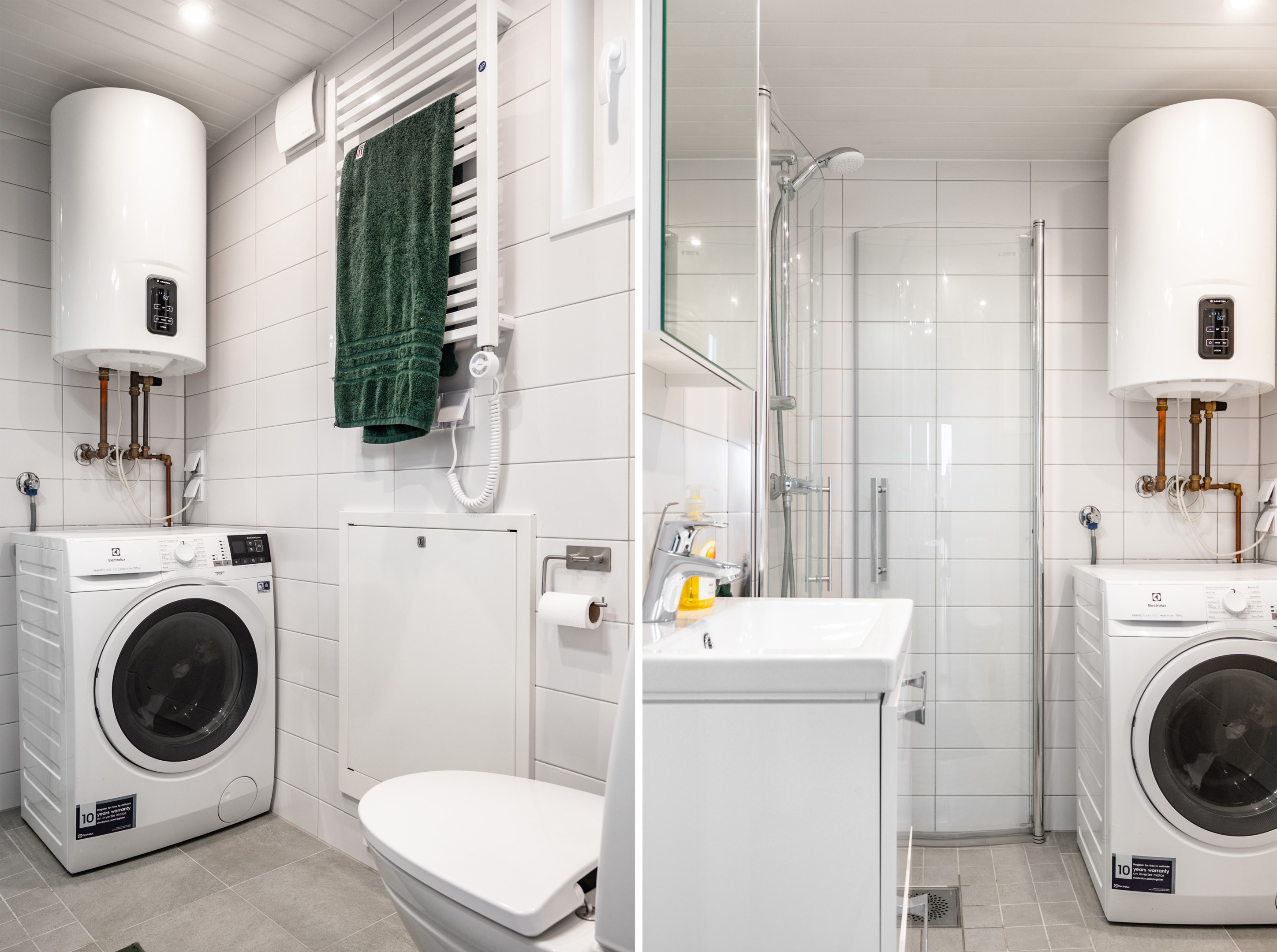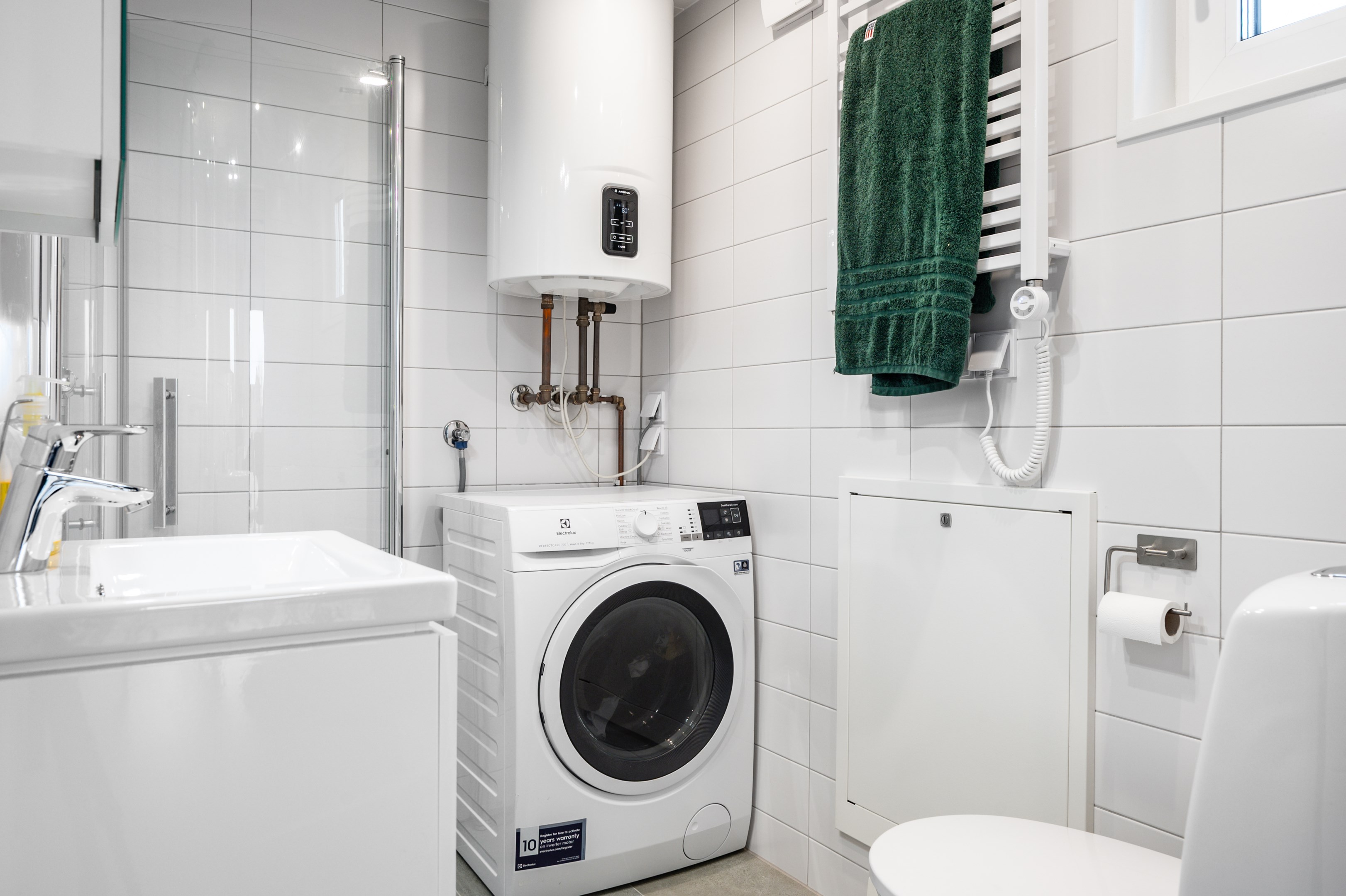 Badrummet är helkaklat med vitt kakel på väggarna och ljusgrått kakel på golvet, vilket ger en modern och fräsch känsla. Här finns dusch med glasdörrar, kommod och spegel. Badrummet är utrustat med WC samt en kombimaskin för tvätt och torkning. Vattenvärmesystemet drivs av el och en stor vattentank, vilket gör detta boende både funktionellt och energieffektivt. De stora fönstren släpper in naturligt ljus och ger badrummet en luftigare och mer öppen känsla.