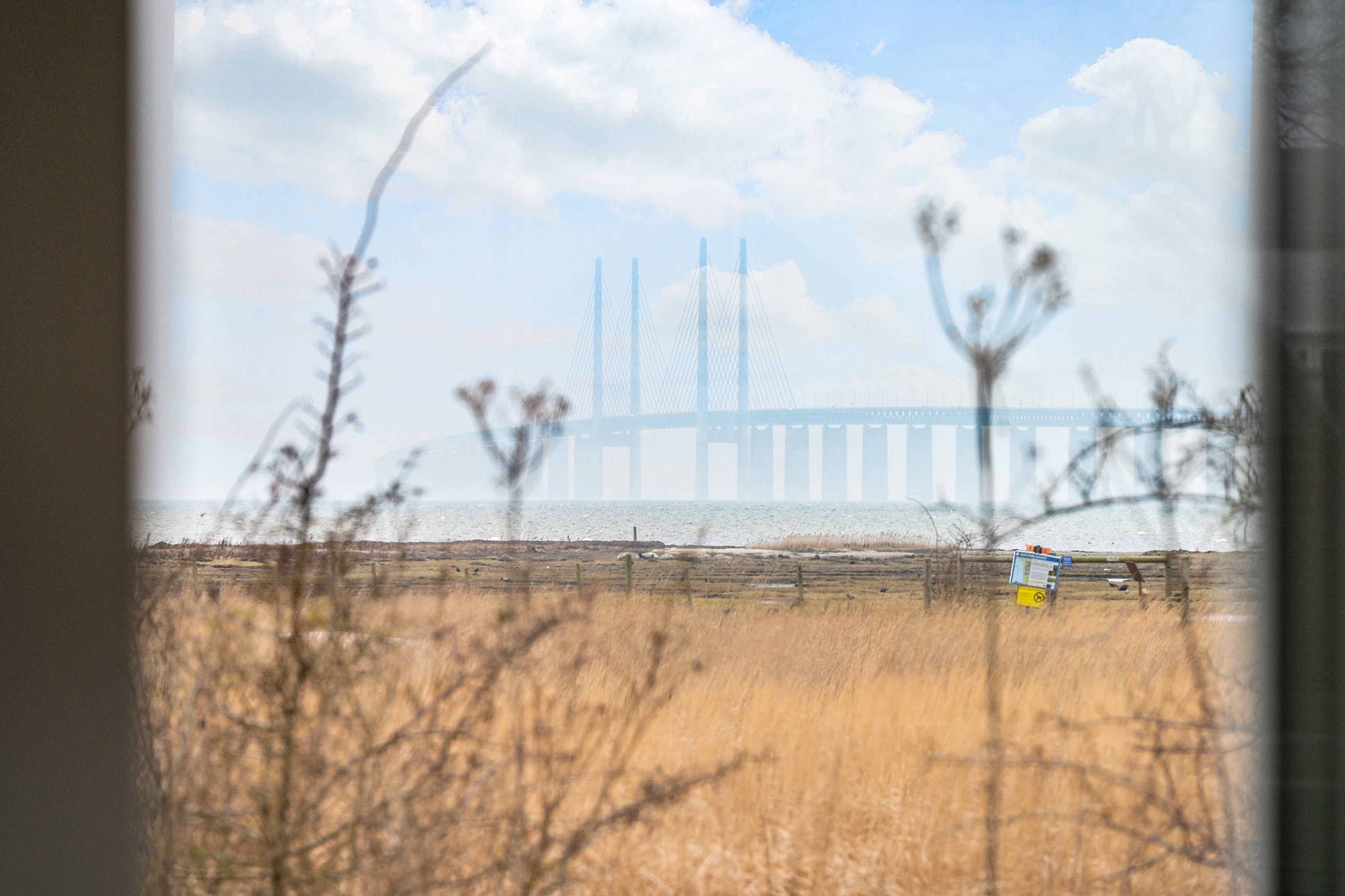 Detta ljusa rum präglas av en imponerande takhöjd på cirka 4 meter, vilket ger en luftig och öppen känsla. De stora fönstren släpper in ett generöst ljus och erbjuder en fantastisk utsikt mot Öresundsbron, samtidigt som du kan njuta av utsikten över tomten och vattnet. En mysig kamin i rummet skapar både värme och en trivsam atmosfär. Här finns gott om plats för både matbord och sittmöbel, vilket gör det till en idealisk plats för både avkoppling och sociala stunder. Rummet har vita väggar och ett stilrent laminatgolv med golvvärme.